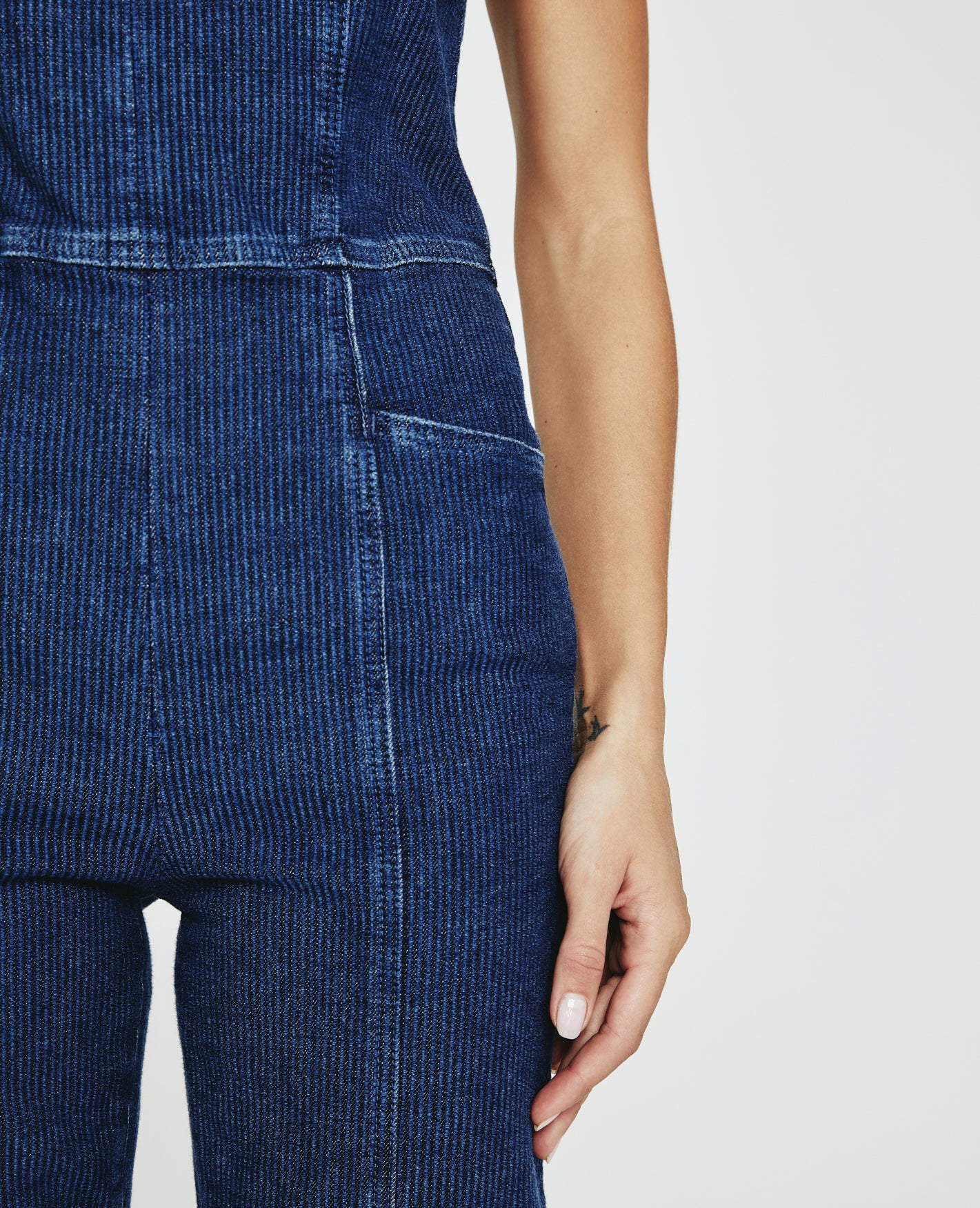 The Calli Jumpsuit for women is a new overall silhouette outfitted with a minimalist bodice and high waist. The jumpsuit features adjustable straps, a center back zipper, and a vintage finish with a blend of feminine perspective. The Calli is designed in an AG-exclusive Indigo Ridgeline, a midweight yard-dyed denim corduory detailed with an understated indigo stripe for workwear inspired character.