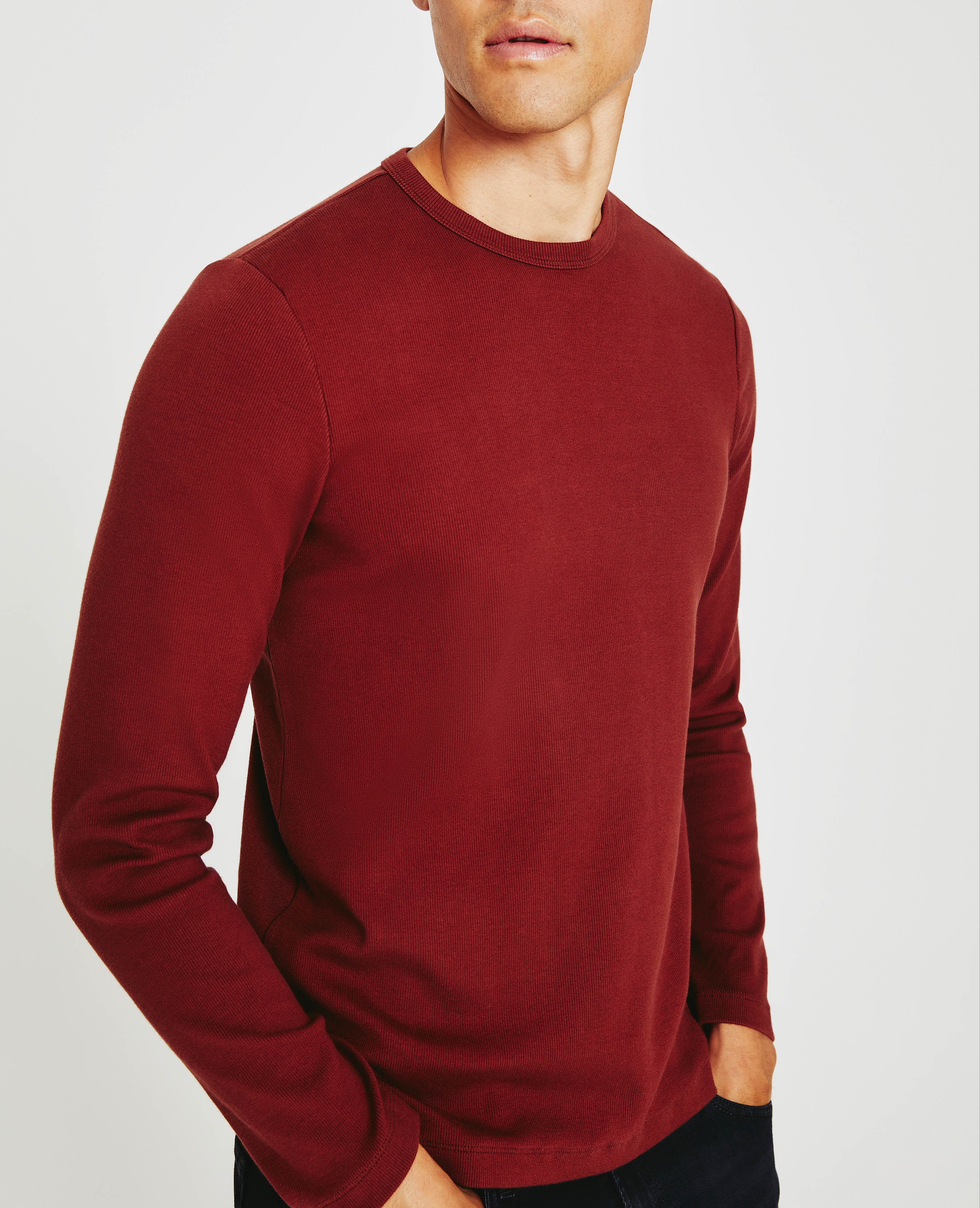 The Canon Long Sleeve Crew features a heavy, thermal-like fabrication. Designed with warmth and stretch in mind, this cold-weather essential features a slim fit, long sleeves, and self-crew neckband. This shirt is designed in a luxurious cotton blend with a red hue.