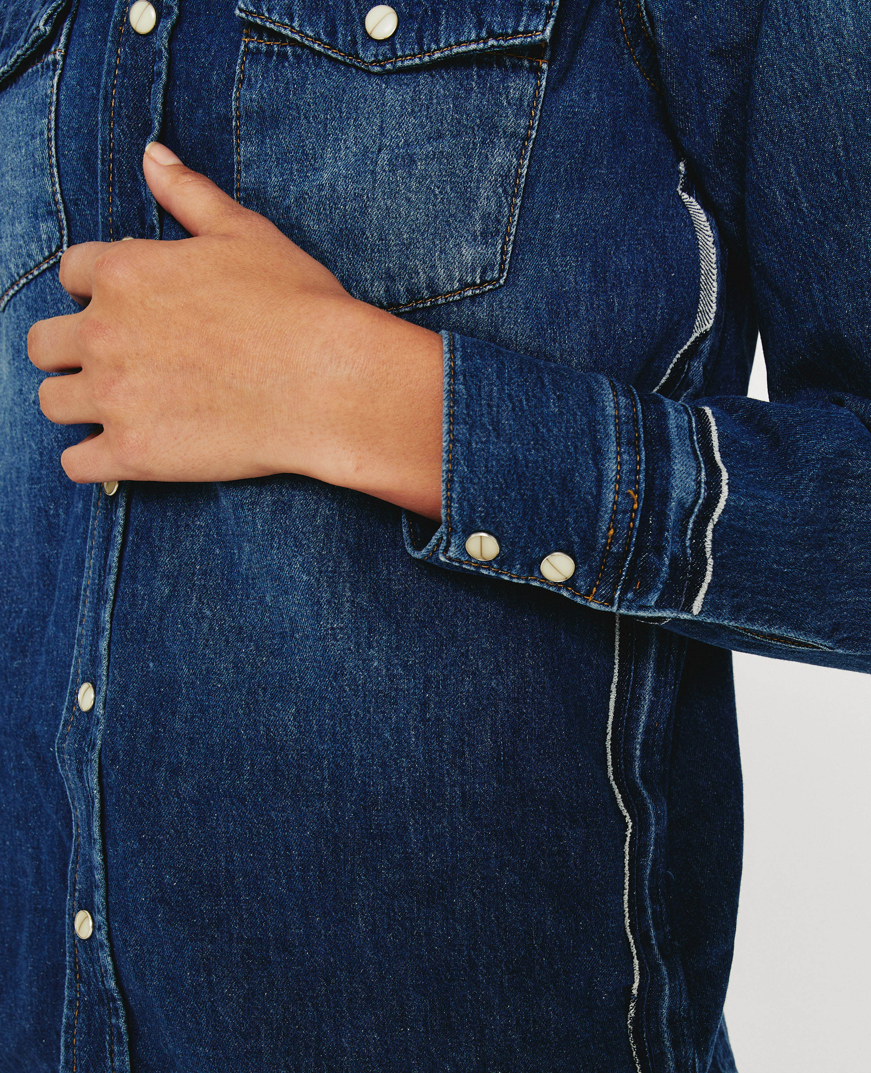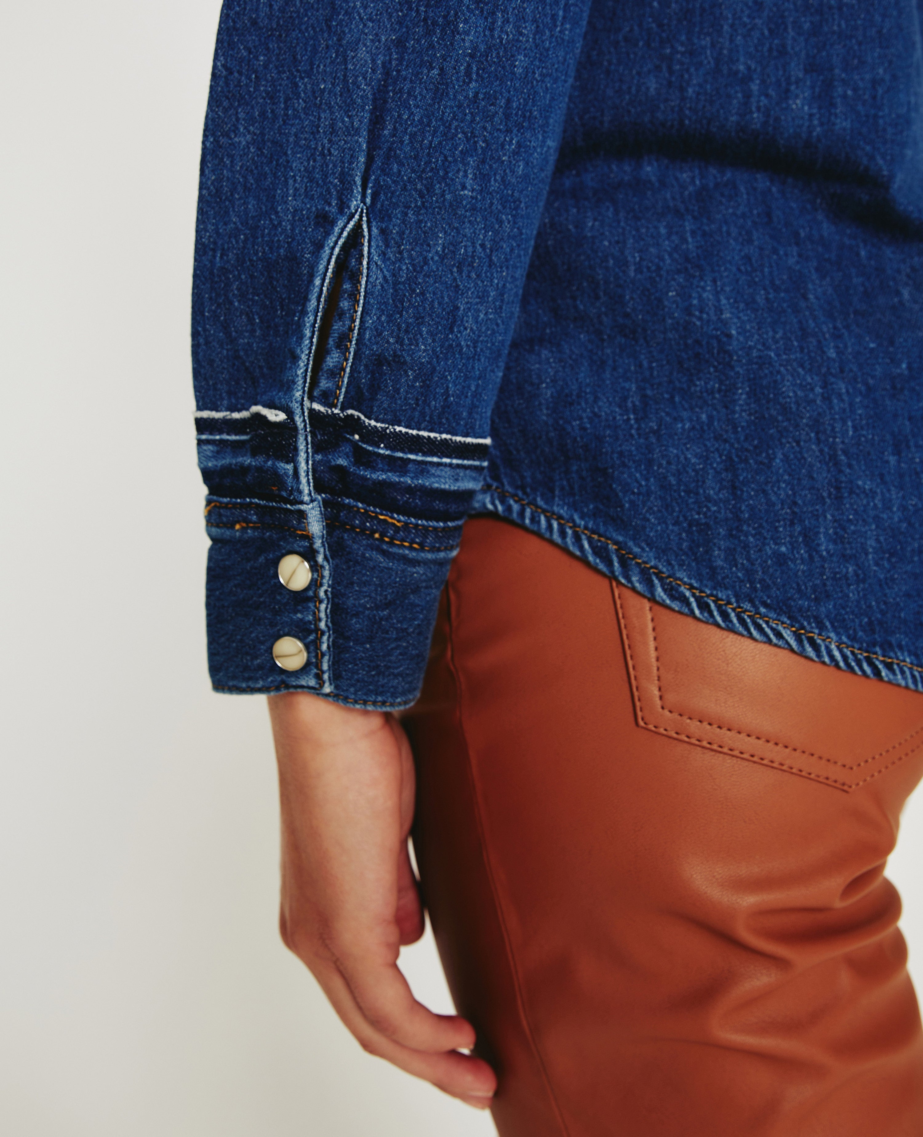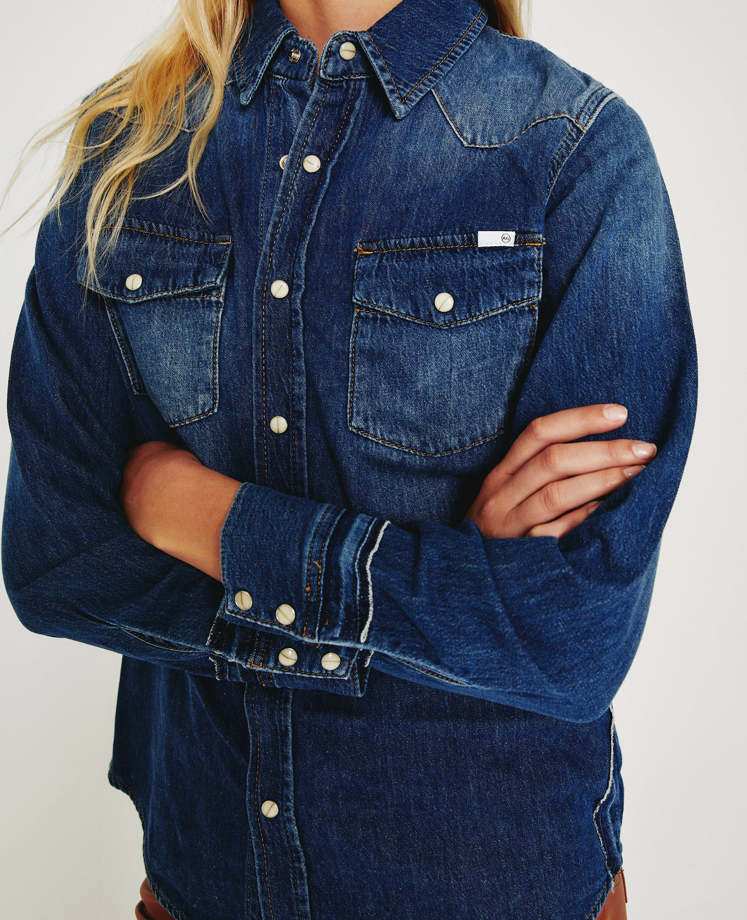 The Dakotah Shirt offers a deconstructed take on the western shirt, designed with released detailing at the cuffs and side seams. The women's long-sleeve western shirt is made from 7.25 oz. Boundless Lightweight Indigo chambray in a faded medium blue wash. It's got all the classic details, including a pointed collar, peaked yoke, and flap pockets at the chest. Pearl snaps down the front complete the look.