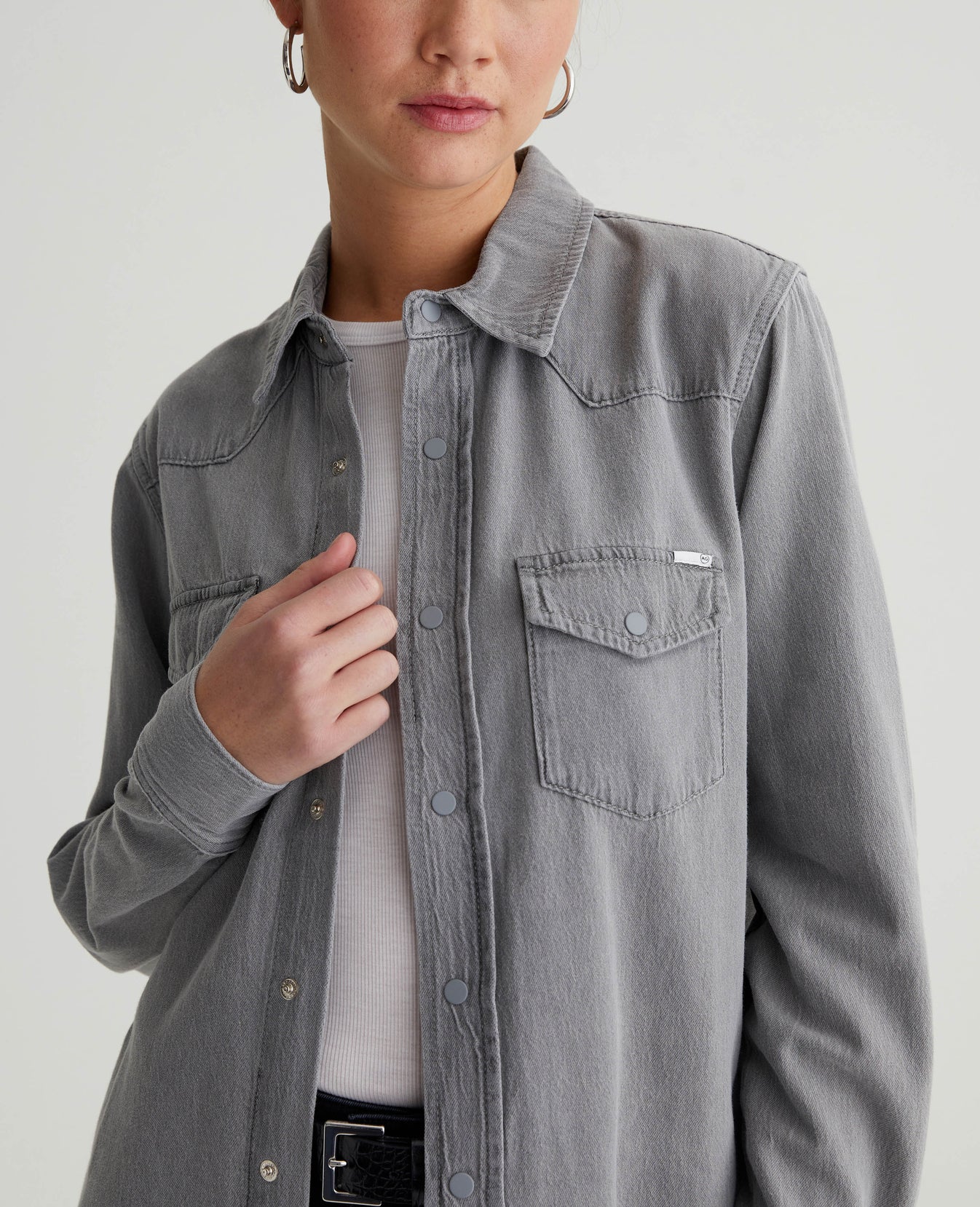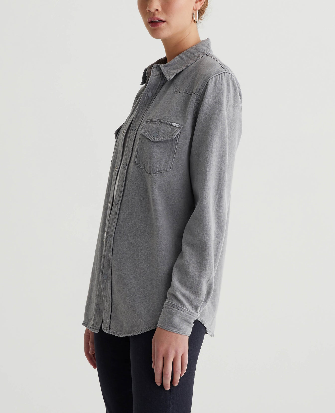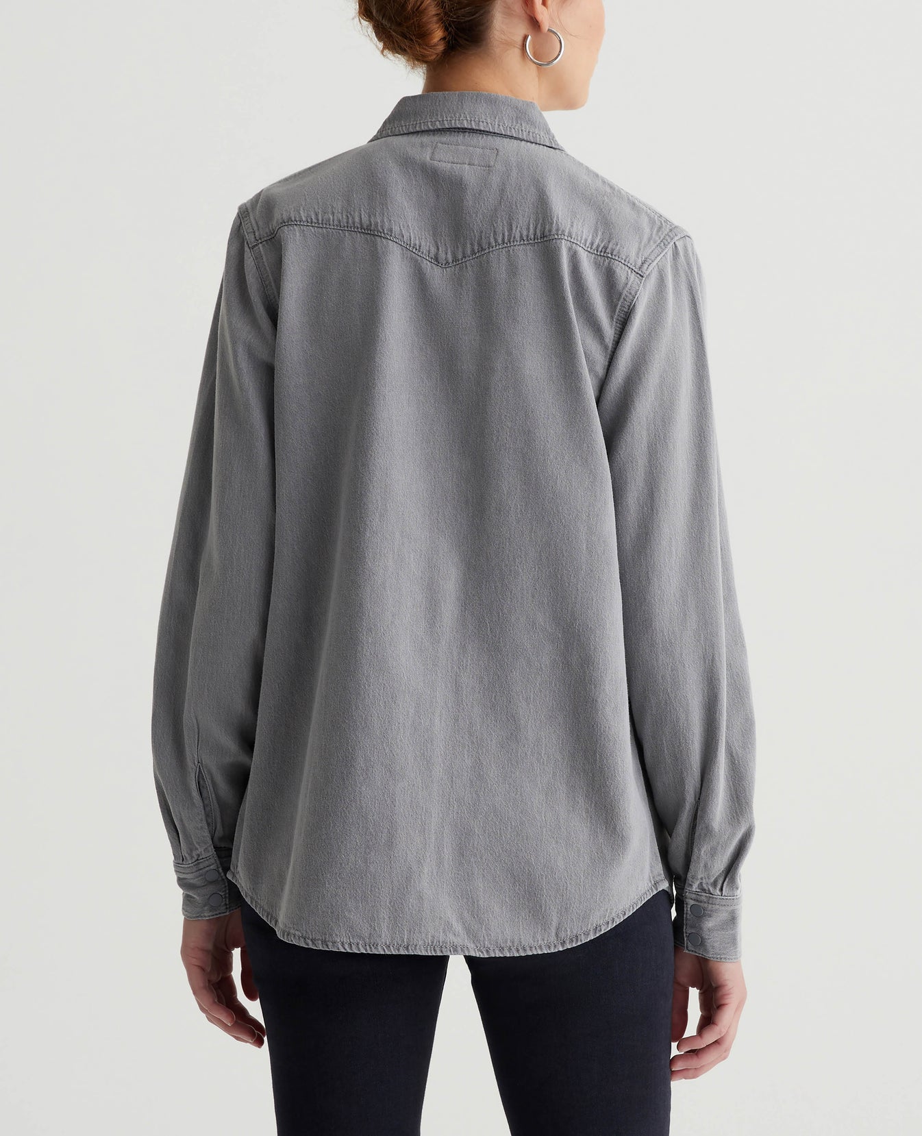 The Dakotah Shirt is a long-sleeve button-up style with a relaxed fit and classic western detailing—a pointed collar, peaked yoke styling, and flap pockets at the chest. Cut from Boundless Lightweight chambray in 100% cotton, it's got a pale grey shade and tonal snaps for a clean, contemporary feel.