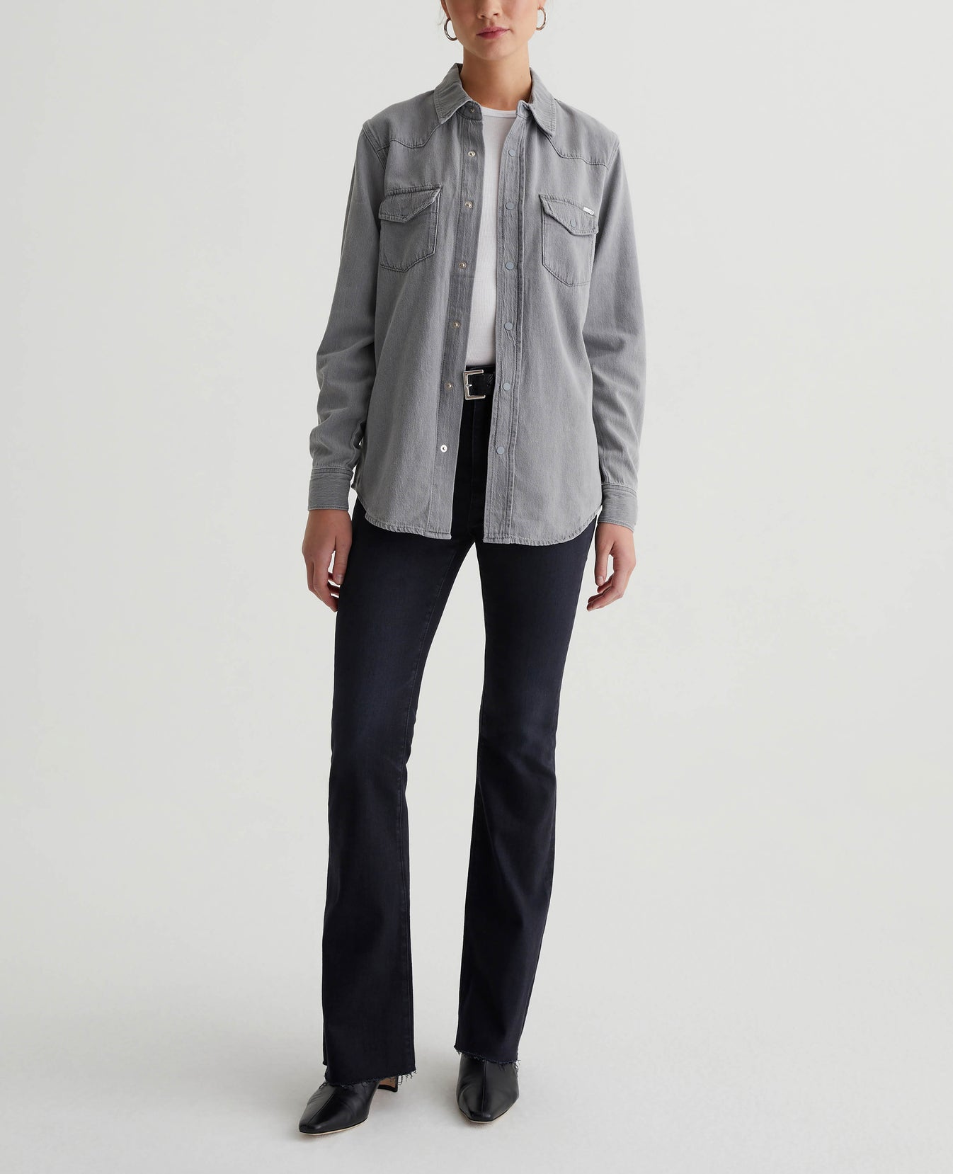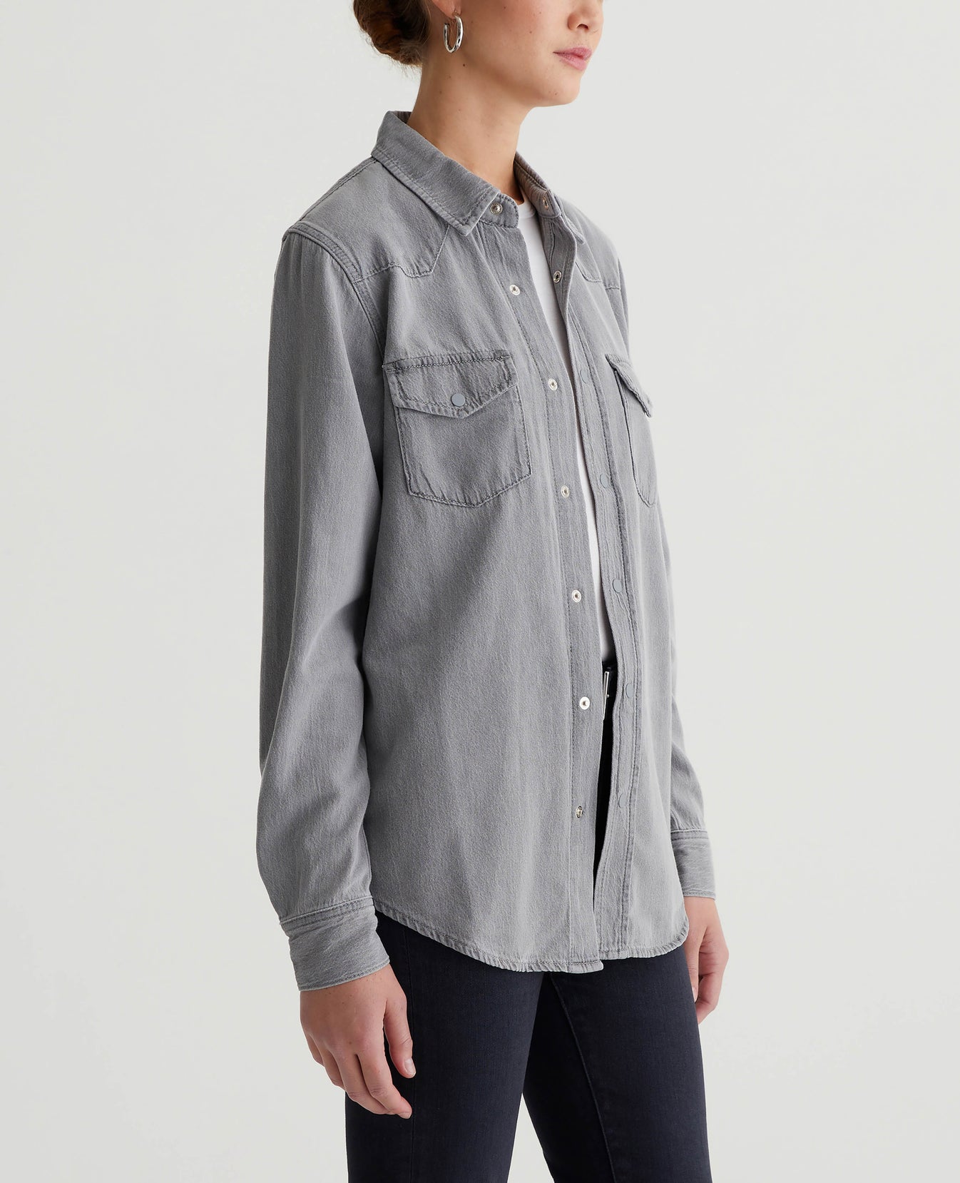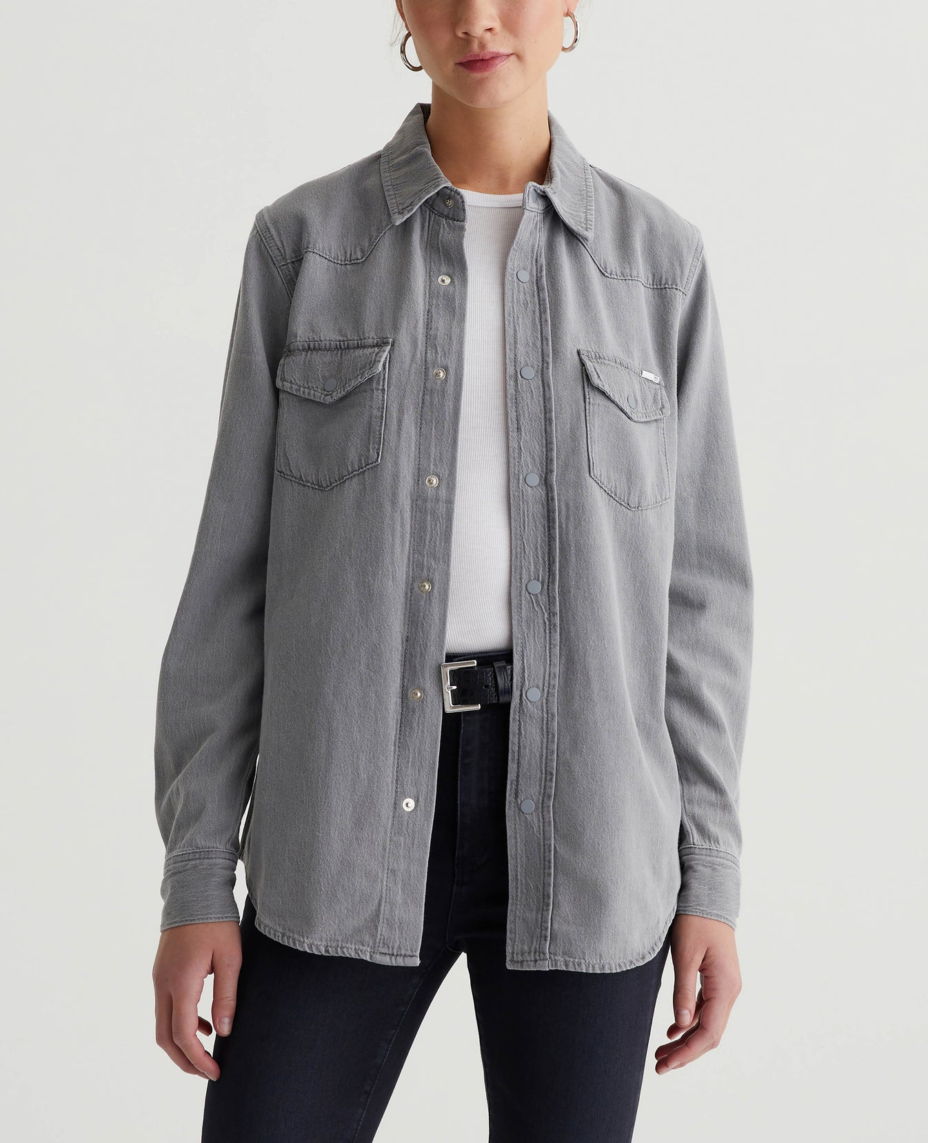 The Dakotah Shirt is a long-sleeve button-up style with a relaxed fit and classic western detailing—a pointed collar, peaked yoke styling, and flap pockets at the chest. Cut from Boundless Lightweight chambray in 100% cotton, it's got a pale grey shade and tonal snaps for a clean, contemporary feel.