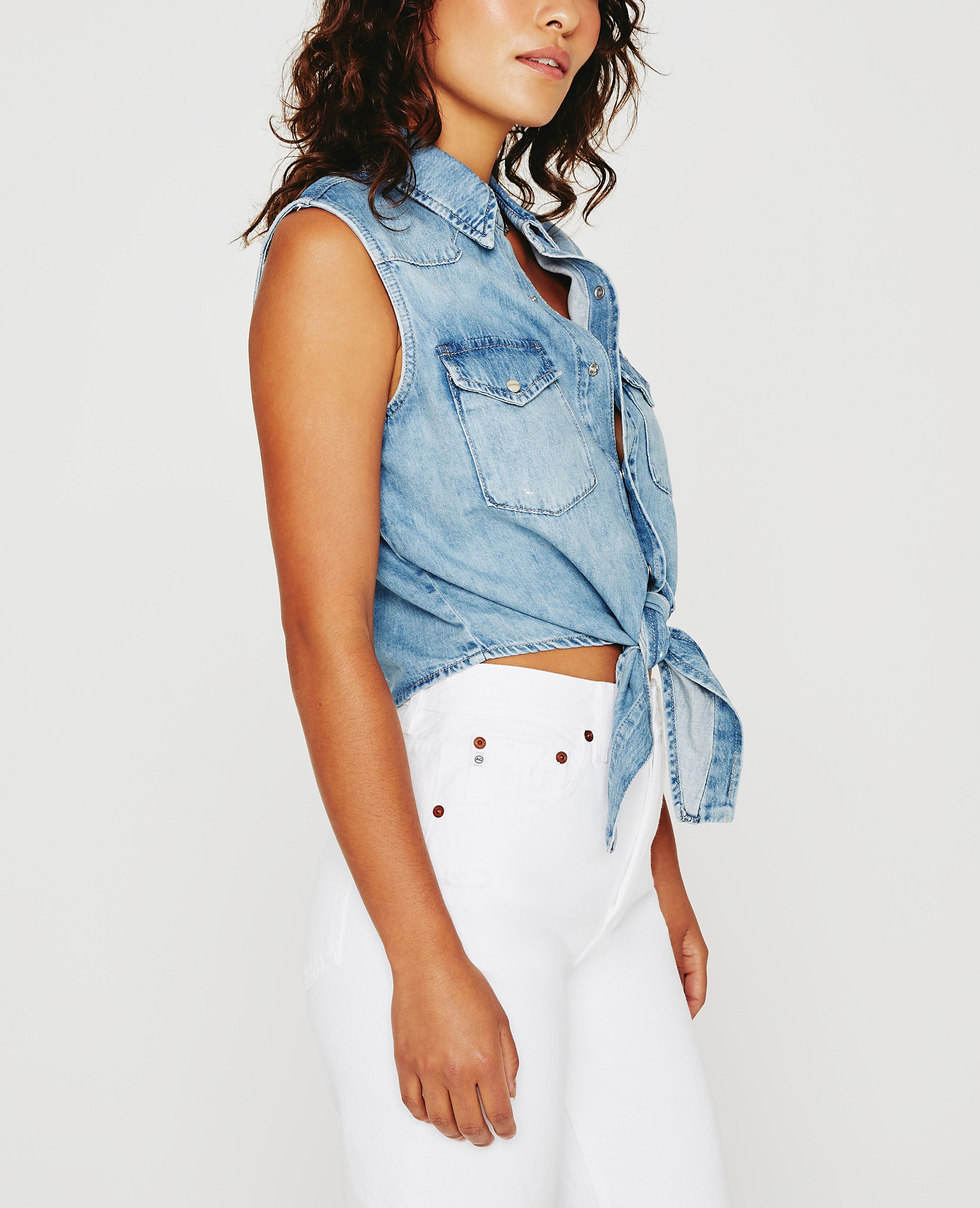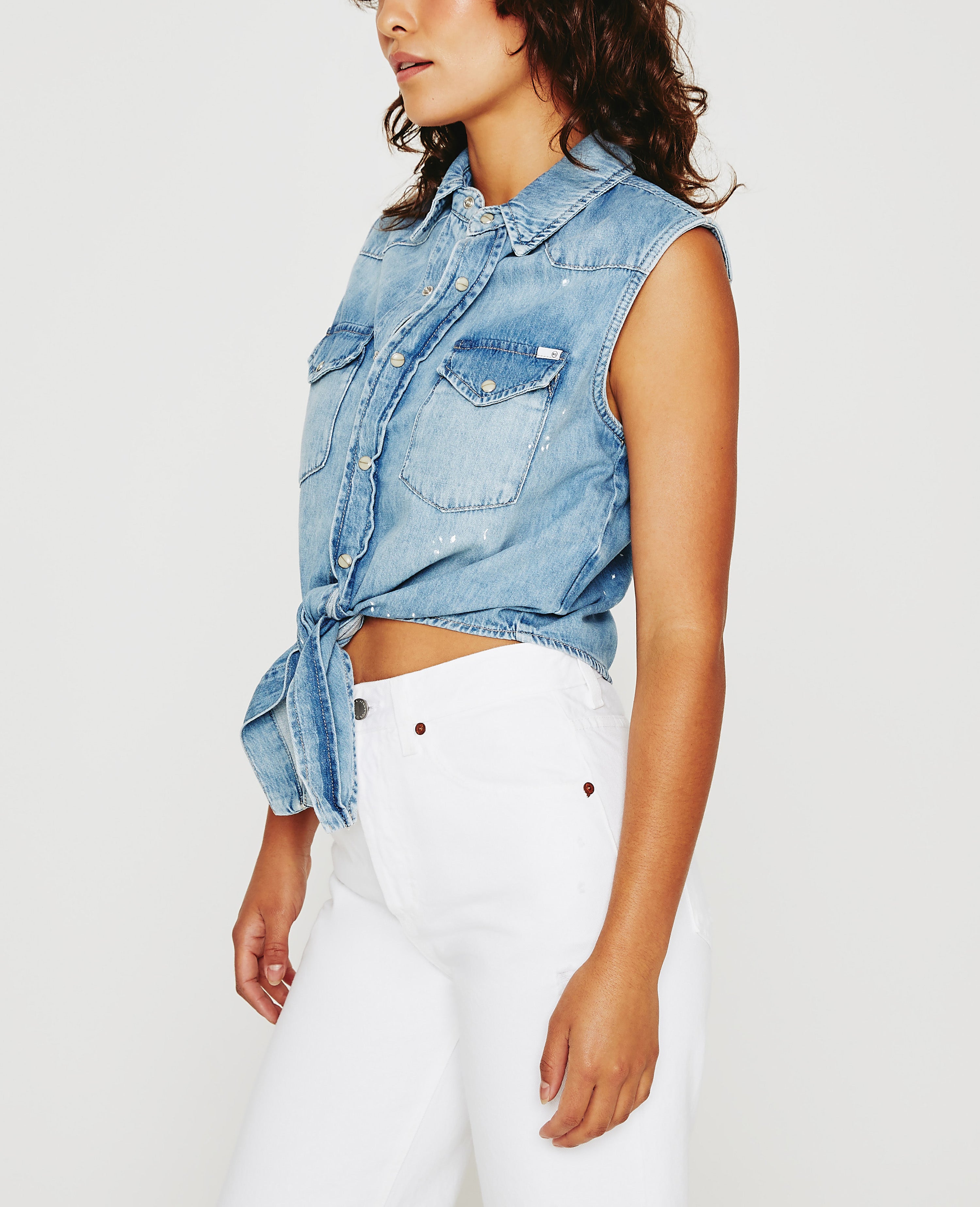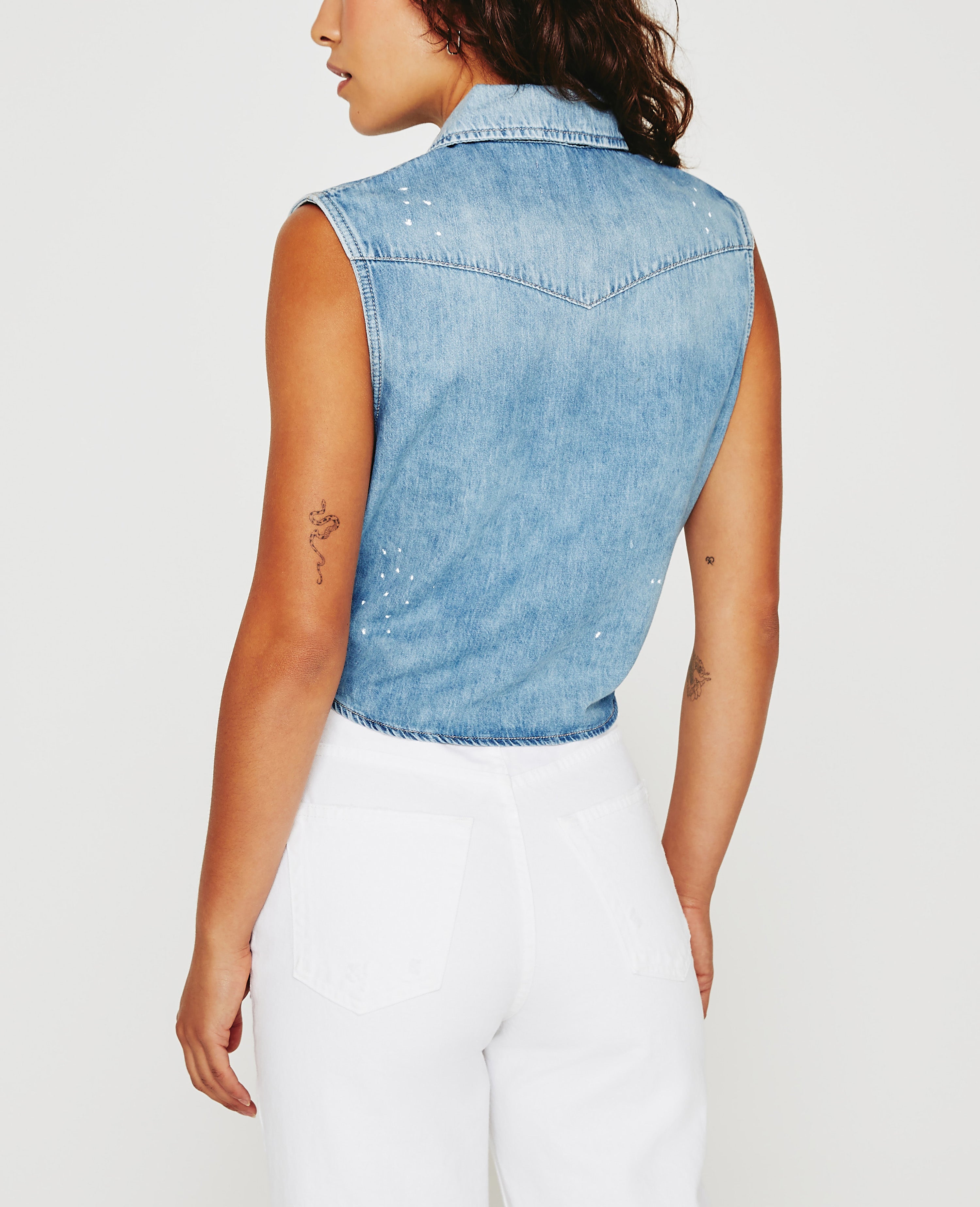 The Dakotah Tie top is a sleeveless version of the vintage western shirt, updated with a tie front. It's crafted from 7.25 oz. Boundless Lightweight Indigo chambray in 100% cotton and features a faded medium wash with a faded finish and subtle bleach flecks. All the classic western details are there—pointed collar, peaked yoke, and flap pockets at the chest. Pearl snaps down the front add the perfect finish.