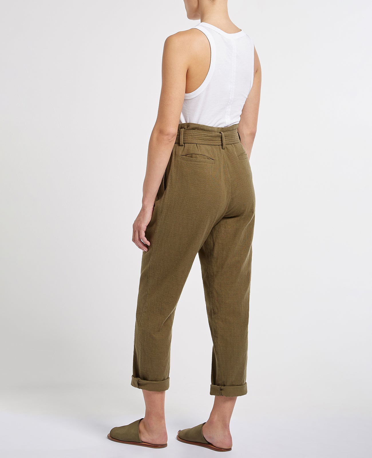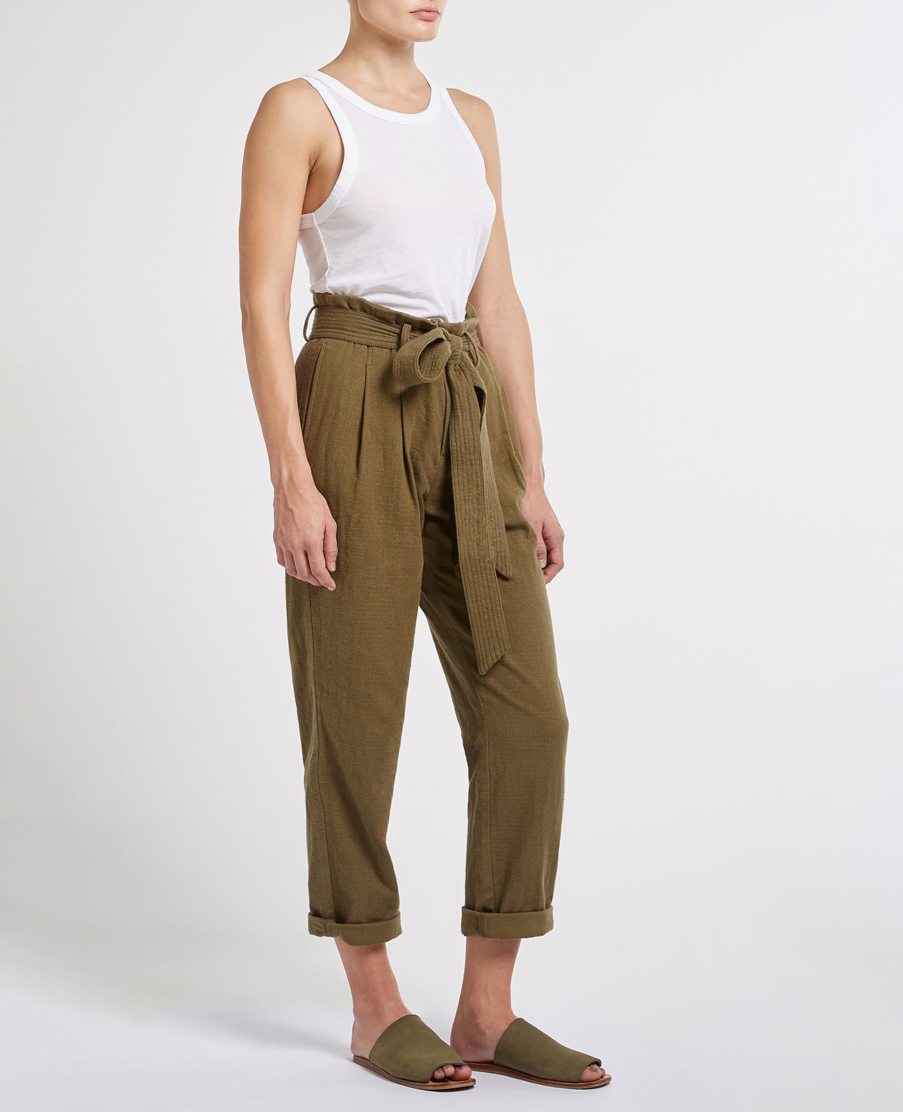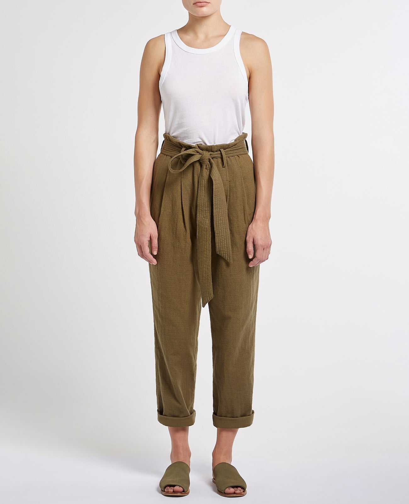 The Darena is a ultra high waisted pant that cinches with a self tie, relaxed hip, and a cropped leg opening. The double face loose weave construction gives this pant a dobby texture.