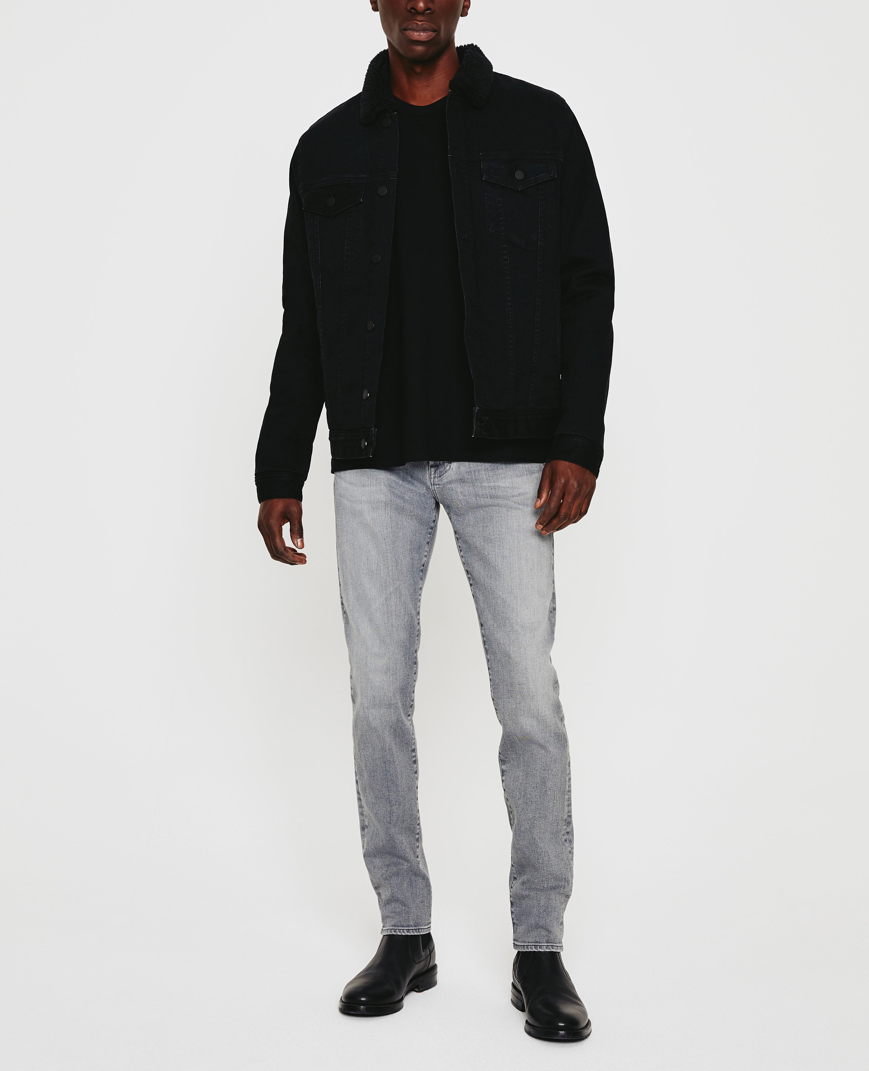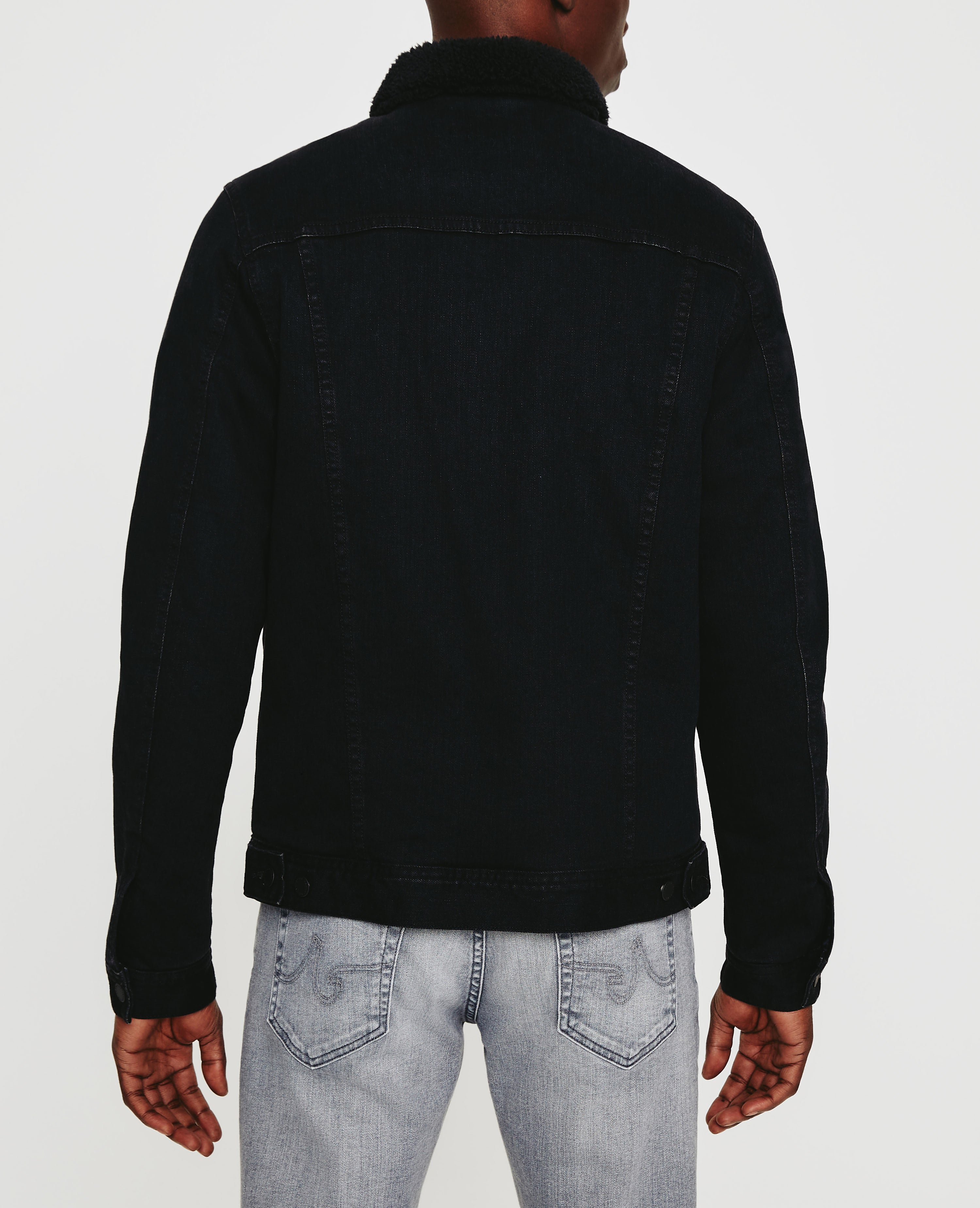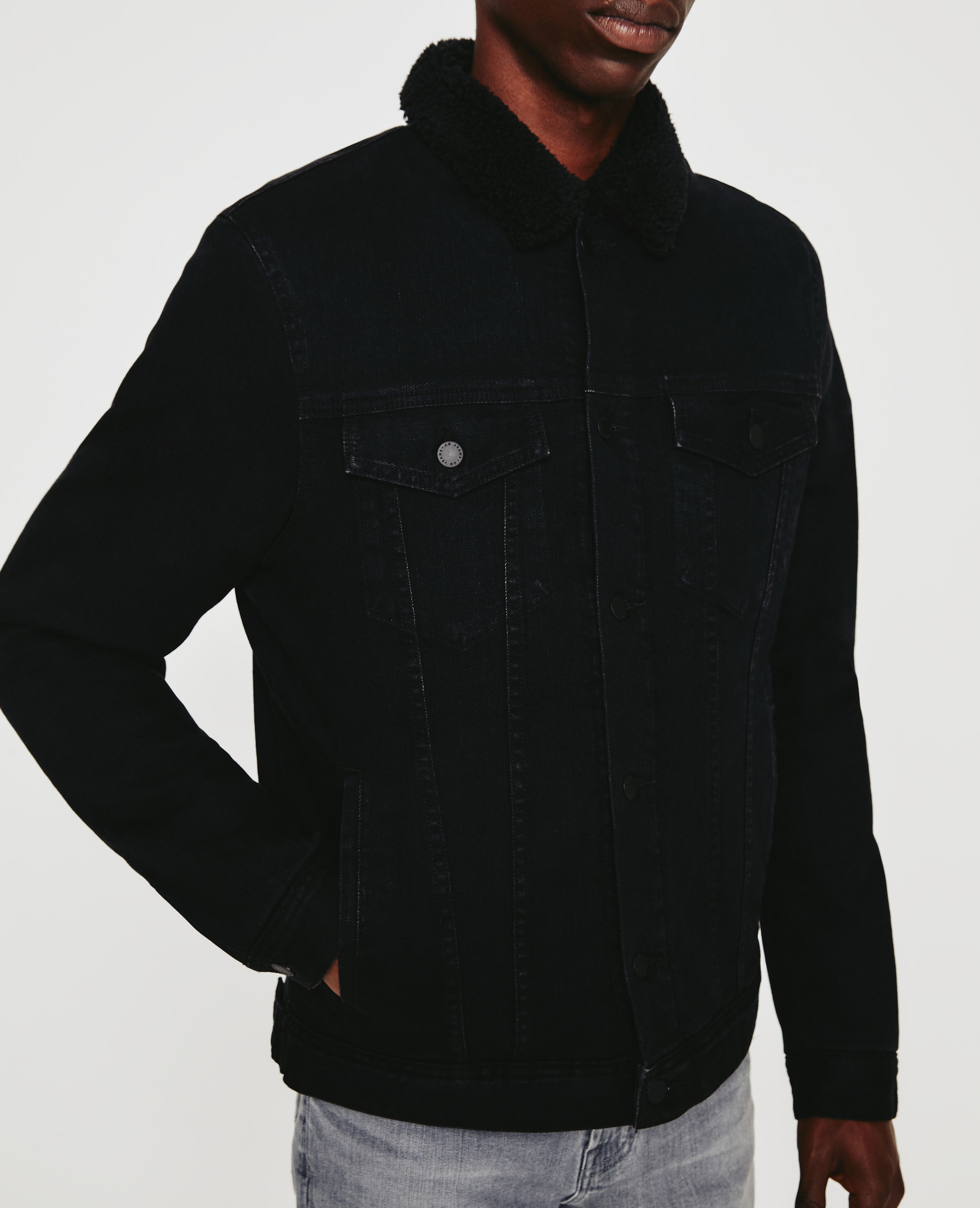 The Dart Jacket is a contemporary cool-weather update to our classic jean jacket for men. Crafted from 11 oz. Black Lead Denim in a two-year vintage finish, it offers extra warmth thanks to quilted batting in the sleeves and a black sherpa collar. Flap pockets round out the classic trucker styling, complete with soft-touch matte shank buttons made from 100% recycled materials.