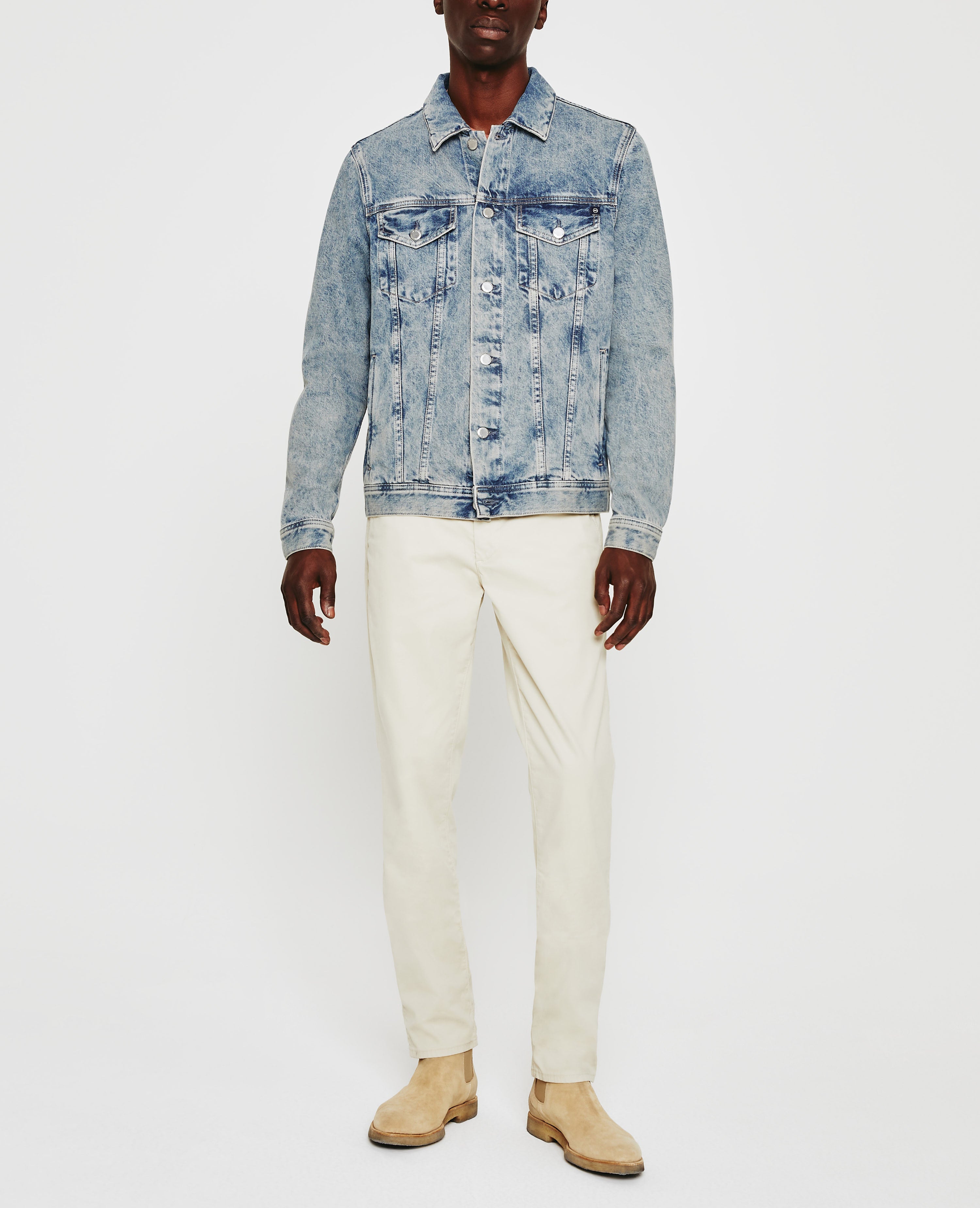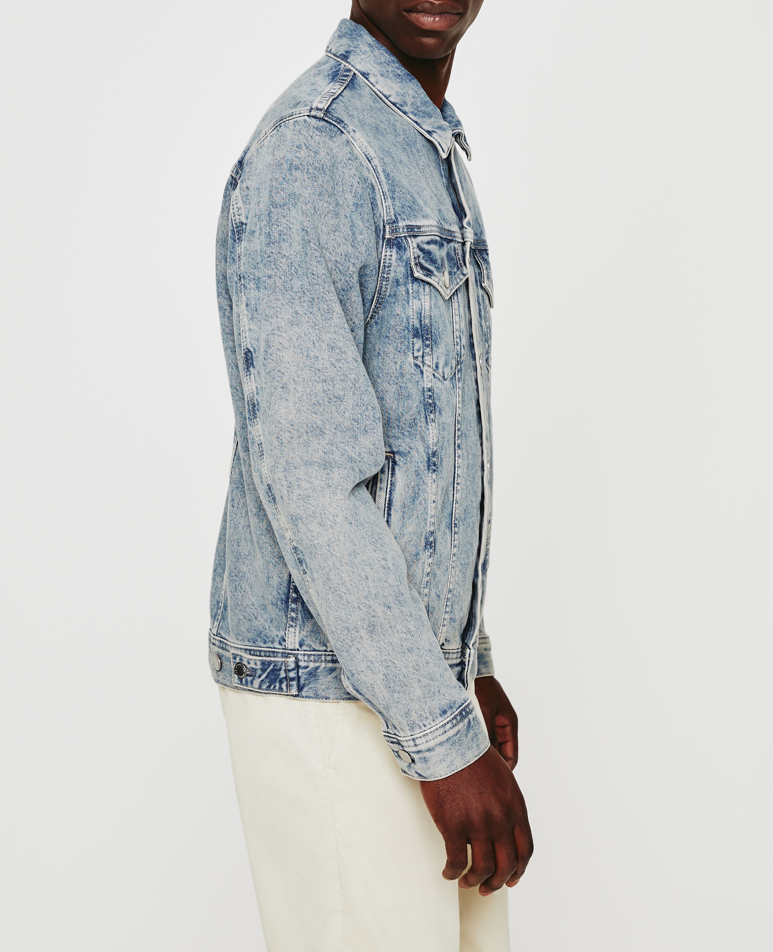 The Dart Jacket is a classic jean jacket for men, updated in a light acid wash with lots of highs and lows for a textured look. Accented with flap pockets and shank buttons, this men's denim trucker jacket comes in Hale Rigid Denim crafted from 100% cotton.