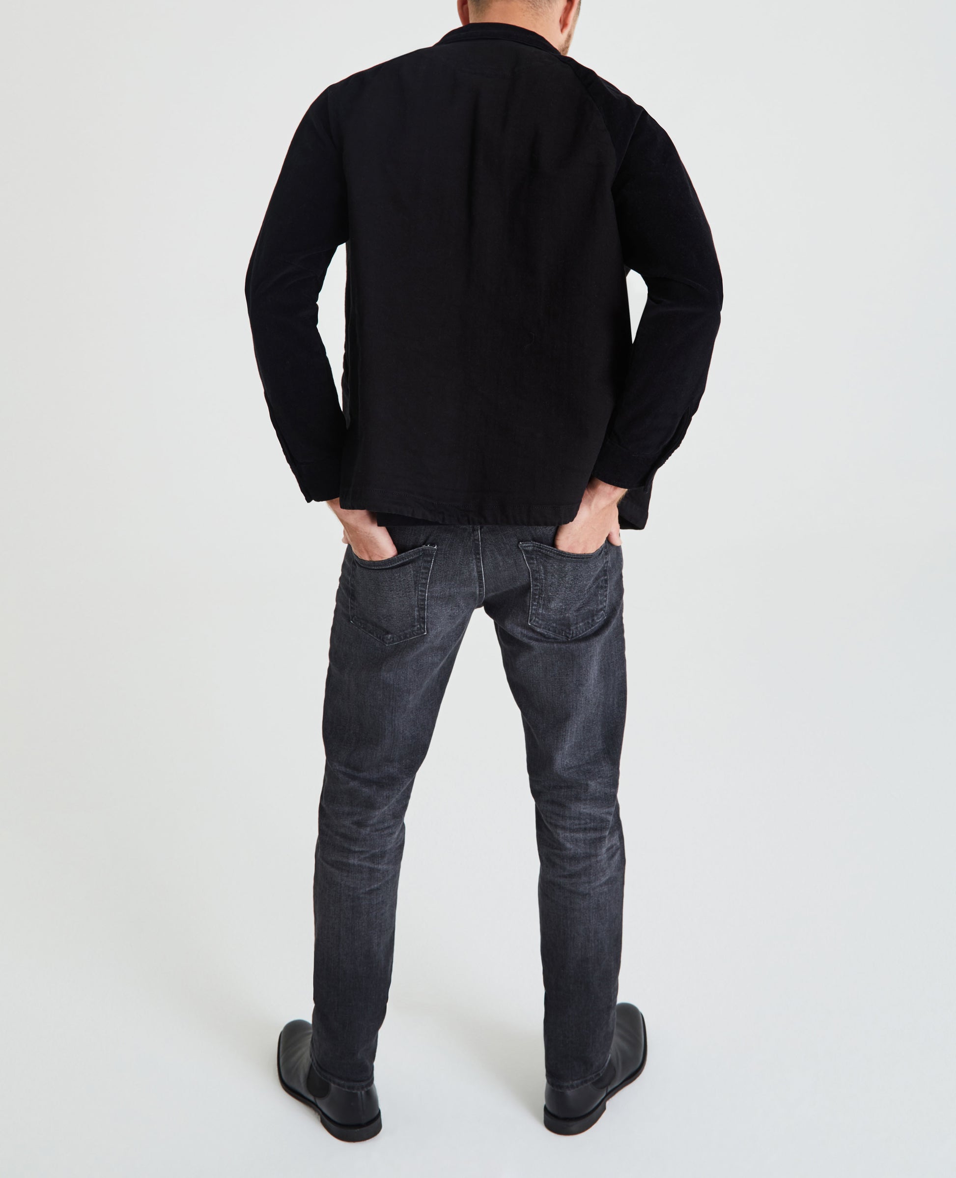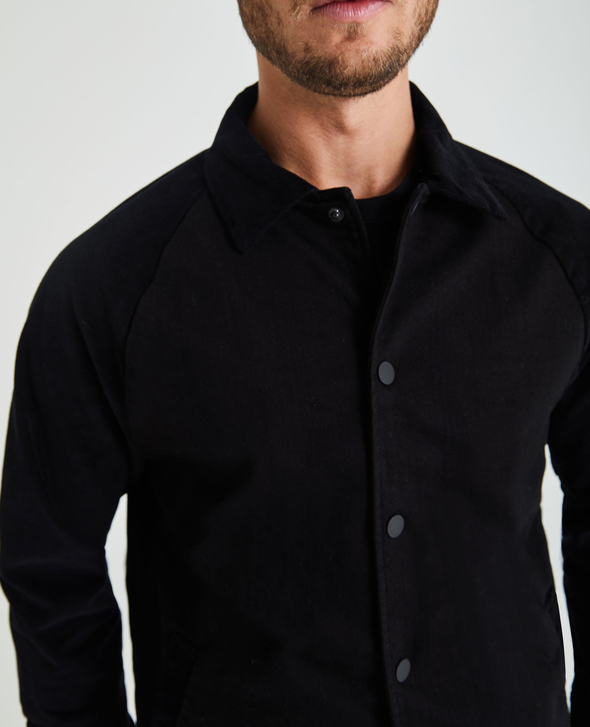 The Deck Coach Jacket is a jean jacket for men featuring a true black hue, relaxed silhouette, standard collar, raglan corduroy sleeves, single chest pocket, tonal snap button closure, and adjustable drawcord at the waist. This men's denim jacket is designed in a 10 oz. Japanese comfort stretch denim, offering a classic and structured feel with comfortable wear.