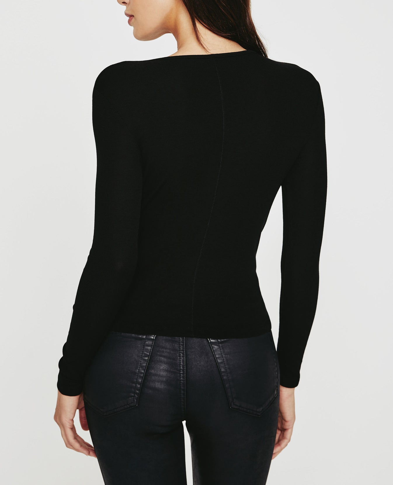 Our Diane L/S V-Neck Wrap offers the illusion of a wrap-around garment, complete with a single stitch down the back and a deep V neckline. Our in-house looms deliver the precision knitting needed to accomplish the characteristic 2x1 weave that lends to the fabric’s superior comfort and draping qualities. Designed in a premium black spandex and 2x1 Lyocell Rib fabrication.