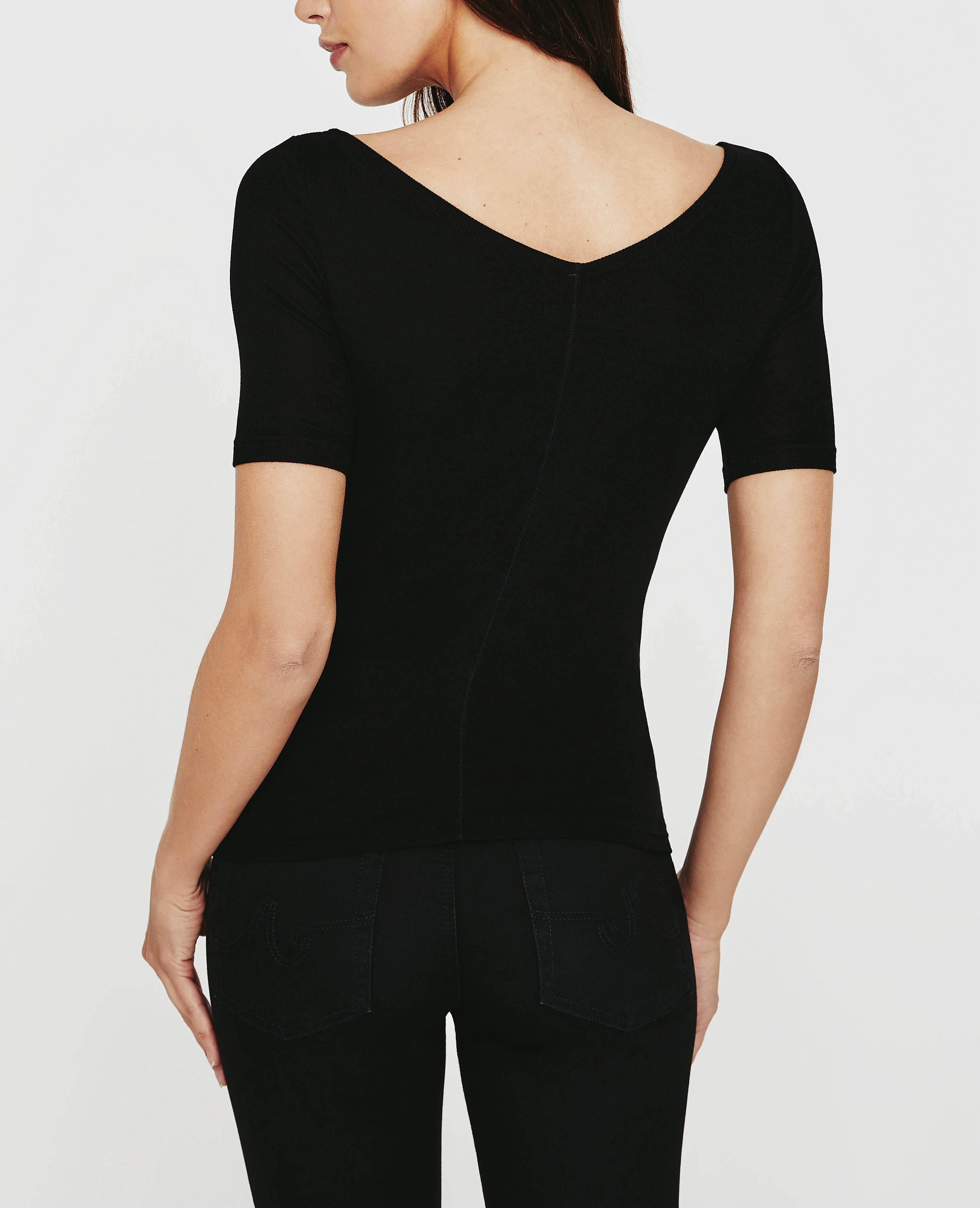 The classic crew neck tee evolves into something modest and bold in our Didion Ballet Neck Tee. Complete with elbow sleeves, this tee offers a feminine option for your traditional S/S tee. We gave particular attention to the small details such as the open neckline and beautiful back V opening. Our in-house looms deliver the precision knitting needed to accomplish the characteristic 2x1 weave that lends to the fabric’s superior comfort and draping qualities. Designed in a premium black spandex and 2x1 Lyocell Rib fabrication.