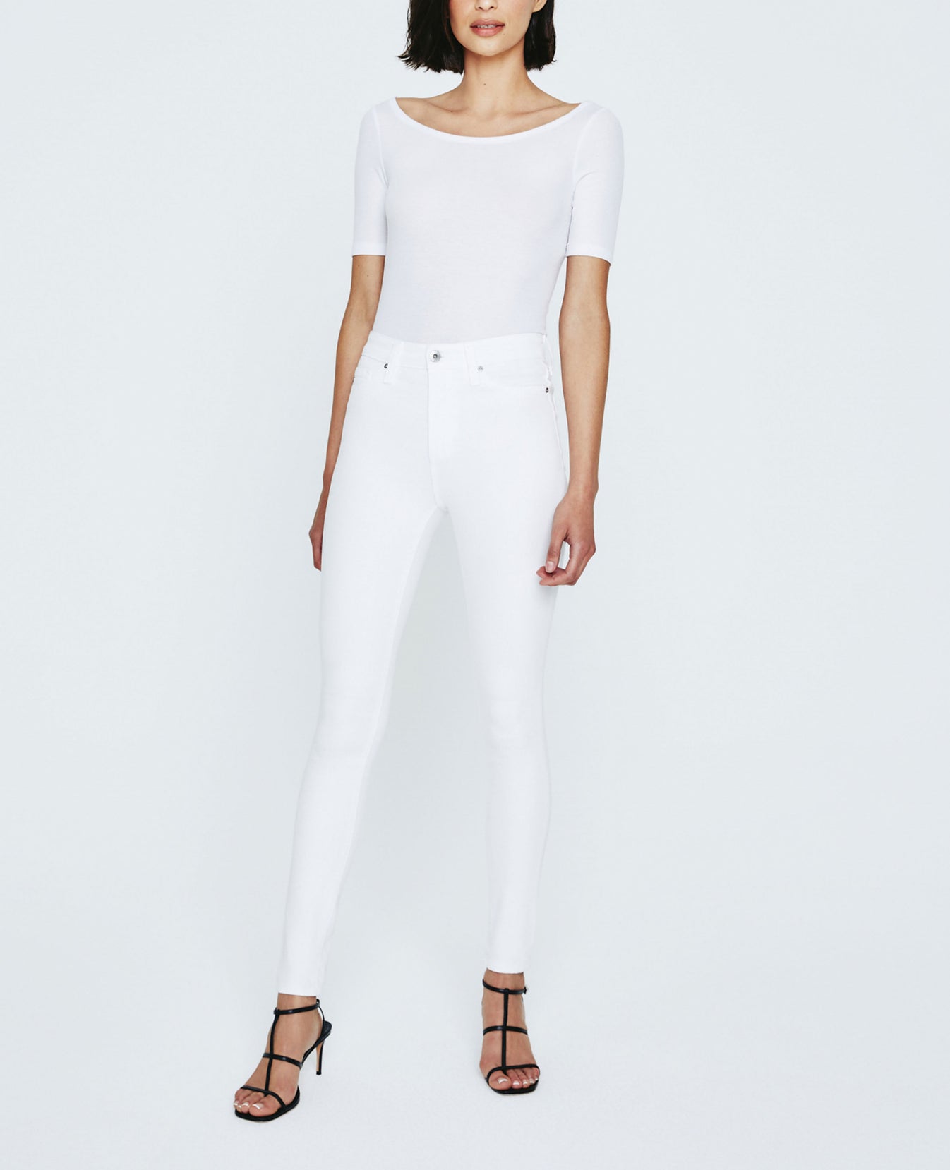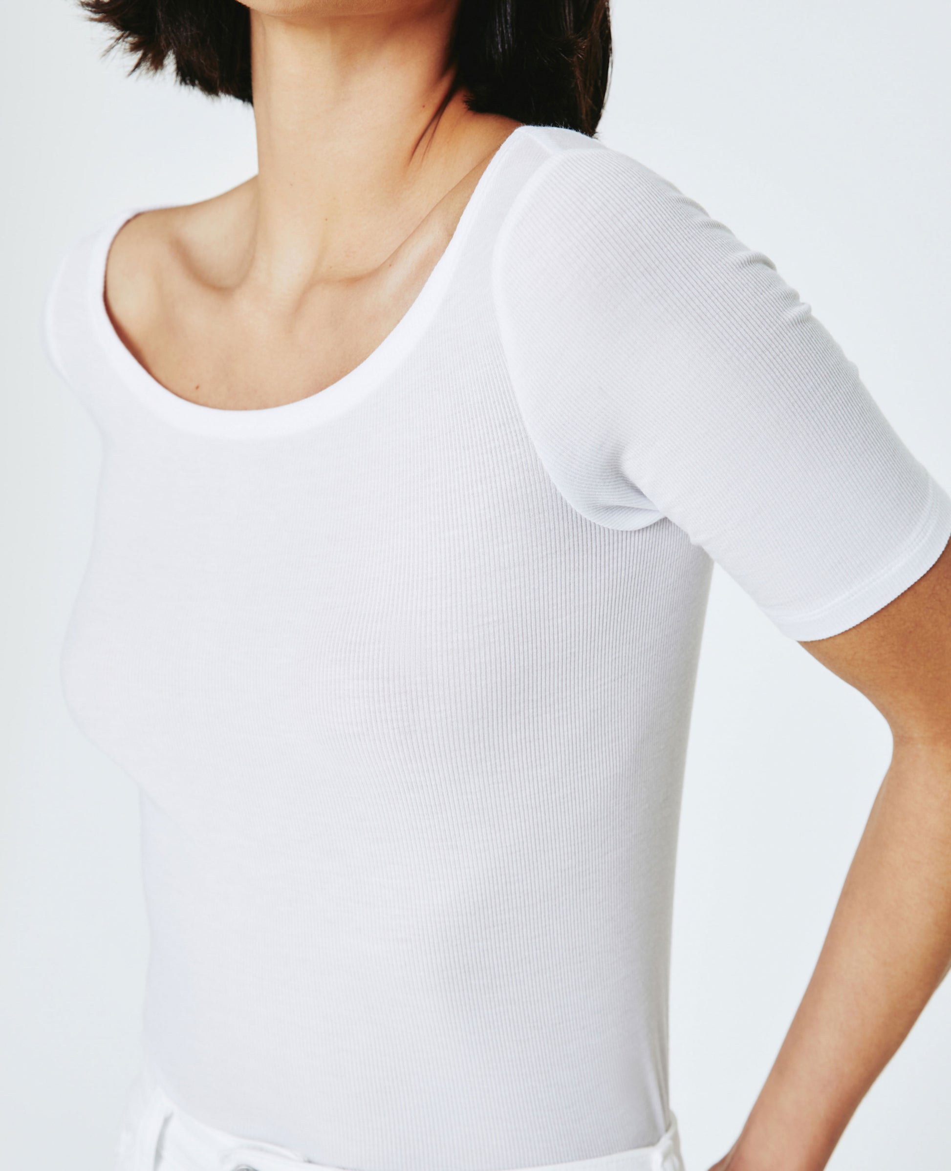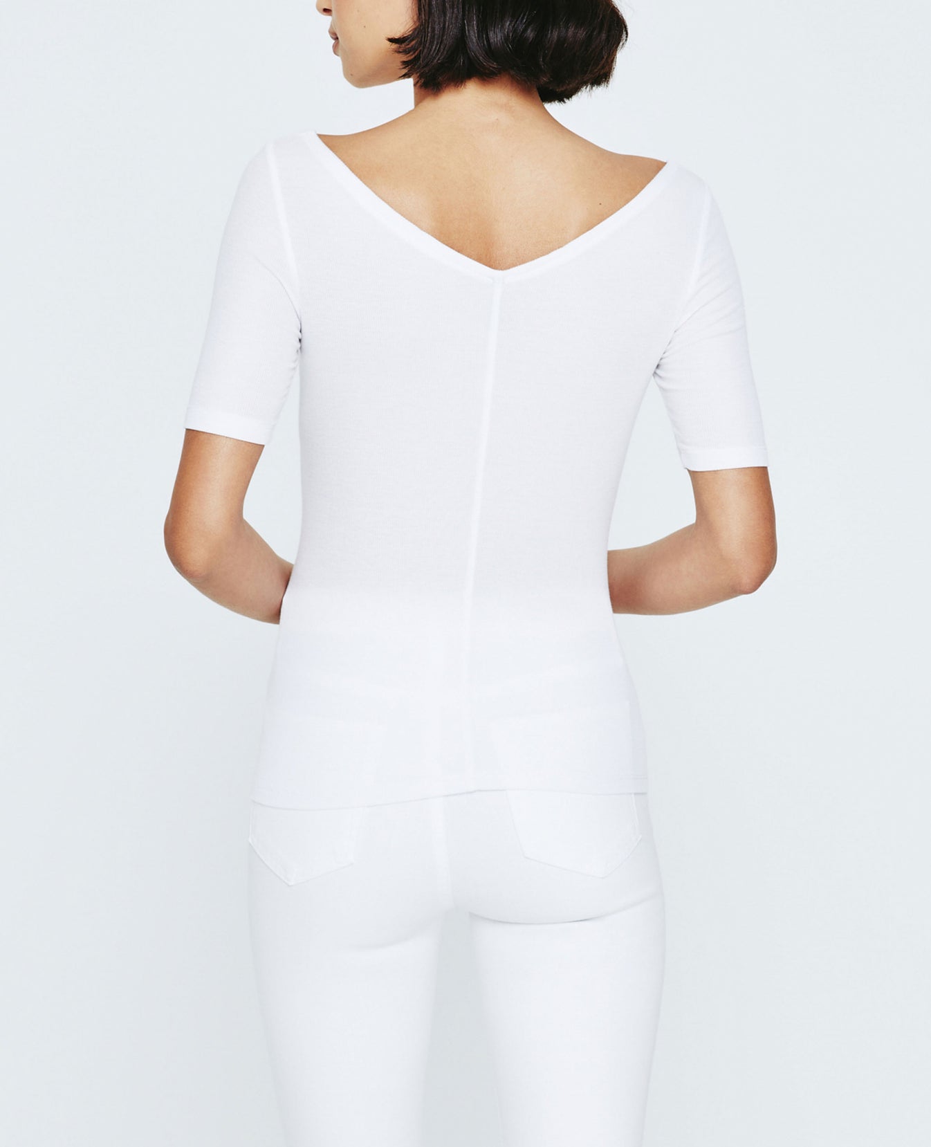 The classic crew neck tee evolves into something modest and bold in our Didion Ballet Neck Tee. Complete with elbow sleeves, this tee offers a feminine option for your traditional S/S tee. We gave particular attention to the small details such as the open neckline and beautiful back V opening. Our in-house looms deliver the precision knitting needed to accomplish the characteristic 2 X 1 weave that lends to the fabric’s superior comfort and draping qualities. Designed in a premium white spandex and 2 X 1 Lyocell Rib fabrication. Made with Eucalyptus, our lyocell is plant-based, biodegradable, and uses 20% less resources to develop.
