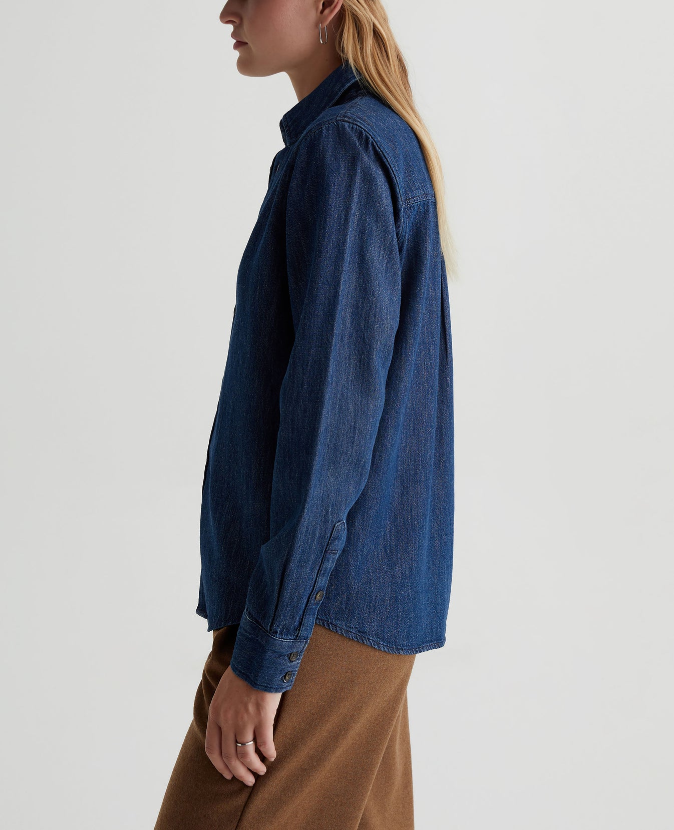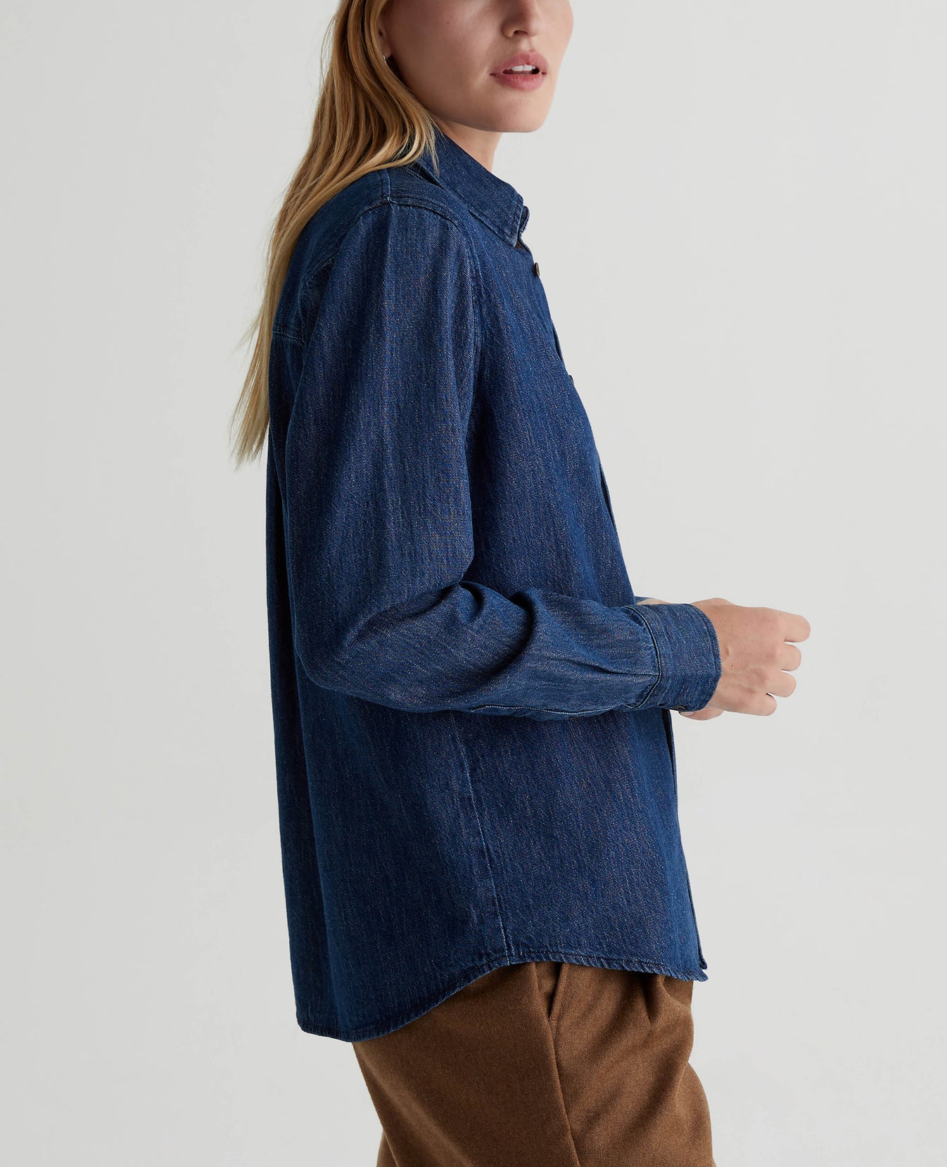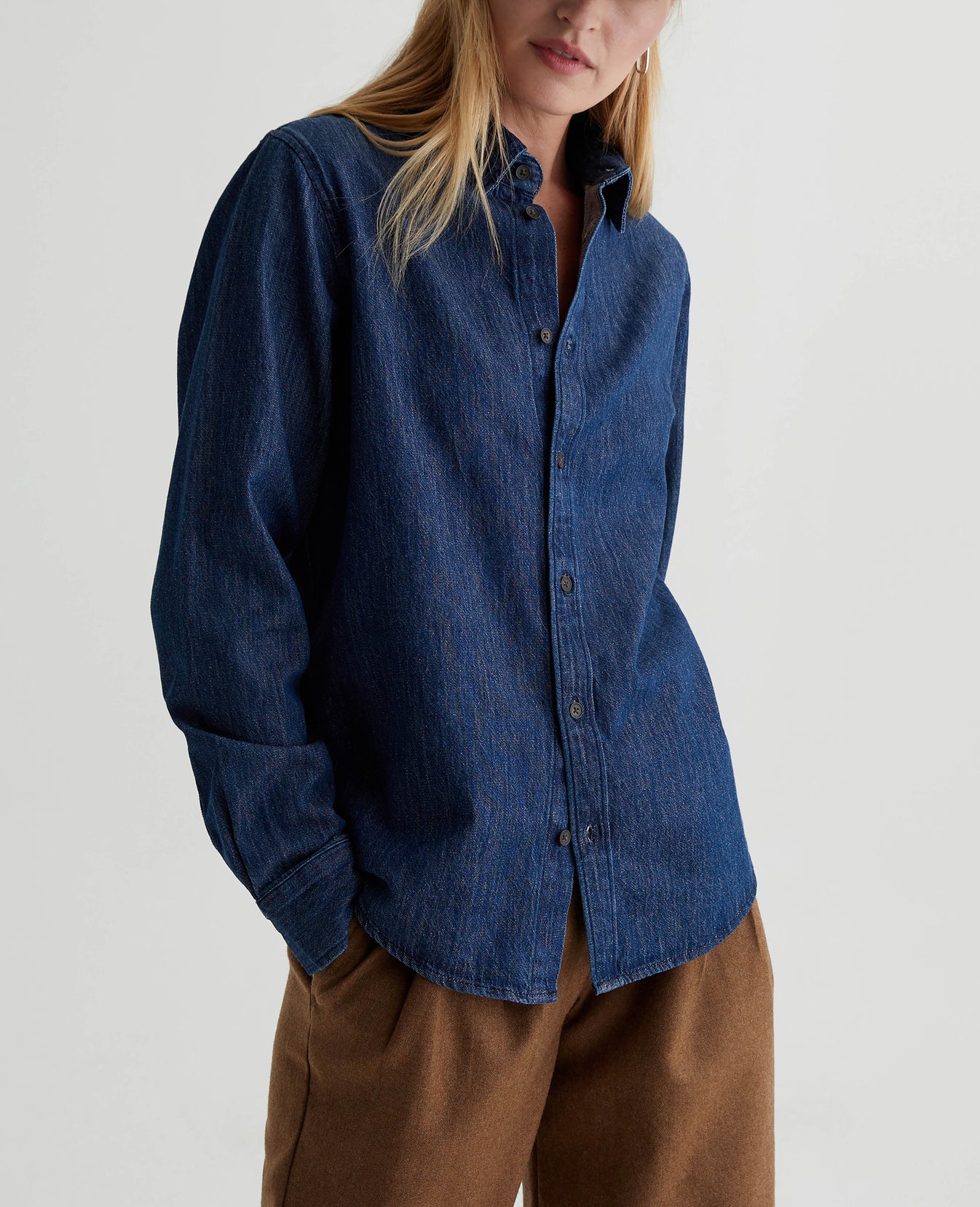 The EmRata x AG Elena is a fitted chambray button up shirt with a modern tailored appeal. This wardrobe staple is made in 7.25 oz. Boundless Lightweight Denim in a sophisticated classic blue. A perfect long sleeve button up for any wardrobe, providing easy layering and styling. Designed in partnership with Emily Ratajkowski, the EmRata x AG capsule reflects the model's personal style with a curated collection of versatile pieces able to pair effortlessly together for everyday elevated style.