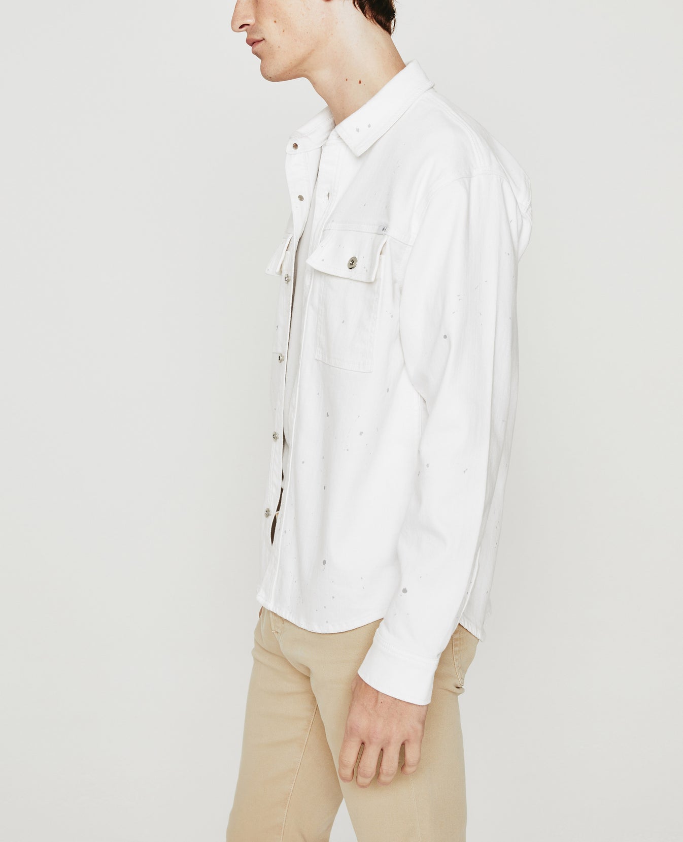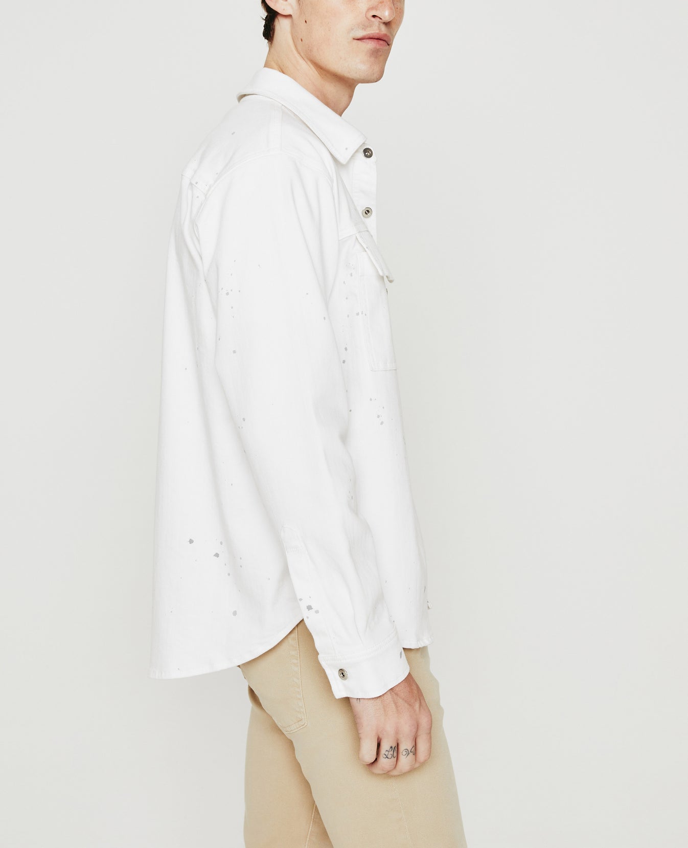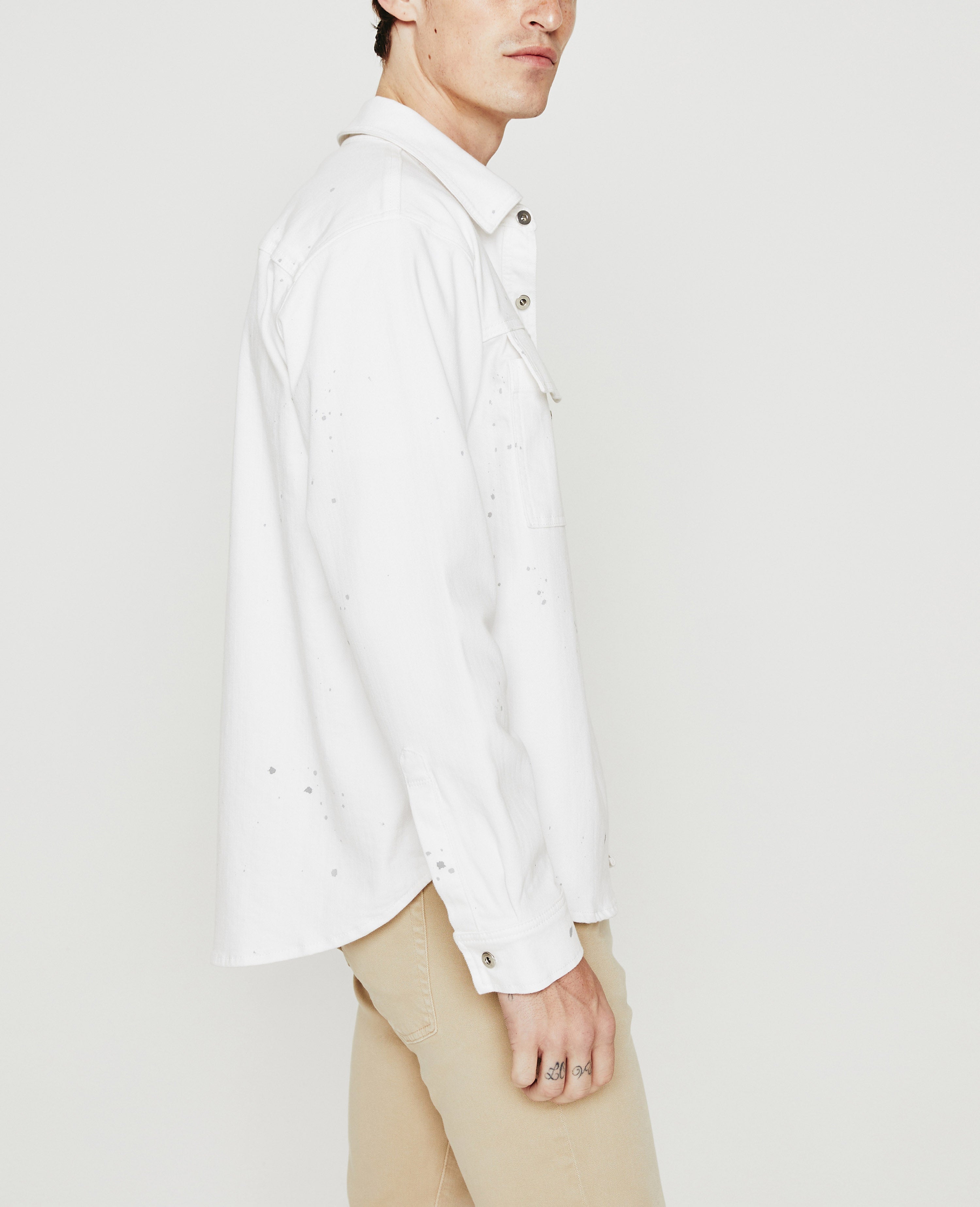 The Elias Shirt Jacket is a utilitarian-inspired style featuring an oversized fit, long sleeves, and flap pockets at the chest. Crafted from 10 oz. Dover Stretch Denim in white, it's flecked with subtle grey paint splatters.