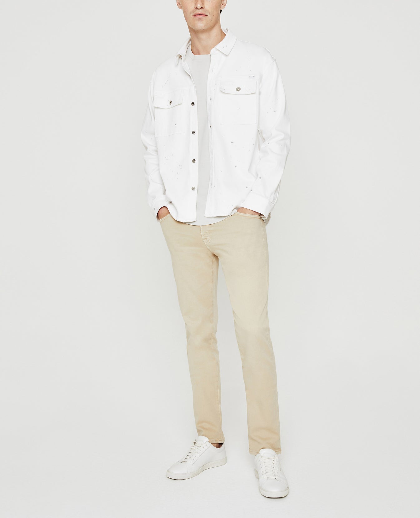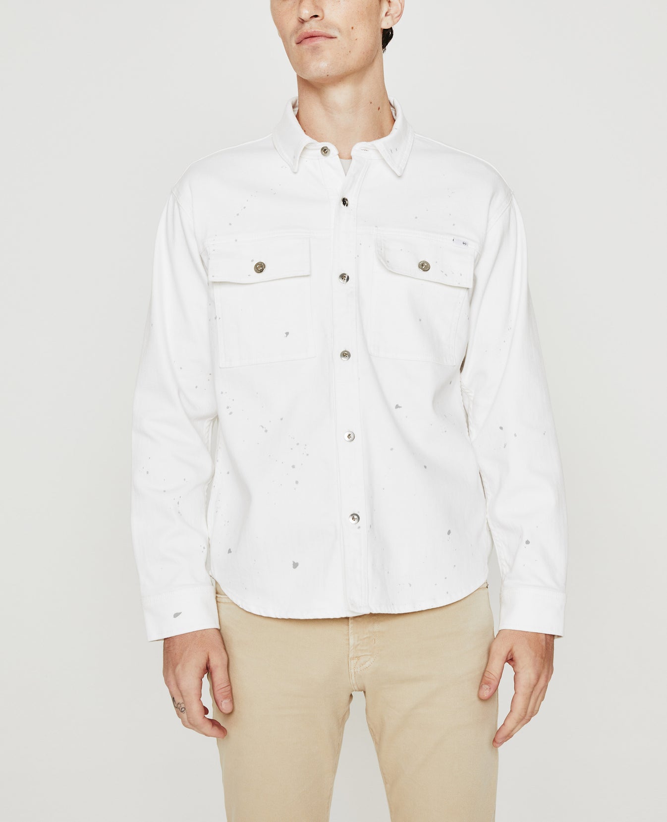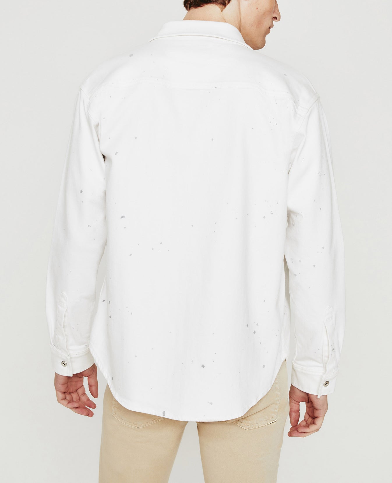 The Elias Shirt Jacket is a utilitarian-inspired style featuring an oversized fit, long sleeves, and flap pockets at the chest. Crafted from 10 oz. Dover Stretch Denim in white, it's flecked with subtle grey paint splatters.