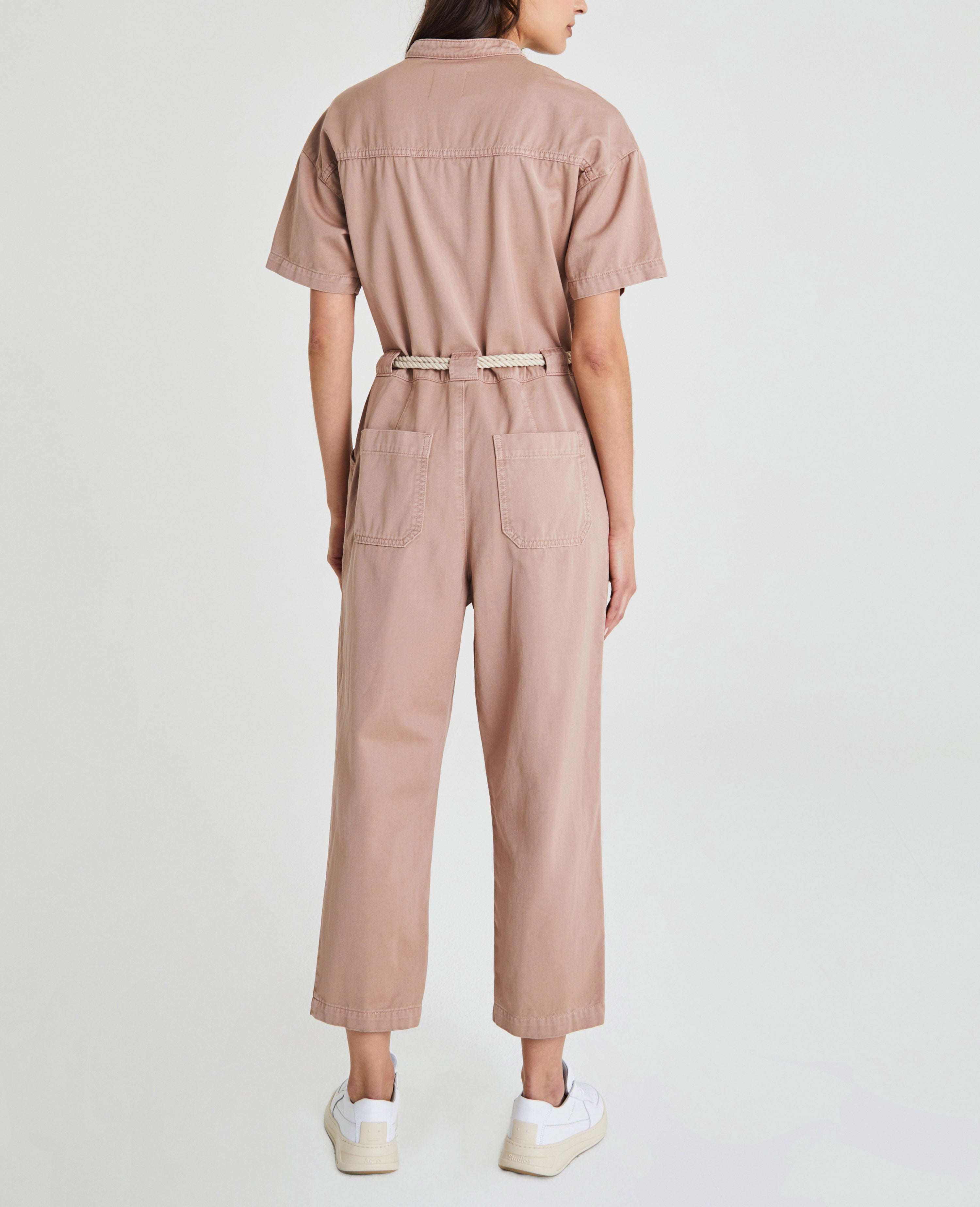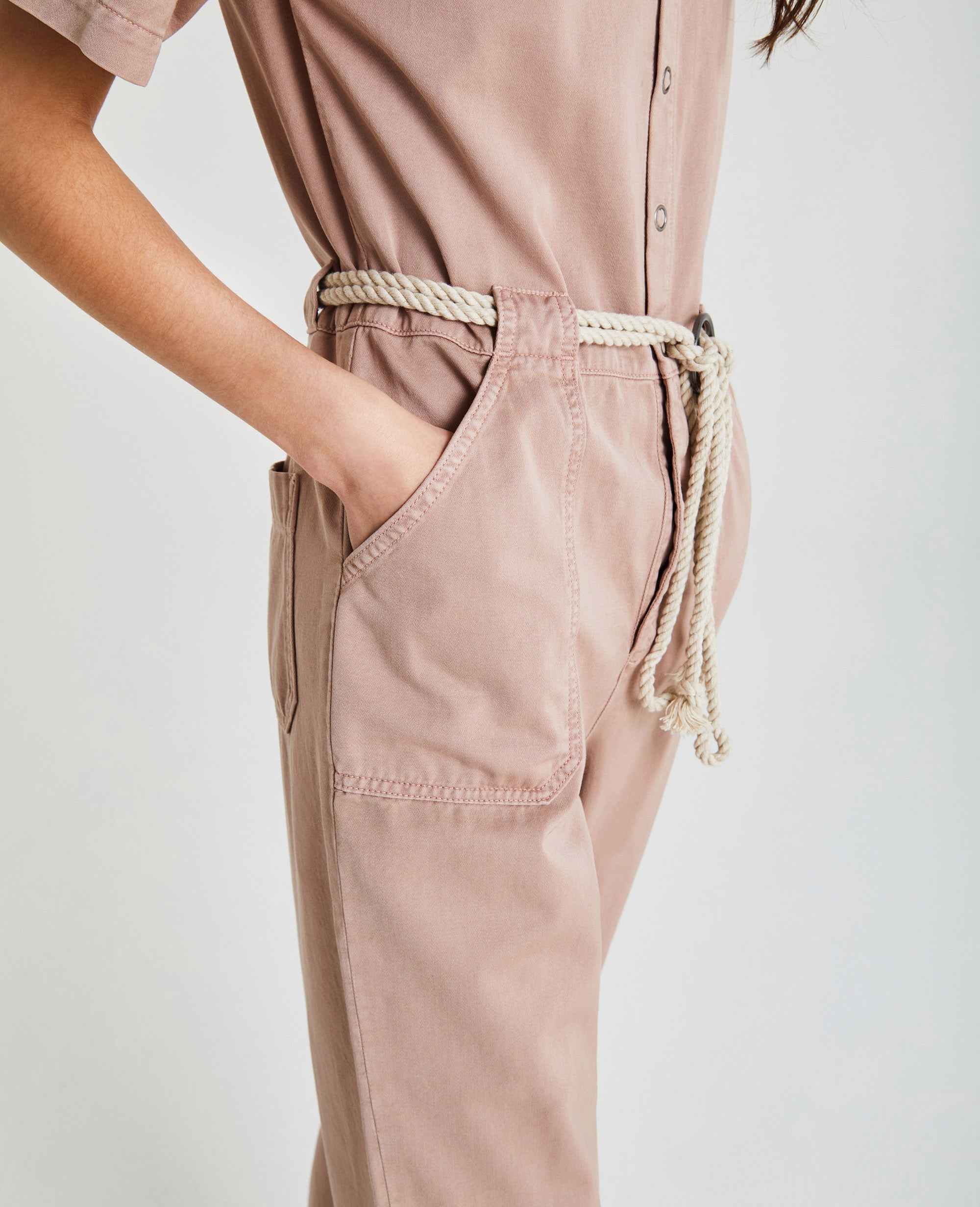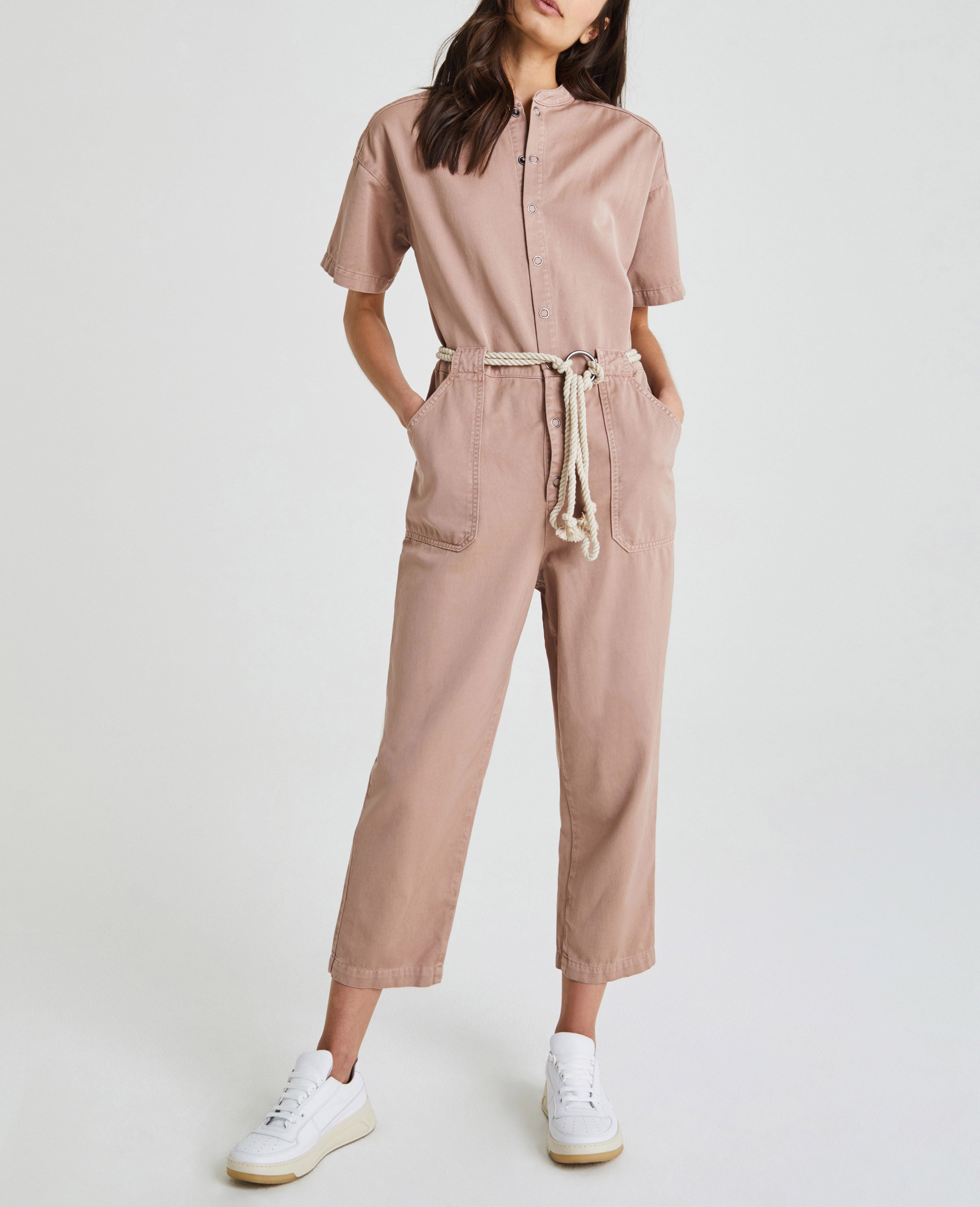 The Emery Jumpsuit for women features a rooty mauve tone treated with a sulfur finish for distinctly vintage highs and lows. The Emery offers a timeless silhouette complete with novelty details like a cotton rope tie cinched back with a metal ring, unexpected mandarin collar, and dropped shoulers. This women's jumpsuit is designed in a decadent sateen twill fabric made with 100% cotton for added breathability and comfort.