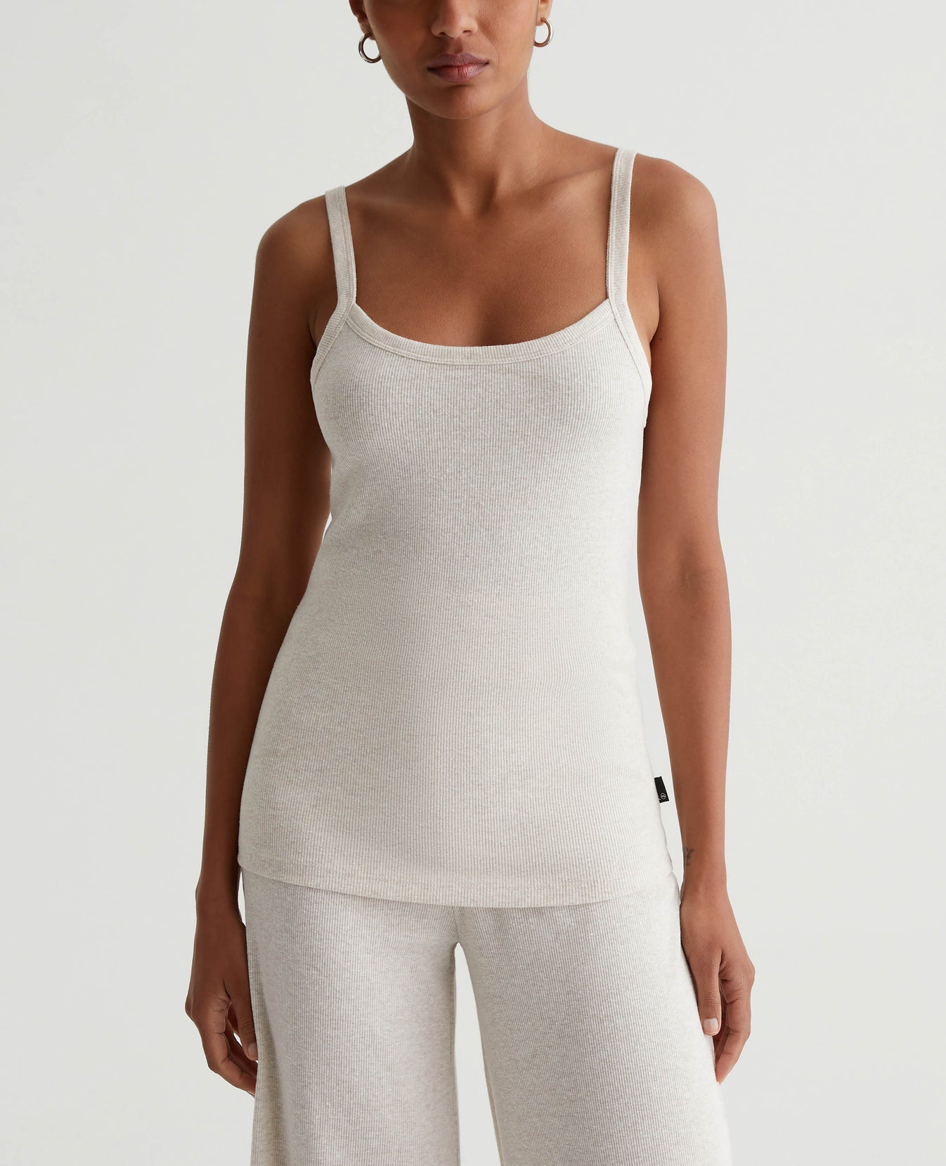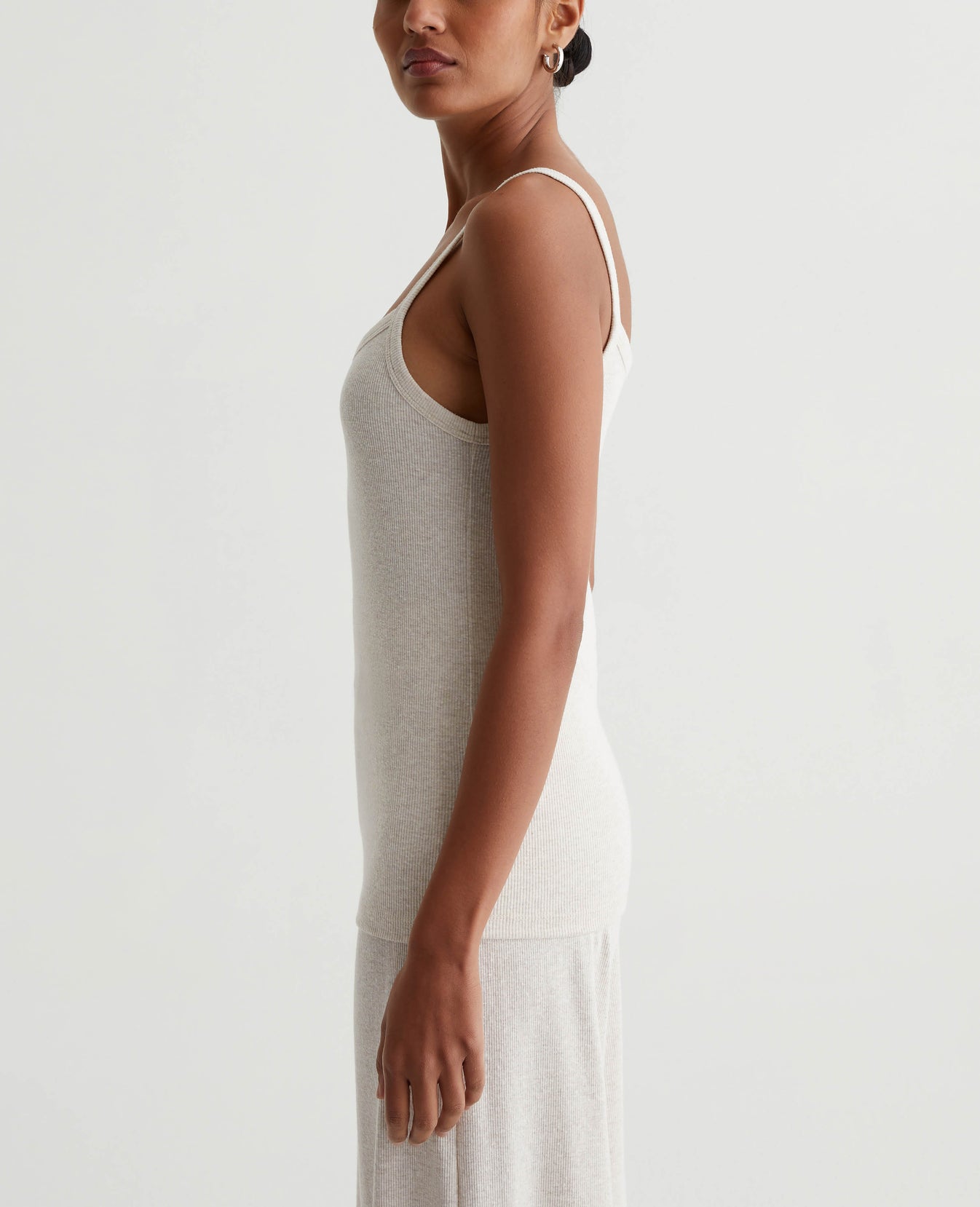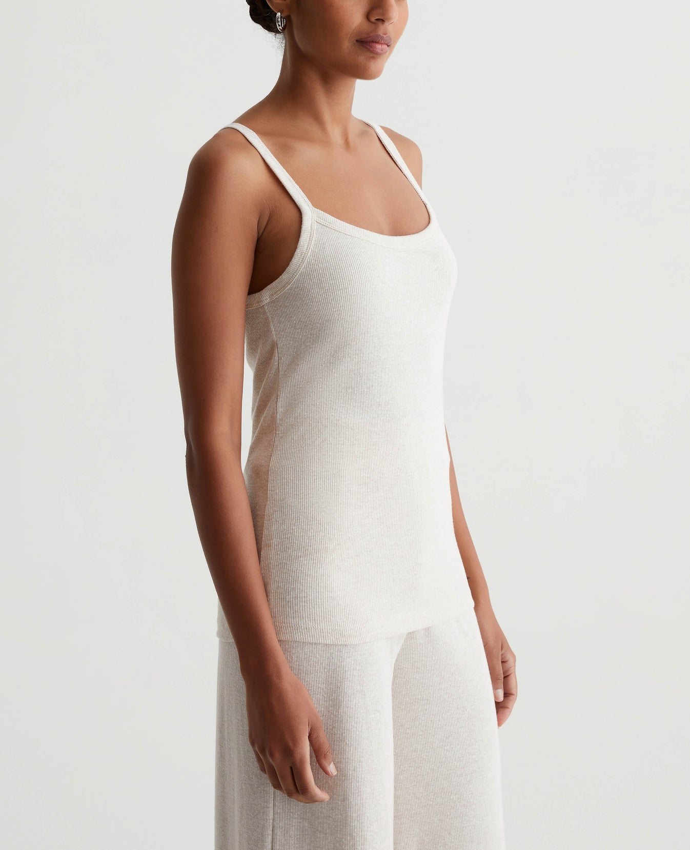 A luxe piece for lounging and layering, the Ever Tank has a slim fit and soft feel in our Mélange Snow Rib. Featured here in heathered Snow White, this strappy knit top naturally pairs with our Saamie Cardigan and Sourie pants to create a cozy-chic set.