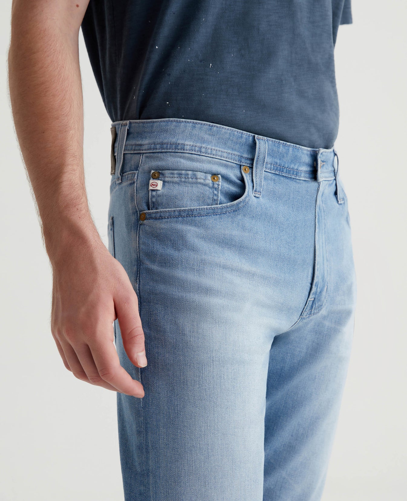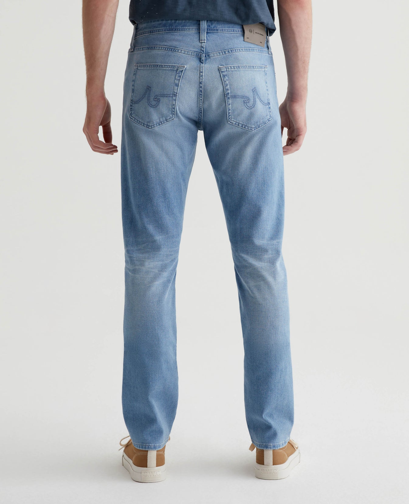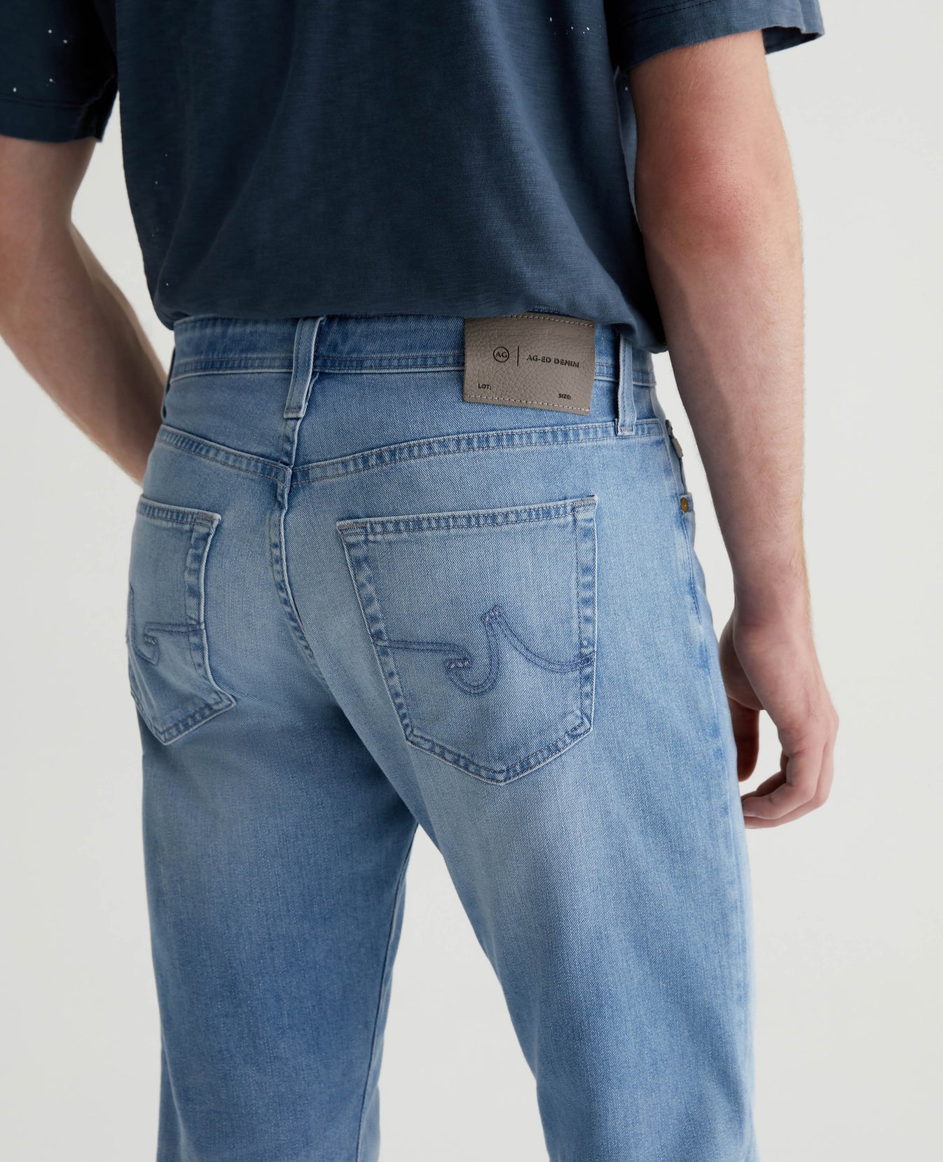 Everett is a slim straight fit for men, updated in a medium blue AG-ed™ wash with heavy fading. The style has a mid-rise waist and a straight fit that’s relaxed from hip to knee before slightly tapering at the leg opening. Made from our exclusive AG Cloud Soft Denim™, these men’s slim straight jeans are designed in 9.4 oz. Hyper Soft Indigo Denim, our special left-hand twill fabric that allows the yarns to gently relax and untwist for a supple feel that gets even softer with wear. It's got dual-elastic performance fibers built in for added stretch and recovery.