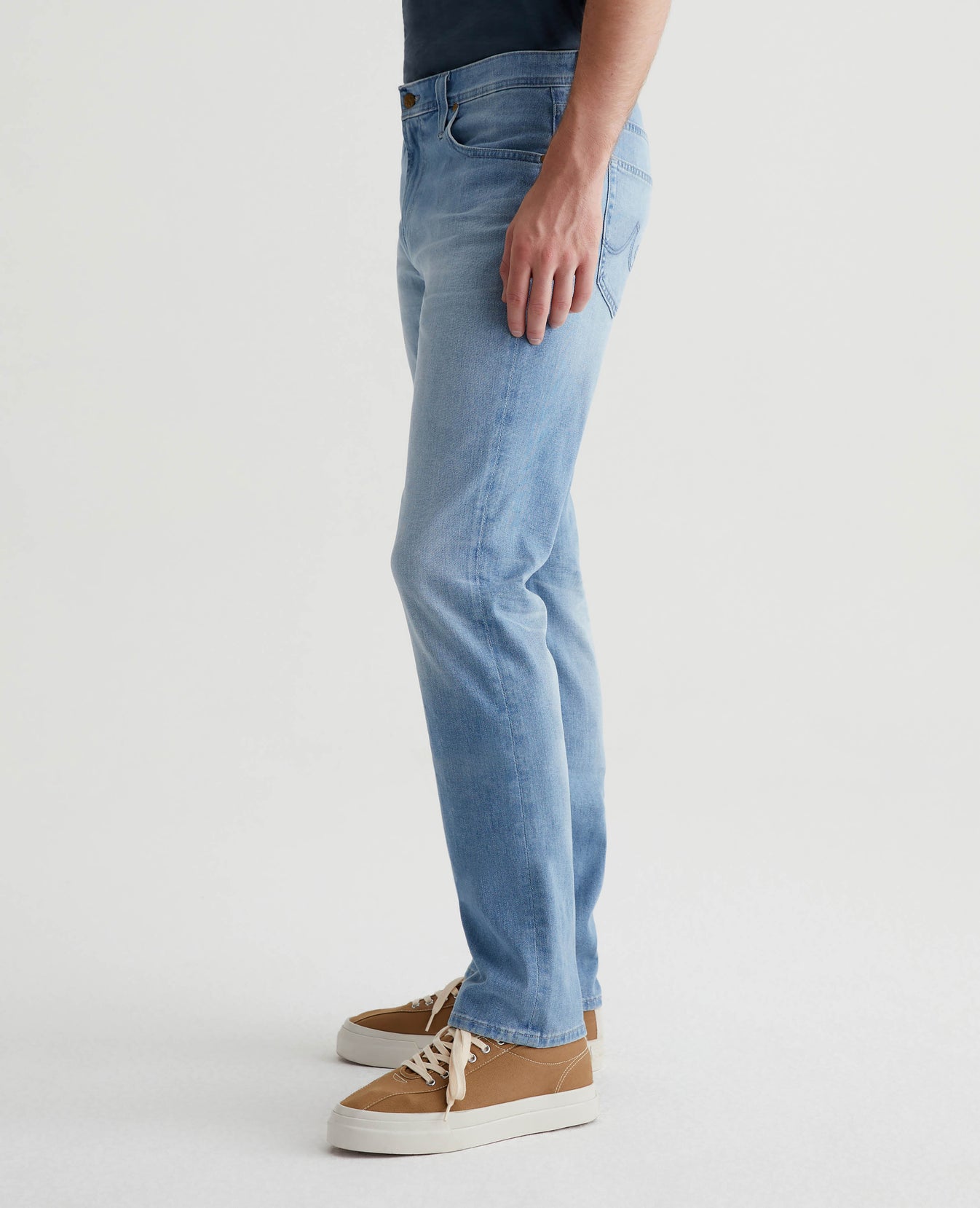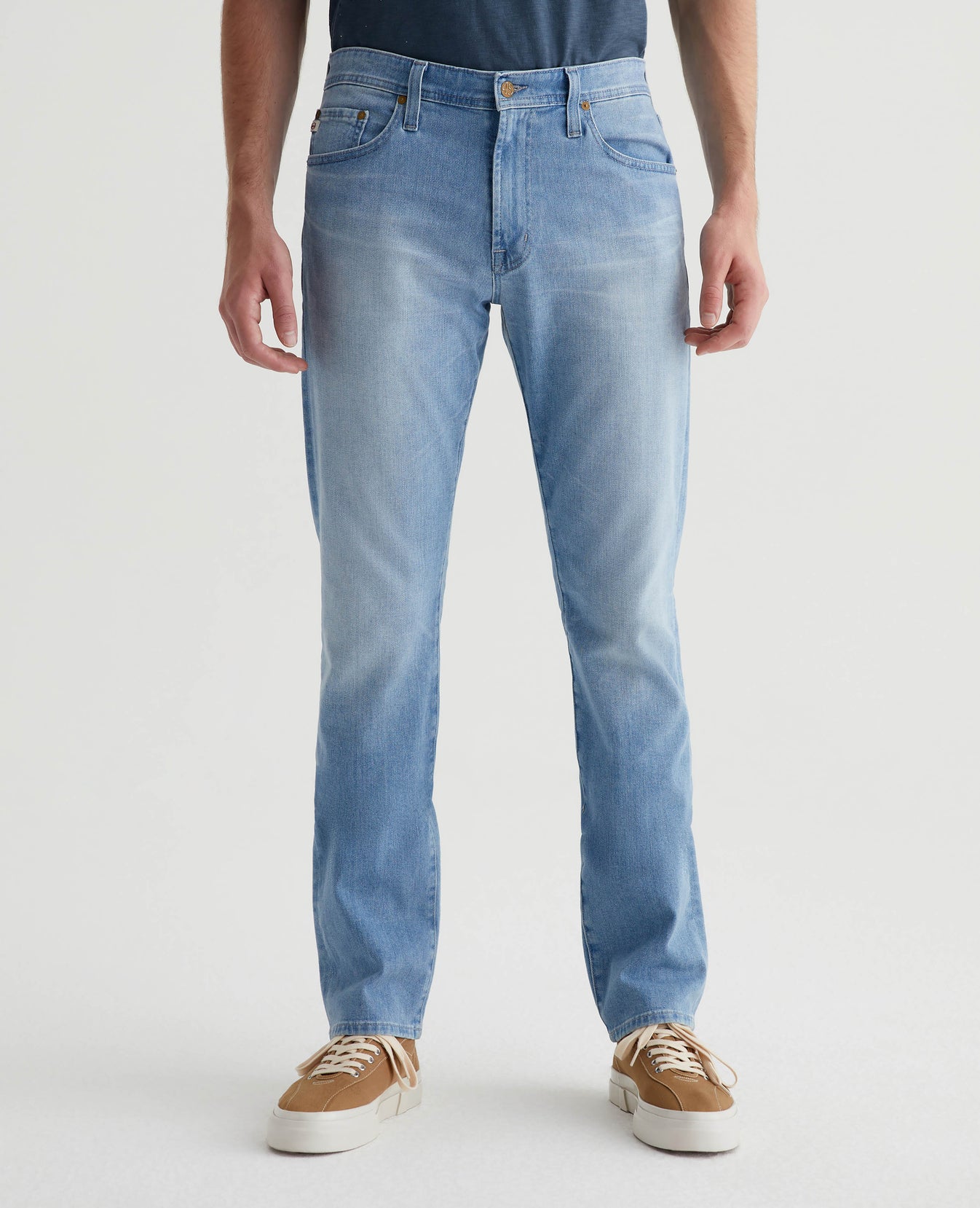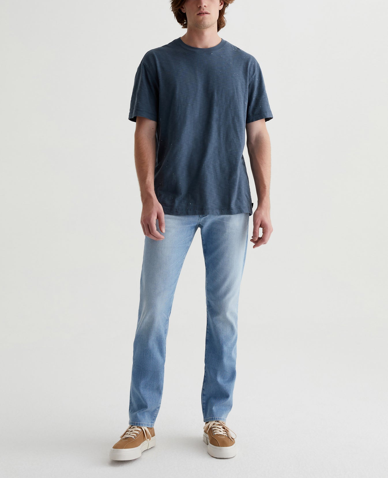 Everett is a slim straight fit for men, updated in a medium blue AG-ed™ wash with heavy fading. The style has a mid-rise waist and a straight fit that’s relaxed from hip to knee before slightly tapering at the leg opening. Made from our exclusive AG Cloud Soft Denim™, these men’s slim straight jeans are designed in 9.4 oz. Hyper Soft Indigo Denim, our special left-hand twill fabric that allows the yarns to gently relax and untwist for a supple feel that gets even softer with wear. It's got dual-elastic performance fibers built in for added stretch and recovery.