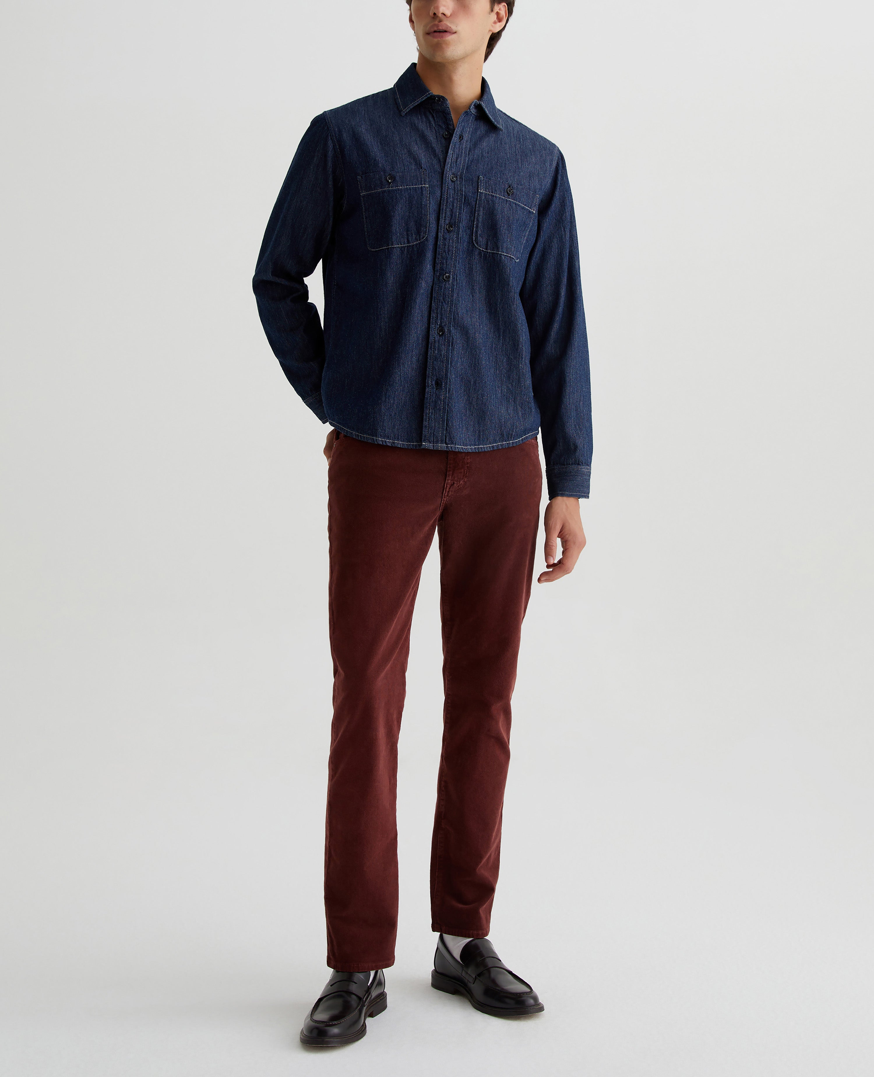 Our Everett slim straight corduroy pants for men have a soft, plush feel in 8.8 oz. Range Stretch Cord fabric with fine-wale construction. Featured here in a sulfur-dyed burgundy shade, the style has a mid-rise waist and a straight fit that’s relaxed from hip to knee before slightly tapering at the leg opening.