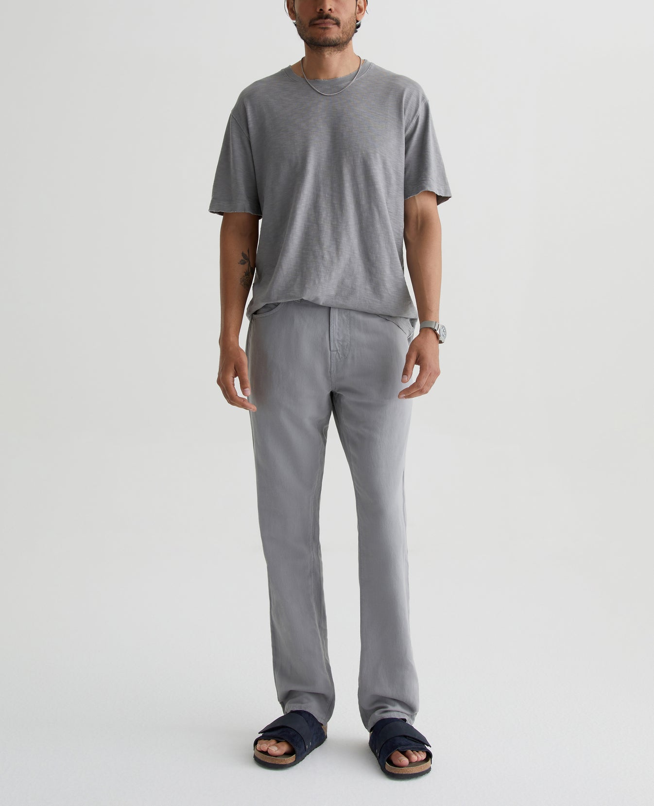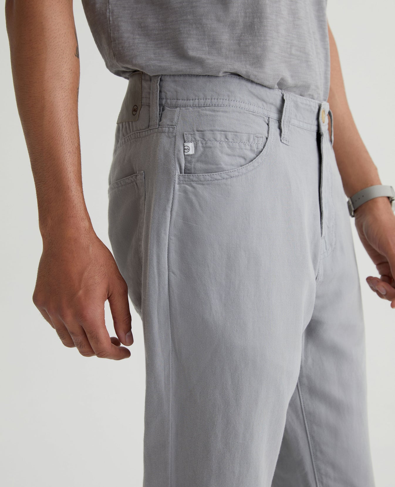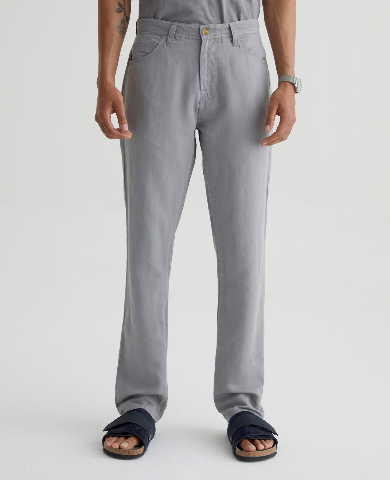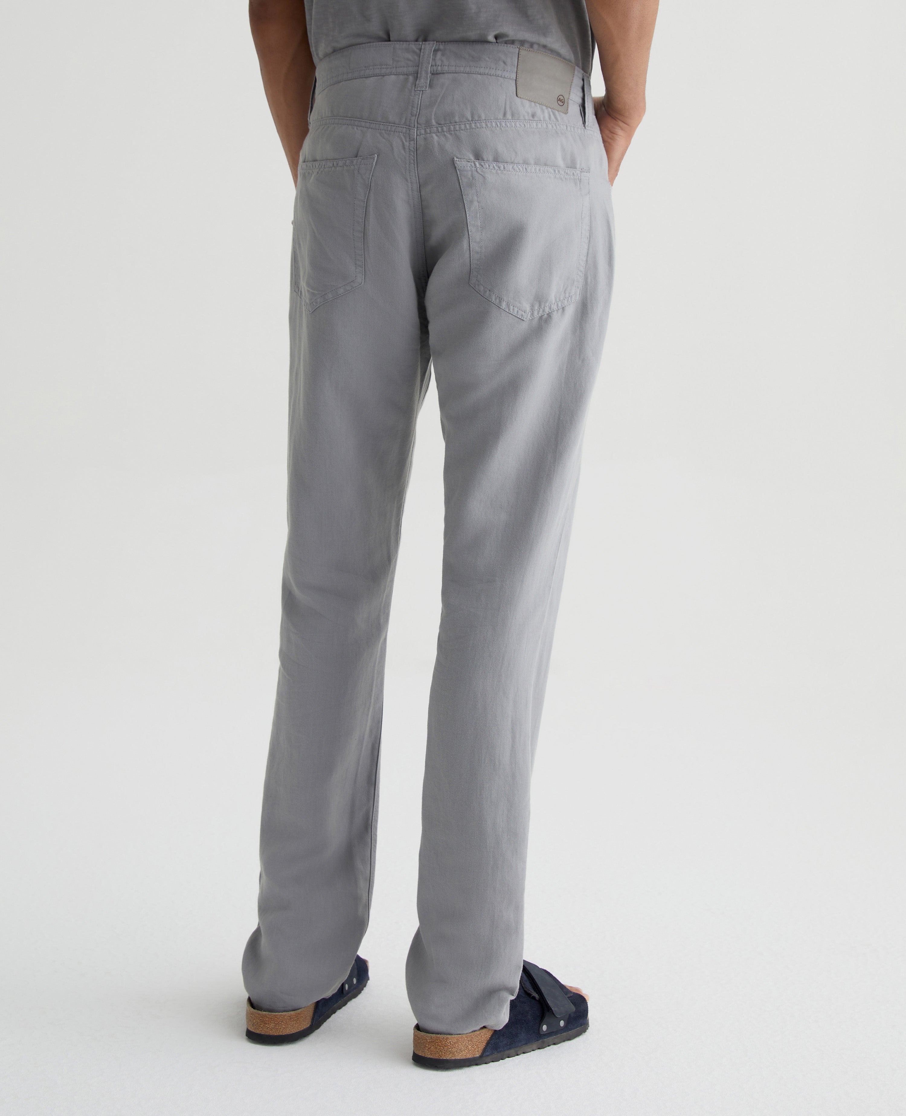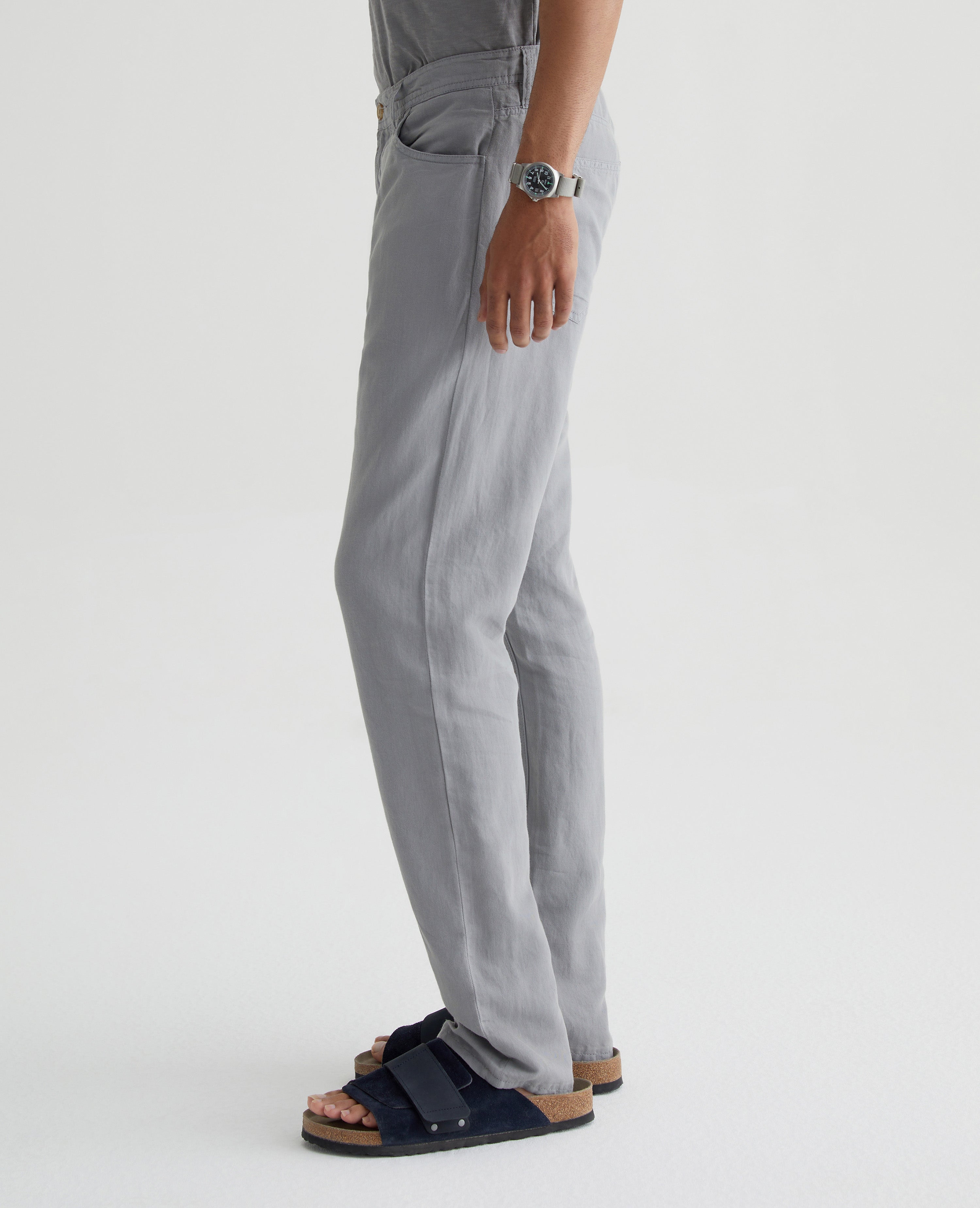 Our Everett slim straight gets a summery update in a soft, airy linen blend. Featuring a versatile grey shade, it's cut with a comfortable mid-rise waist and a straight fit that’s relaxed from hip to the knee before slightly tapering at the leg opening. This men’s slim straight pant has classic five-pocket styling with a zip fly and faux-horn button.