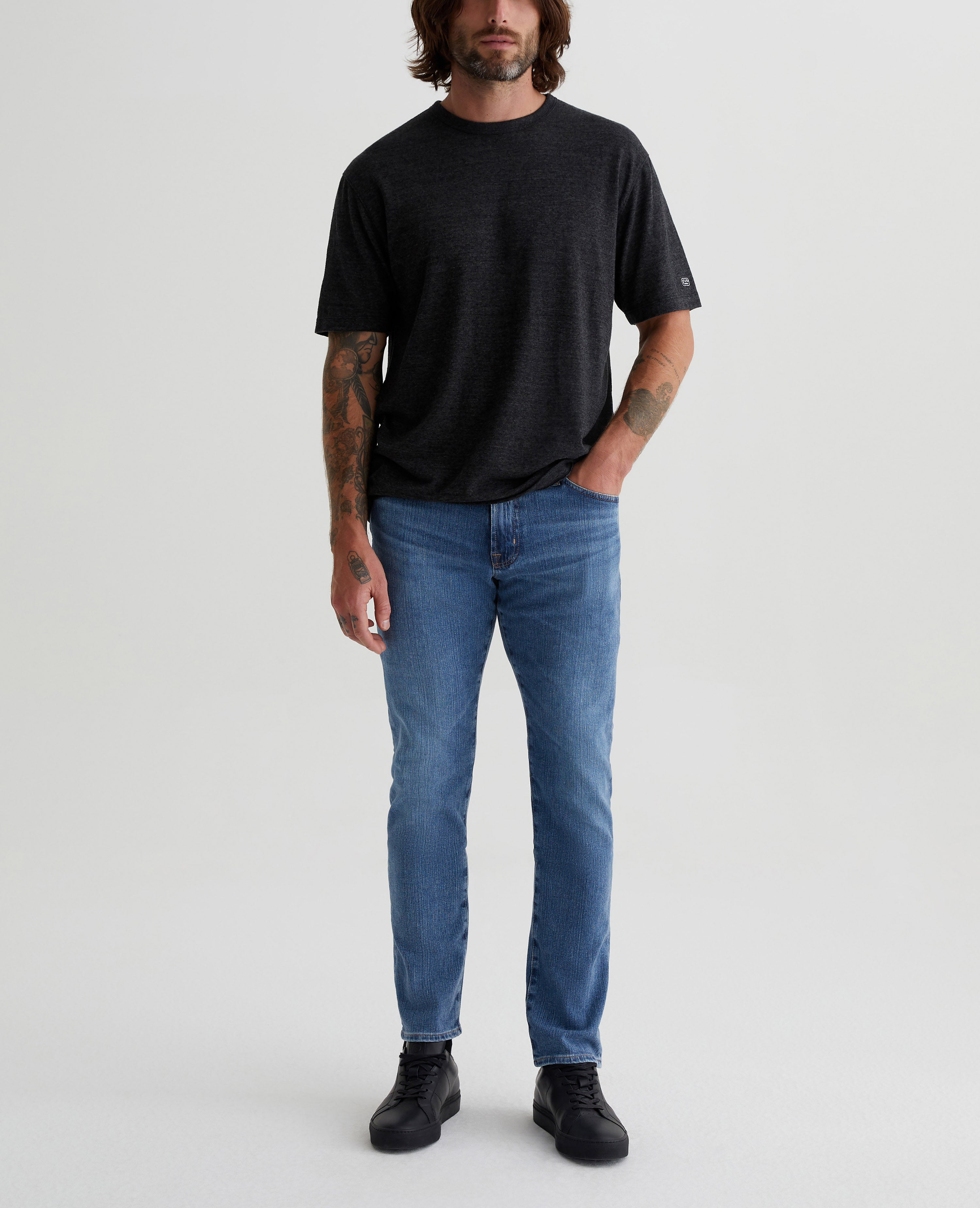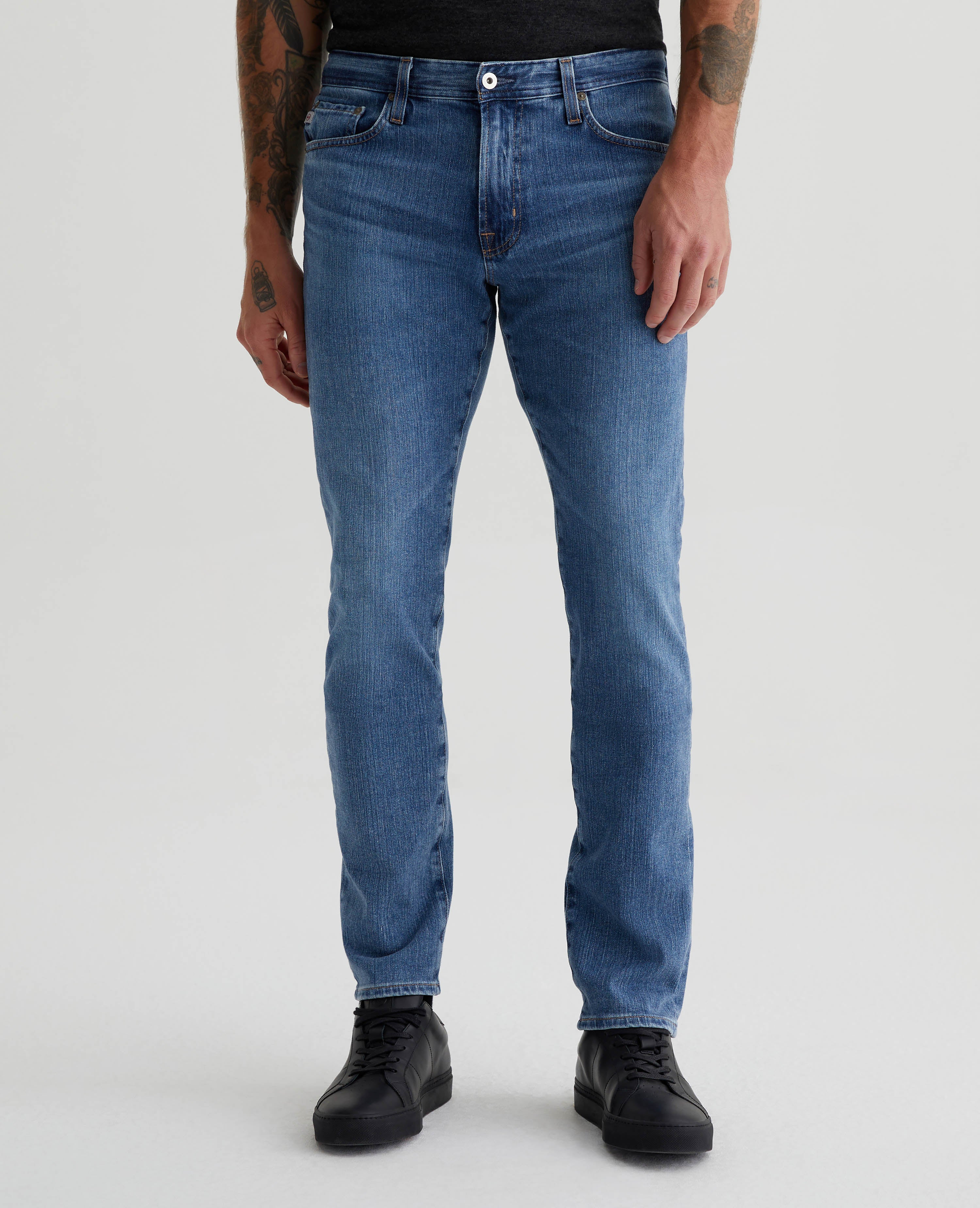 Everett is a slim straight men's jean featuring a light blue wash with faded details. Made using AG's eco-friendly AG Vapor Wash™ technology, this pair has a mid-rise waist with a straight fit that’s relaxed from hip to knee before slightly tapering at the leg opening. These slim straight jeans for men come in 11.5 oz. 360° Denim with advanced stretch and recovery. Our AG Vapor Wash™ process significantly reduces the use of water, chemicals, and energy to lessen environmental impact. Finished with a vegan and 100% biodegradable cellulose patch at the back waistband.