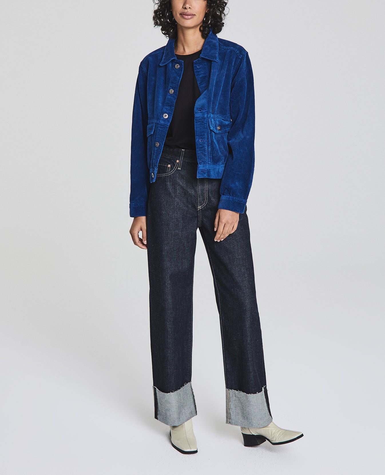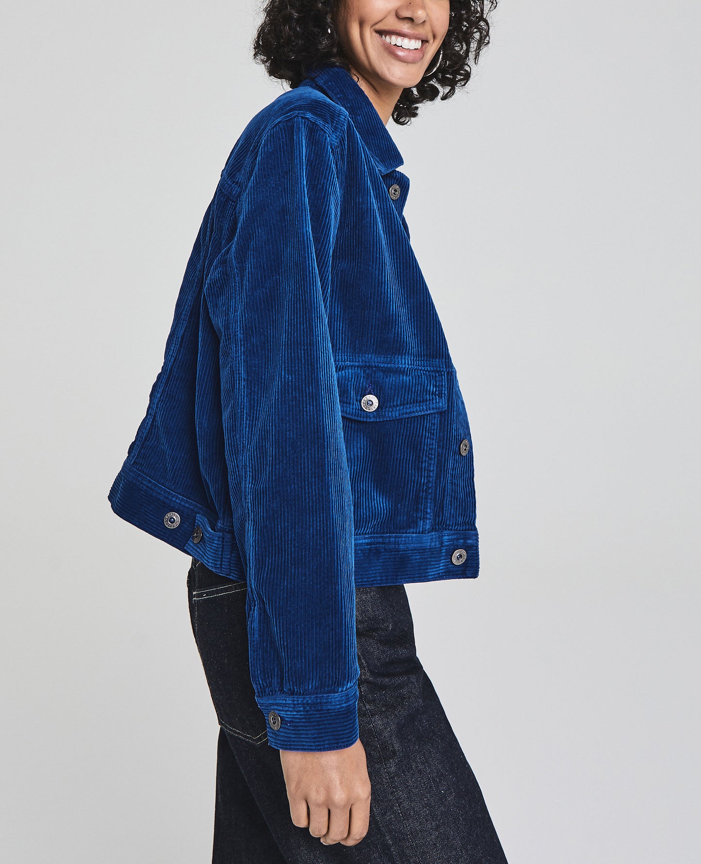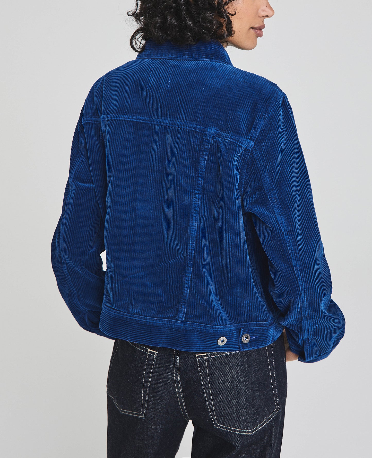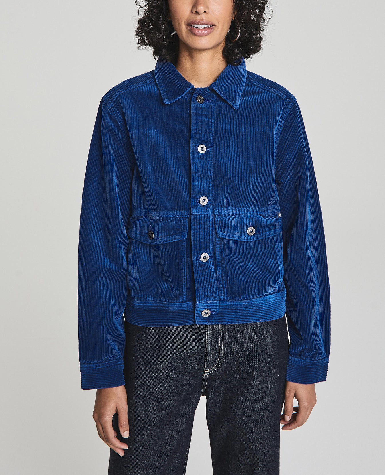 Evonne Jacket is a corduroy jacket for women featuring a vibrant french blue, boxy silhouette with cropped length, and DIY repositioned patch pockets with button closure. This women’s jacket is designed in a rigid wide wale corduroy for classic draping with authentic vintage appeal.