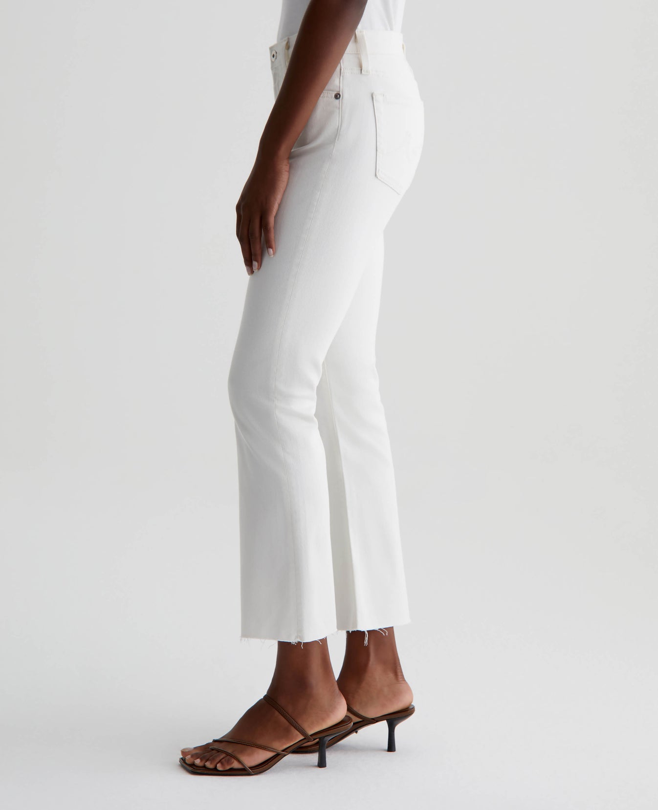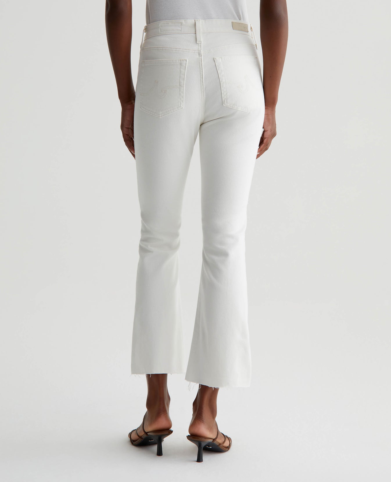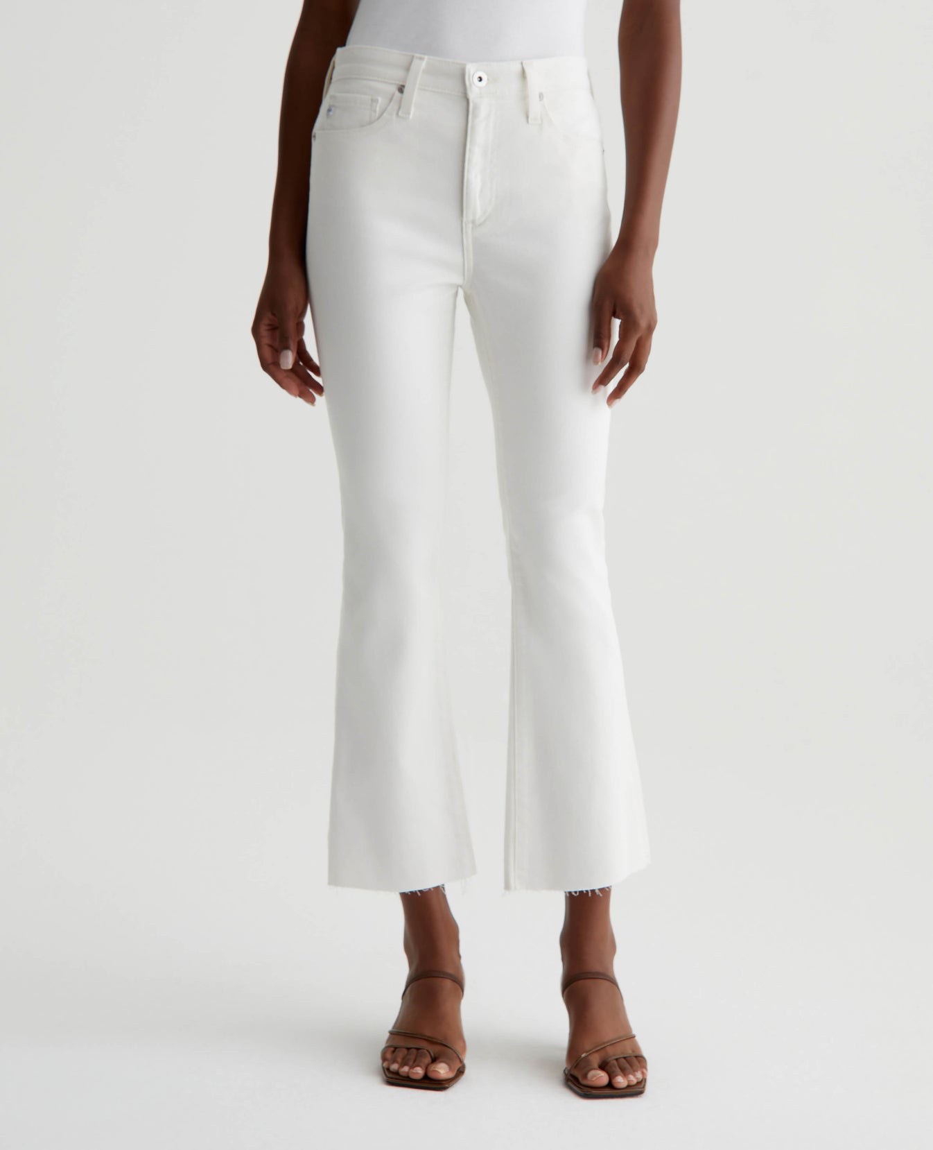 The Farrah Boot Crop jean is a mid-rise cropped bootcut silhouette in powder white. The five-pocket pair has a skinny fit through the legs before opening into subtly flared raw hems. Crafted from our exclusive AG Cloud Soft Denim™, these women’s bootcut jeans are designed in 8.7 oz. Hyper Soft Bull Denim, a left-hand twill fabric that allows the yarns to gently relax and untwist for a supple, velvety feel. It's designed to get even softer as you wear it. Superstretch construction delivers premium comfort and advanced recovery.