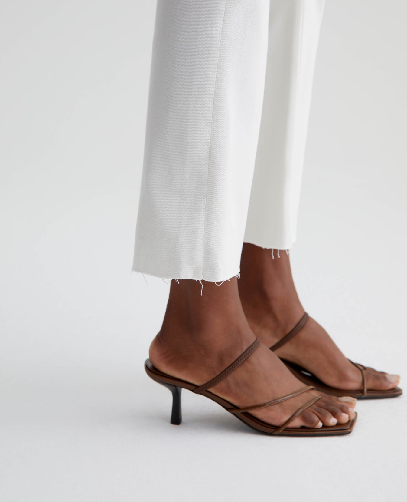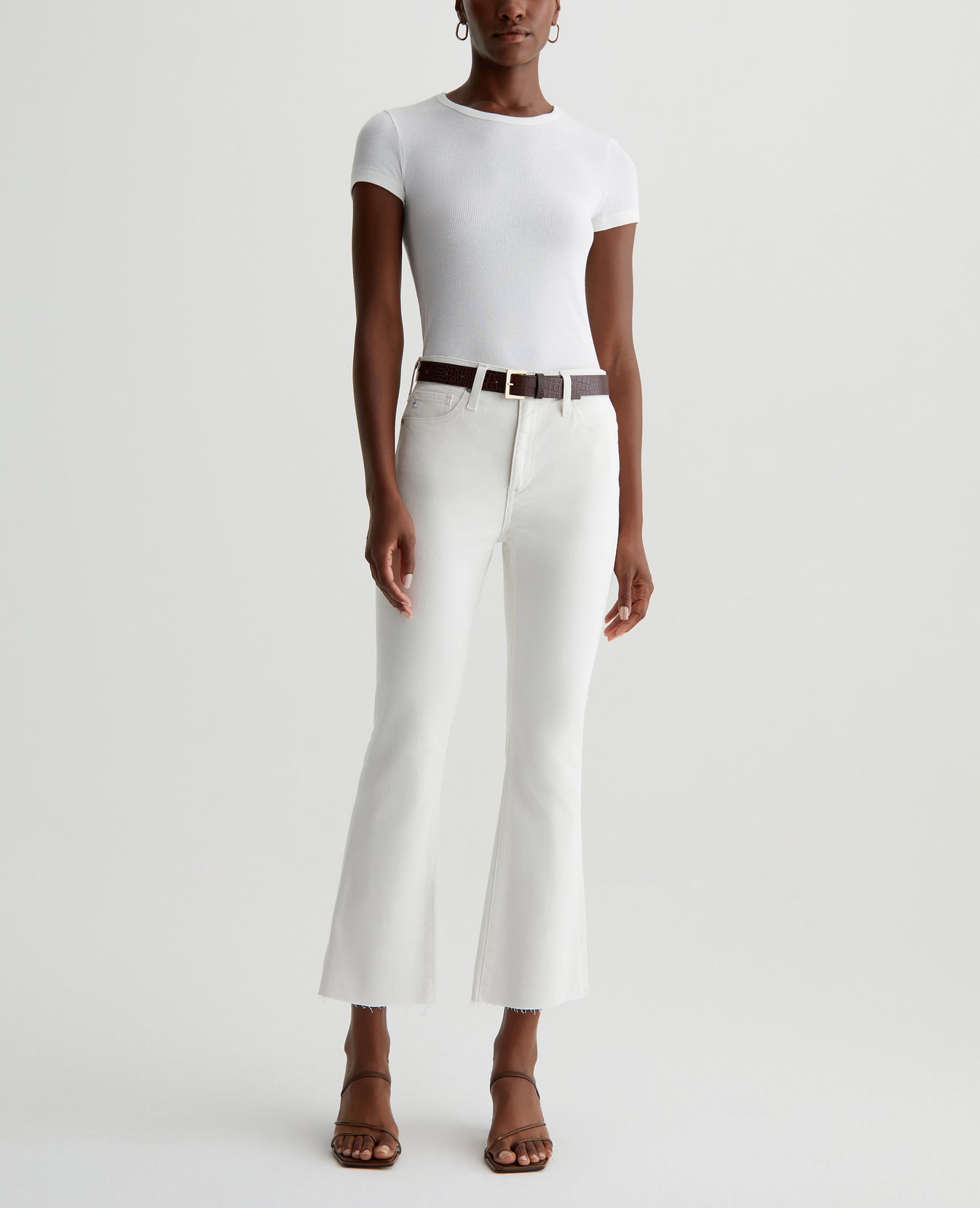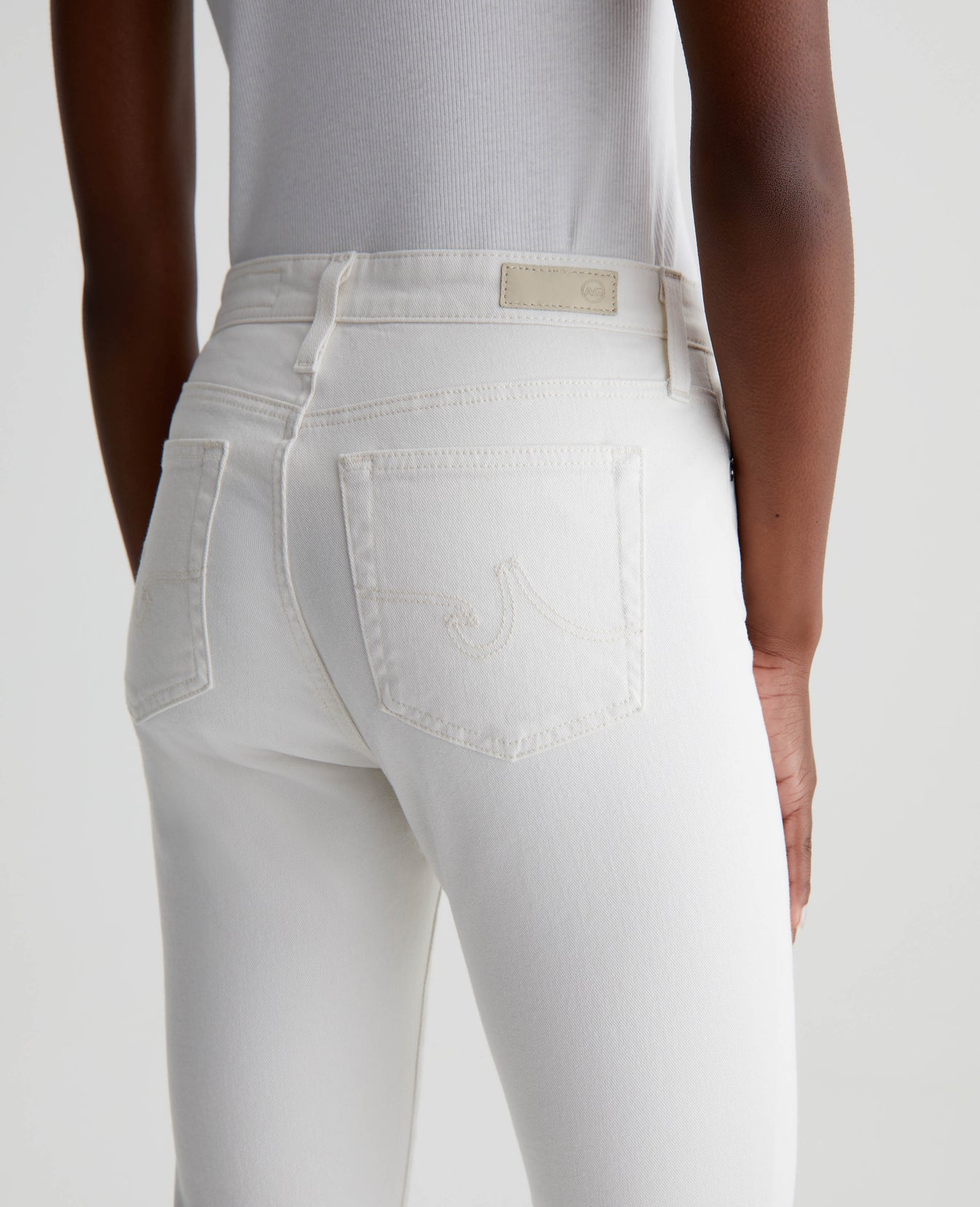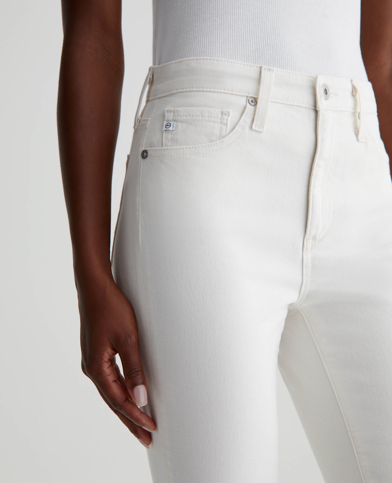 The Farrah Boot Crop jean is a mid-rise cropped bootcut silhouette in powder white. The five-pocket pair has a skinny fit through the legs before opening into subtly flared raw hems. Crafted from our exclusive AG Cloud Soft Denim™, these women’s bootcut jeans are designed in 8.7 oz. Hyper Soft Bull Denim, a left-hand twill fabric that allows the yarns to gently relax and untwist for a supple, velvety feel. It's designed to get even softer as you wear it. Superstretch construction delivers premium comfort and advanced recovery.