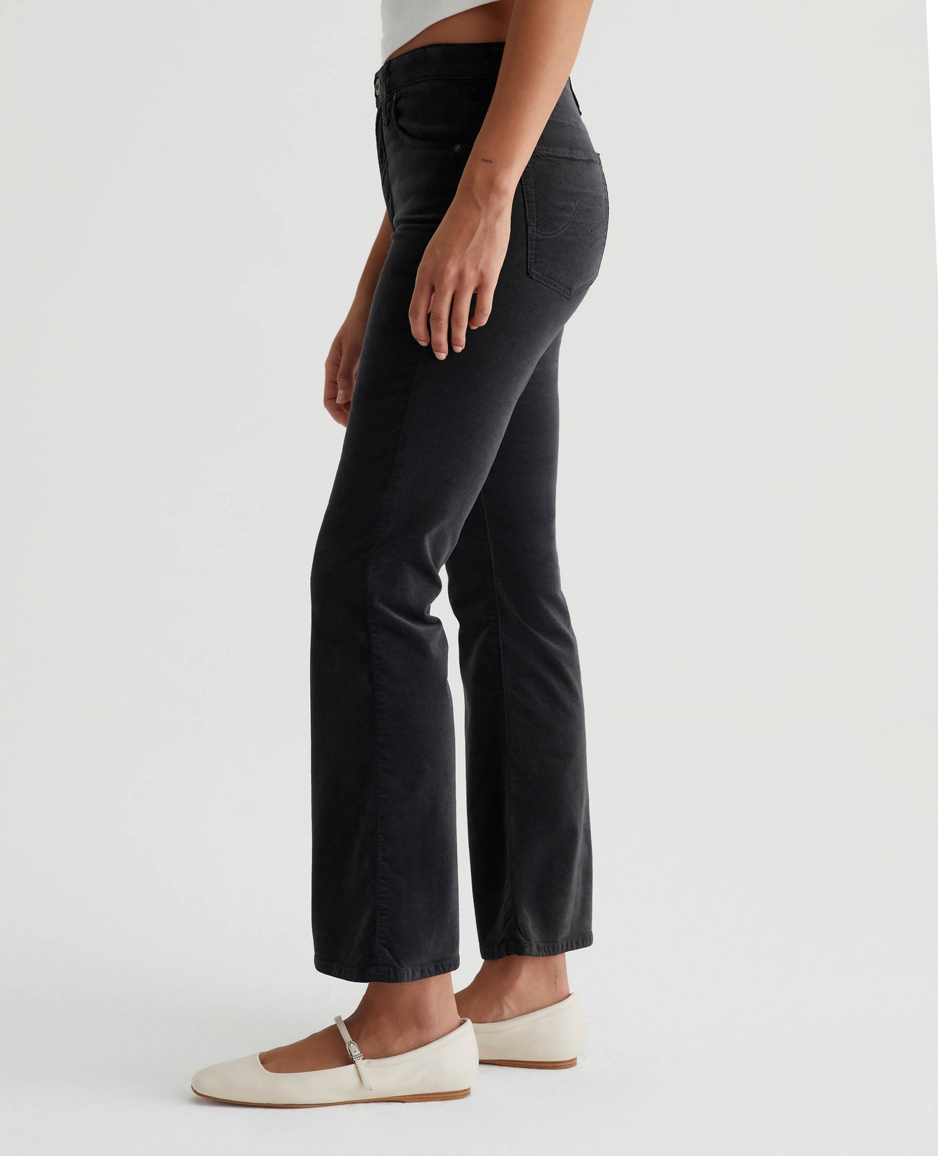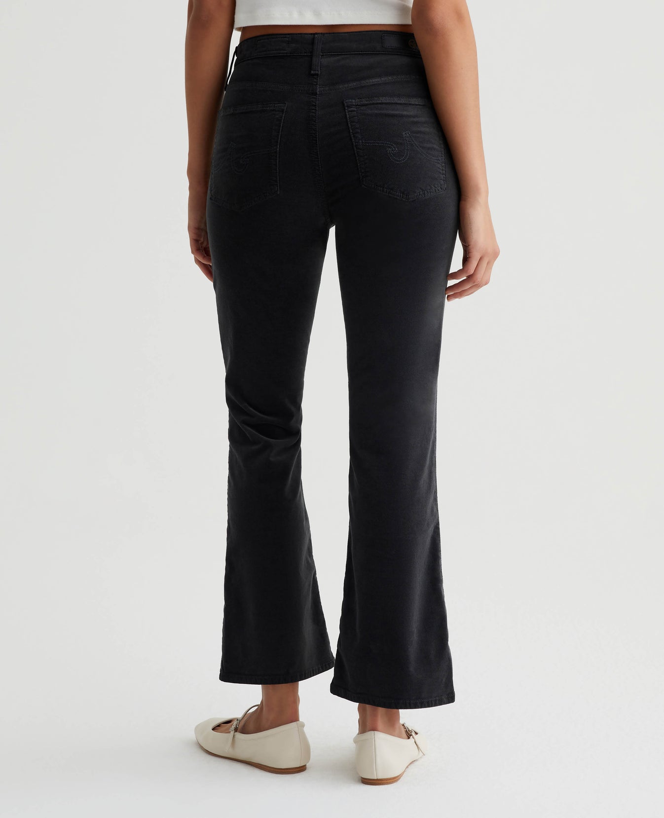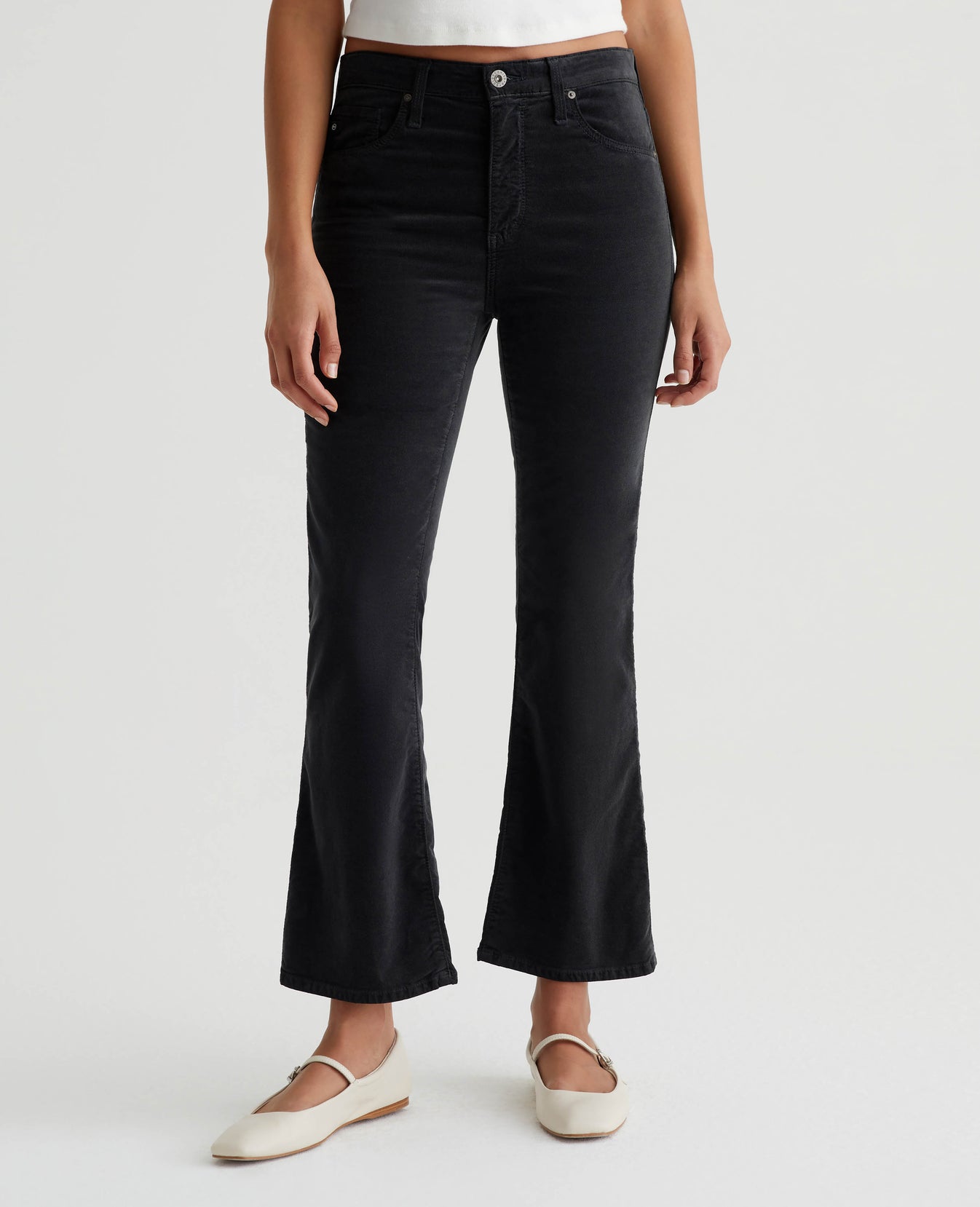 Our Farrah Boot Crop has a decadently soft feel in 7.5 oz. Opulent Stretch Velvet featuring a dark grey shade. Cut for a mid-rise bootcut silhouette in a cropped length, the pair has a skinny fit through the legs before opening into subtly flared hems.