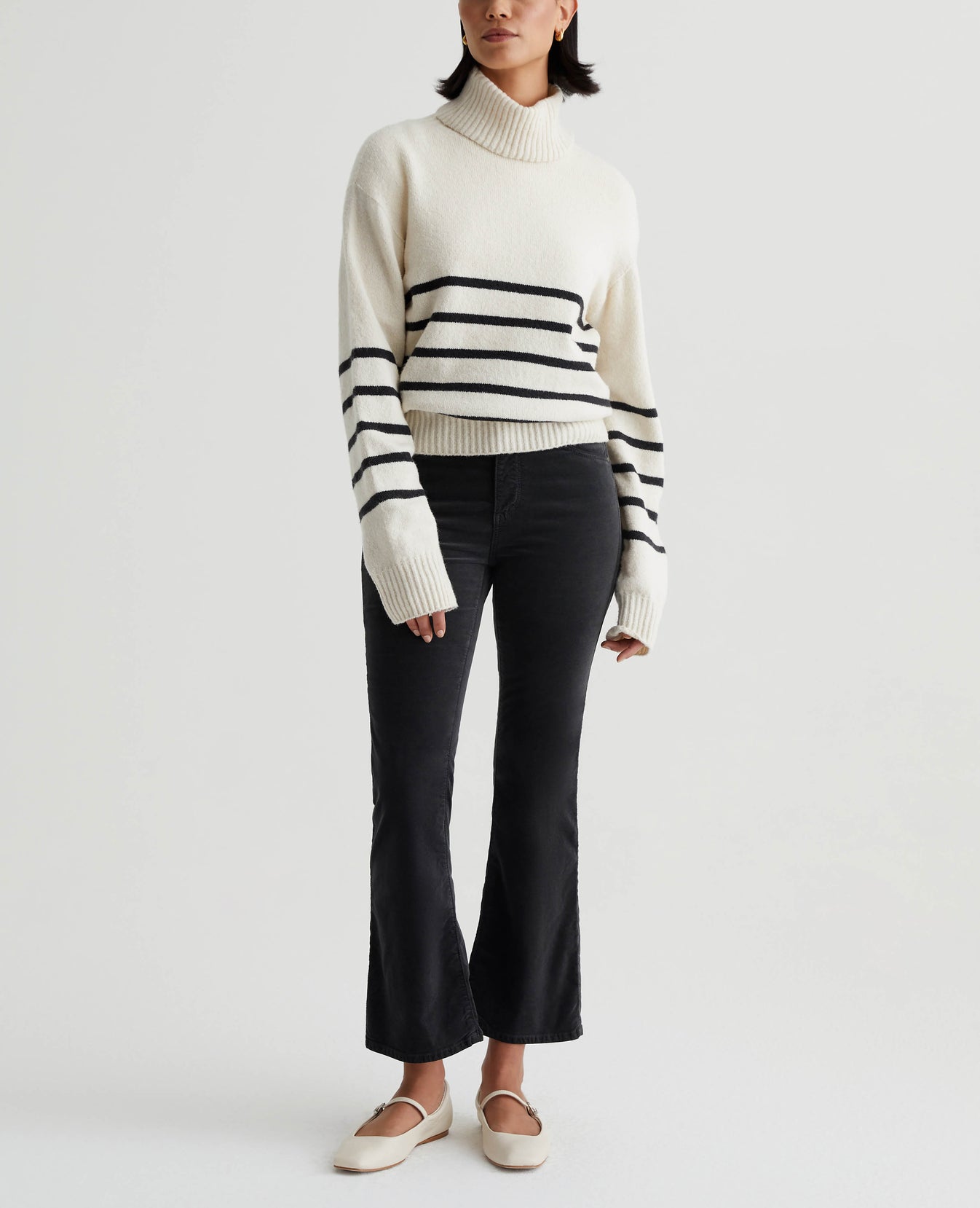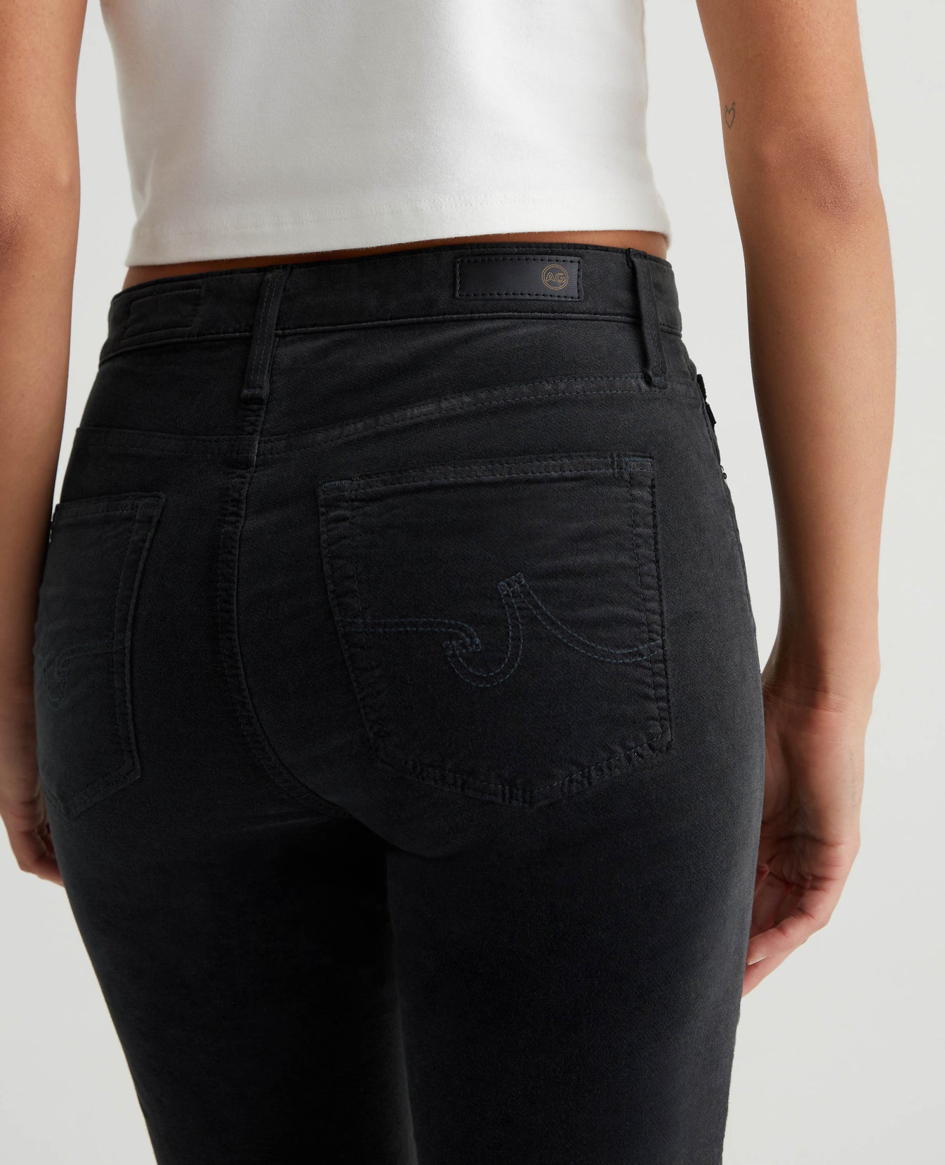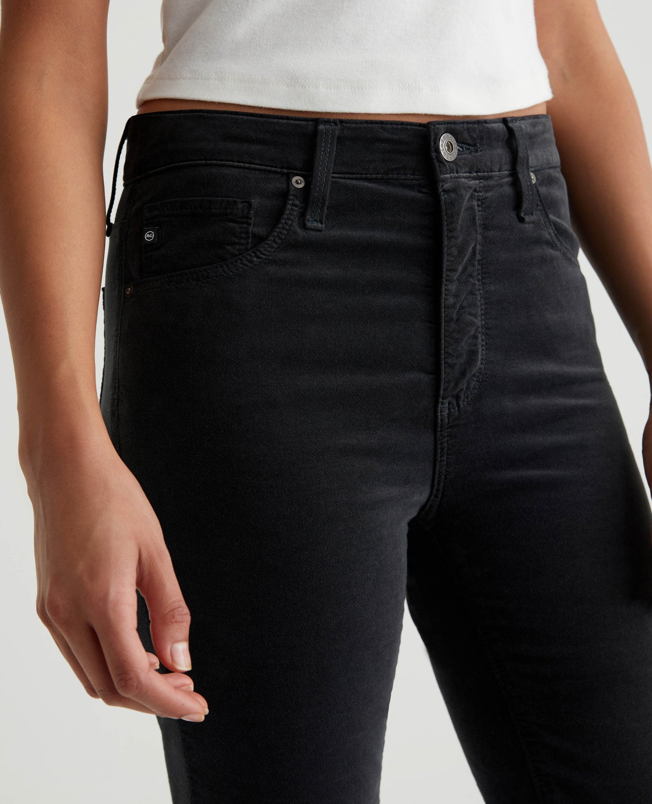 Our Farrah Boot Crop has a decadently soft feel in 7.5 oz. Opulent Stretch Velvet featuring a dark grey shade. Cut for a mid-rise bootcut silhouette in a cropped length, the pair has a skinny fit through the legs before opening into subtly flared hems.