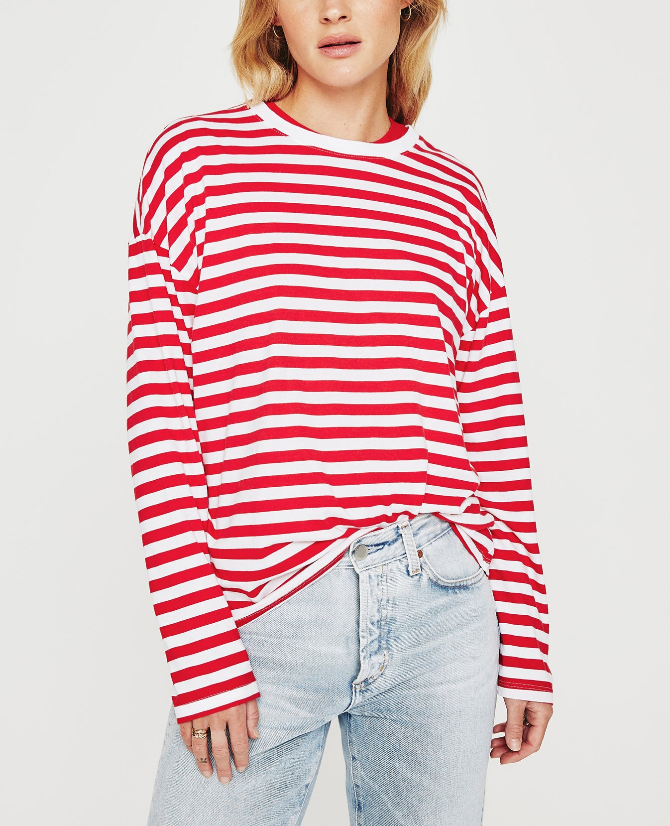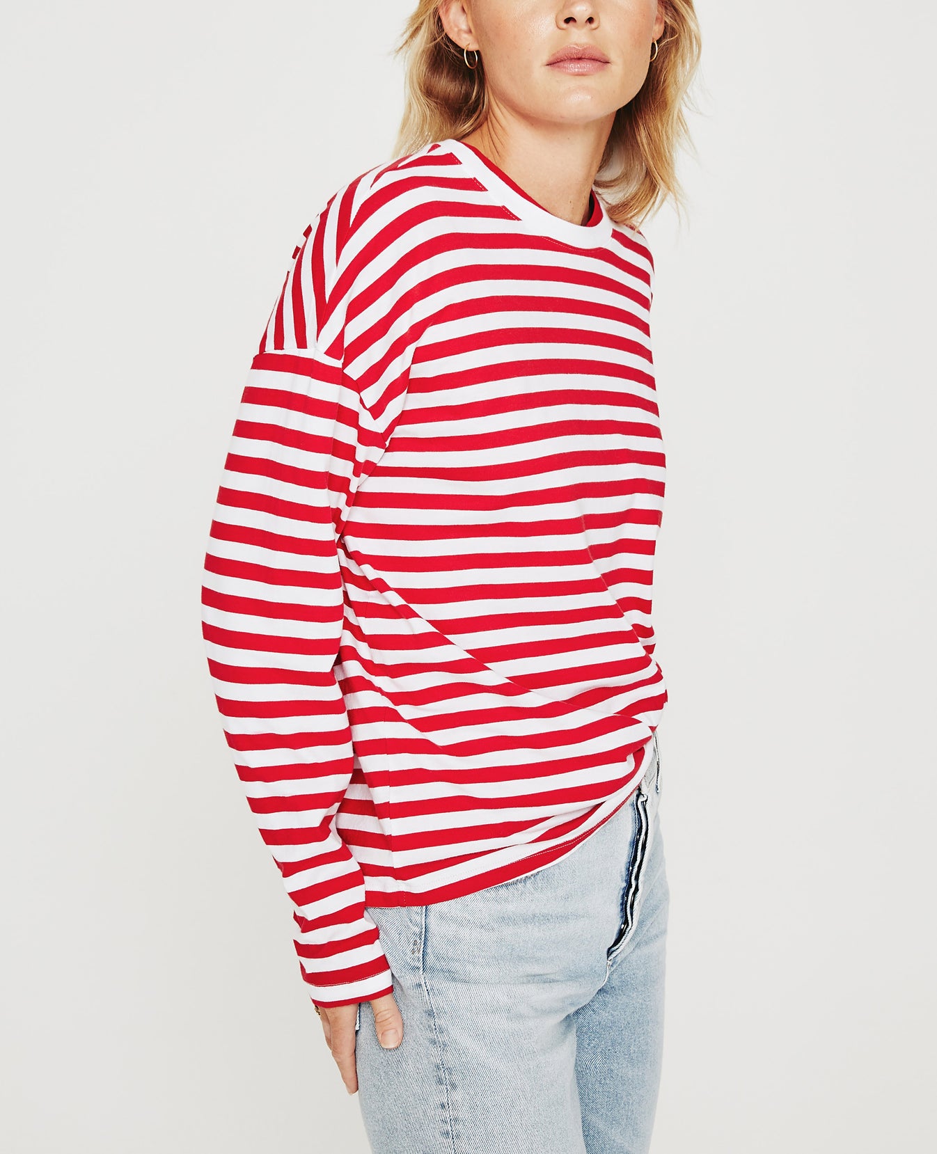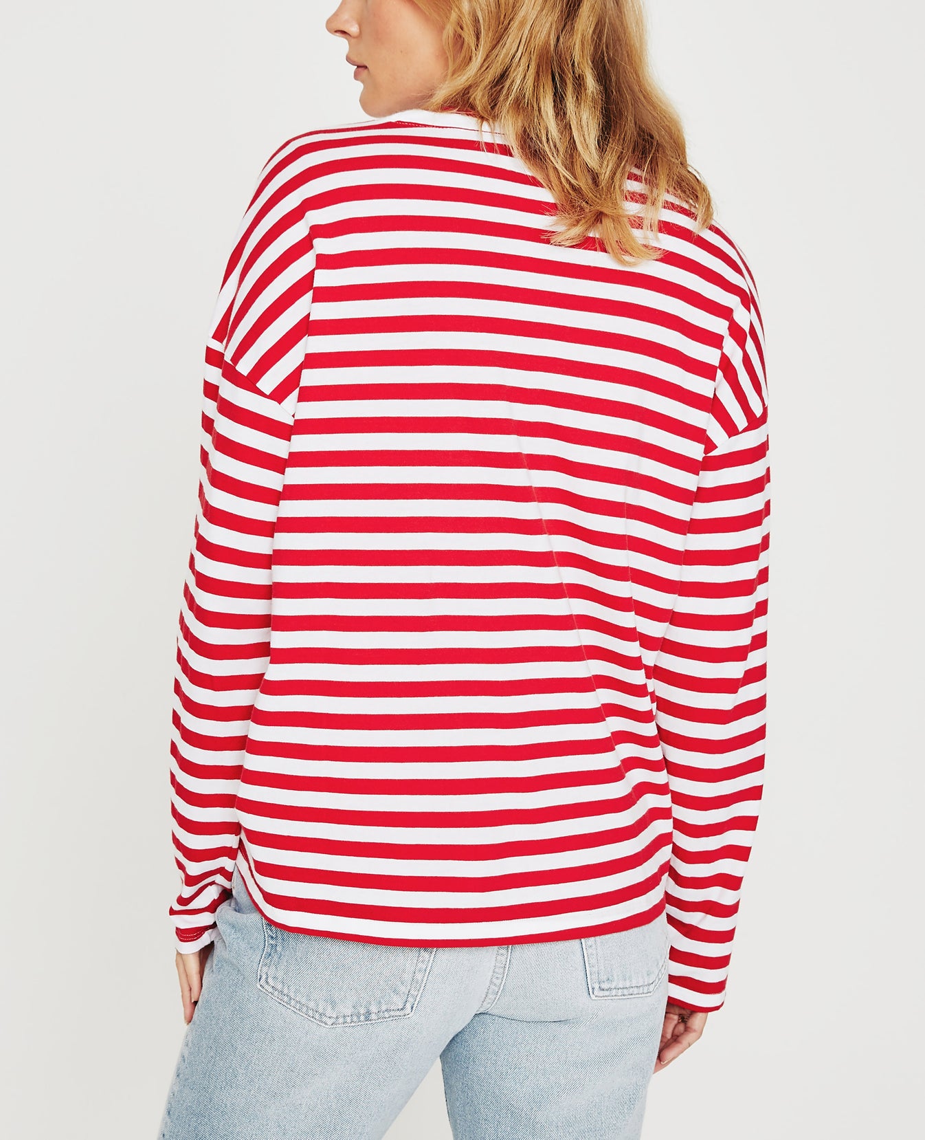 The Fay L/S Crew comes in a relaxed, easy fit with a crew neckline and dropped shoulder seams that accentuate the slouchy shape. Made from 100% cotton jersey, this women's long-sleeve tee features a red-and-white stripe pattern accented by solid white rib trim at the neckline.