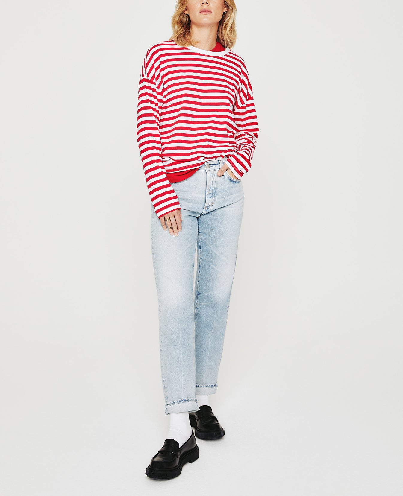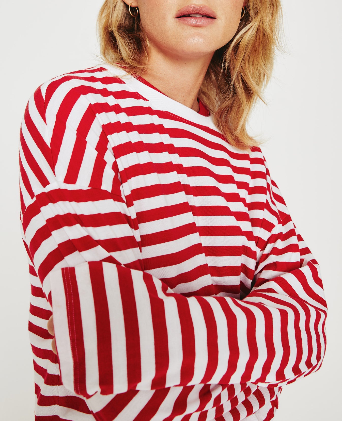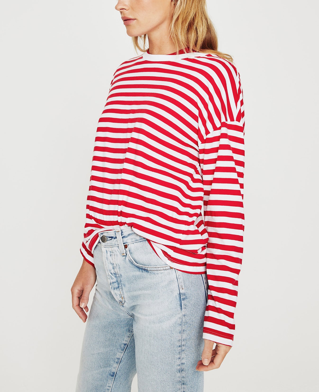 The Fay L/S Crew comes in a relaxed, easy fit with a crew neckline and dropped shoulder seams that accentuate the slouchy shape. Made from 100% cotton jersey, this women's long-sleeve tee features a red-and-white stripe pattern accented by solid white rib trim at the neckline.