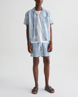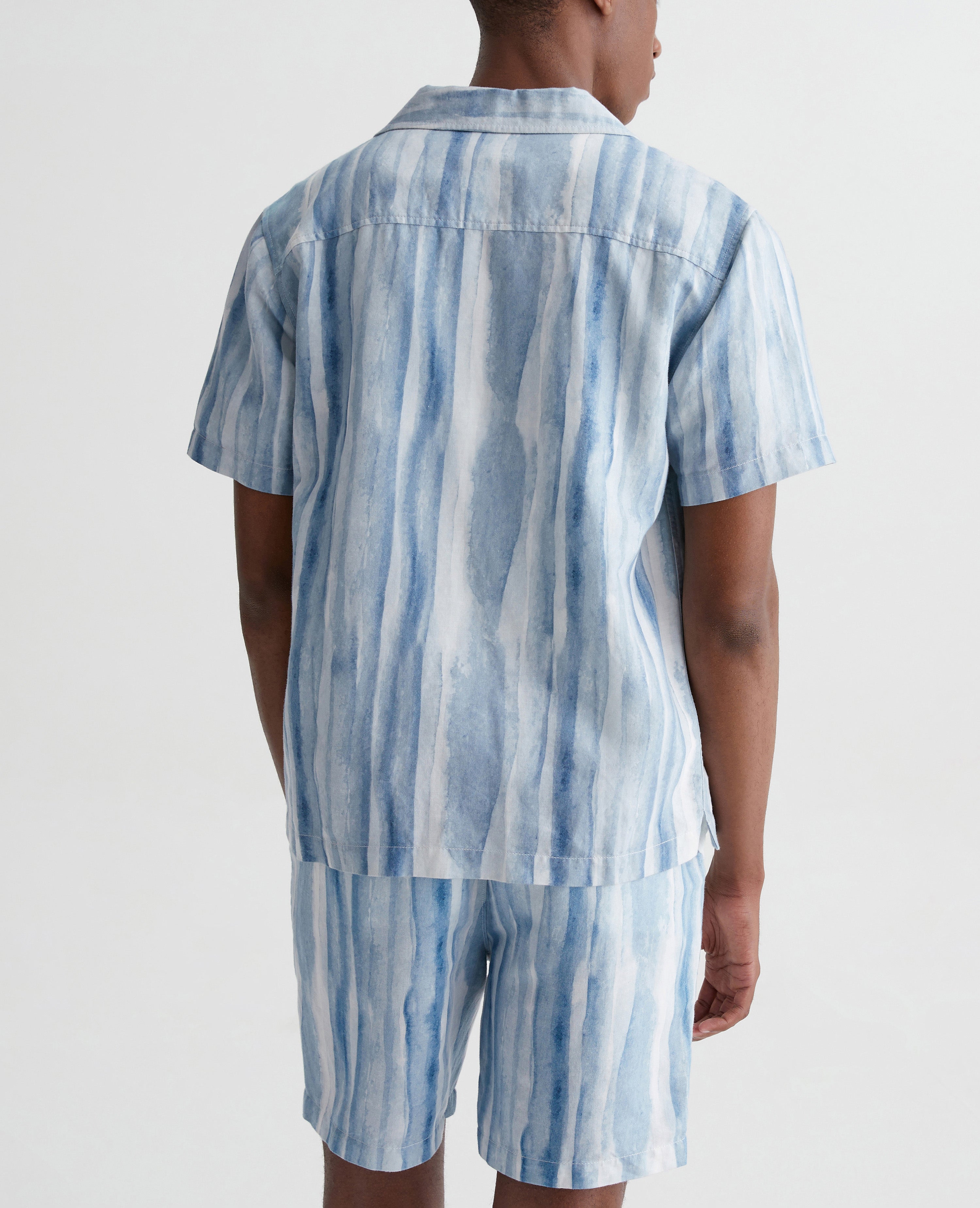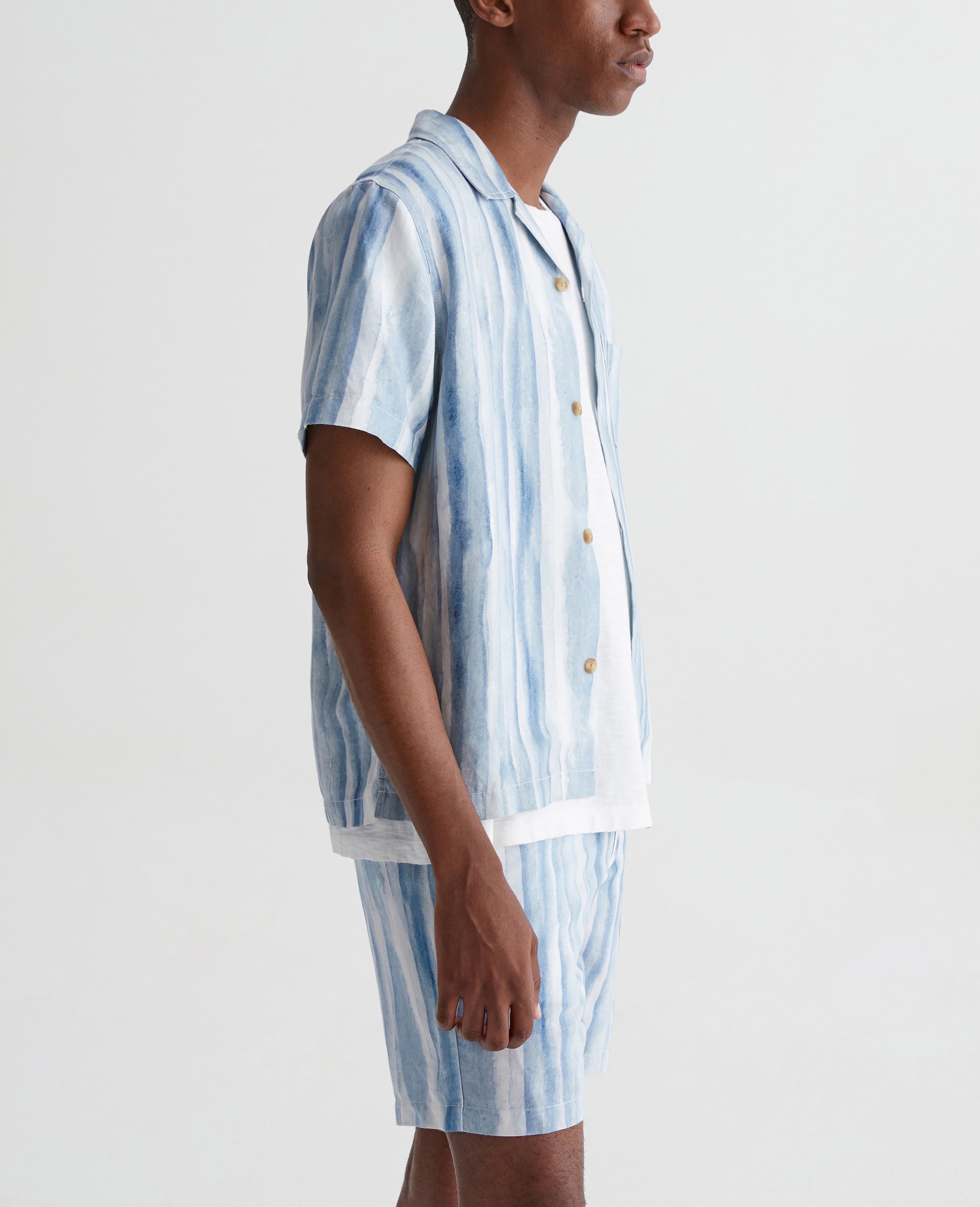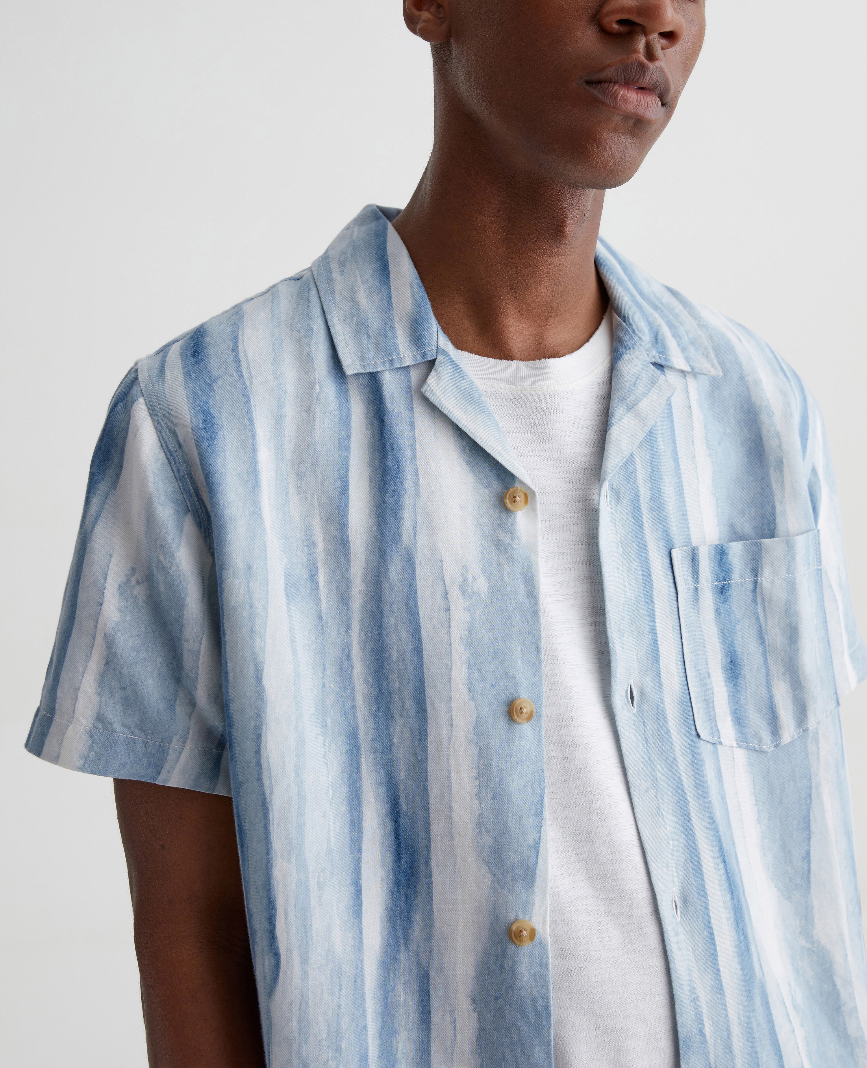 The Foster Shirt is a summer-ready camp collar style with short sleeves, buttons up the front, and a single chest pocket. Made from a lightweight blend of cotton and linen in an inky stripe pattern, it’s cool and casual yet easy to dress up.