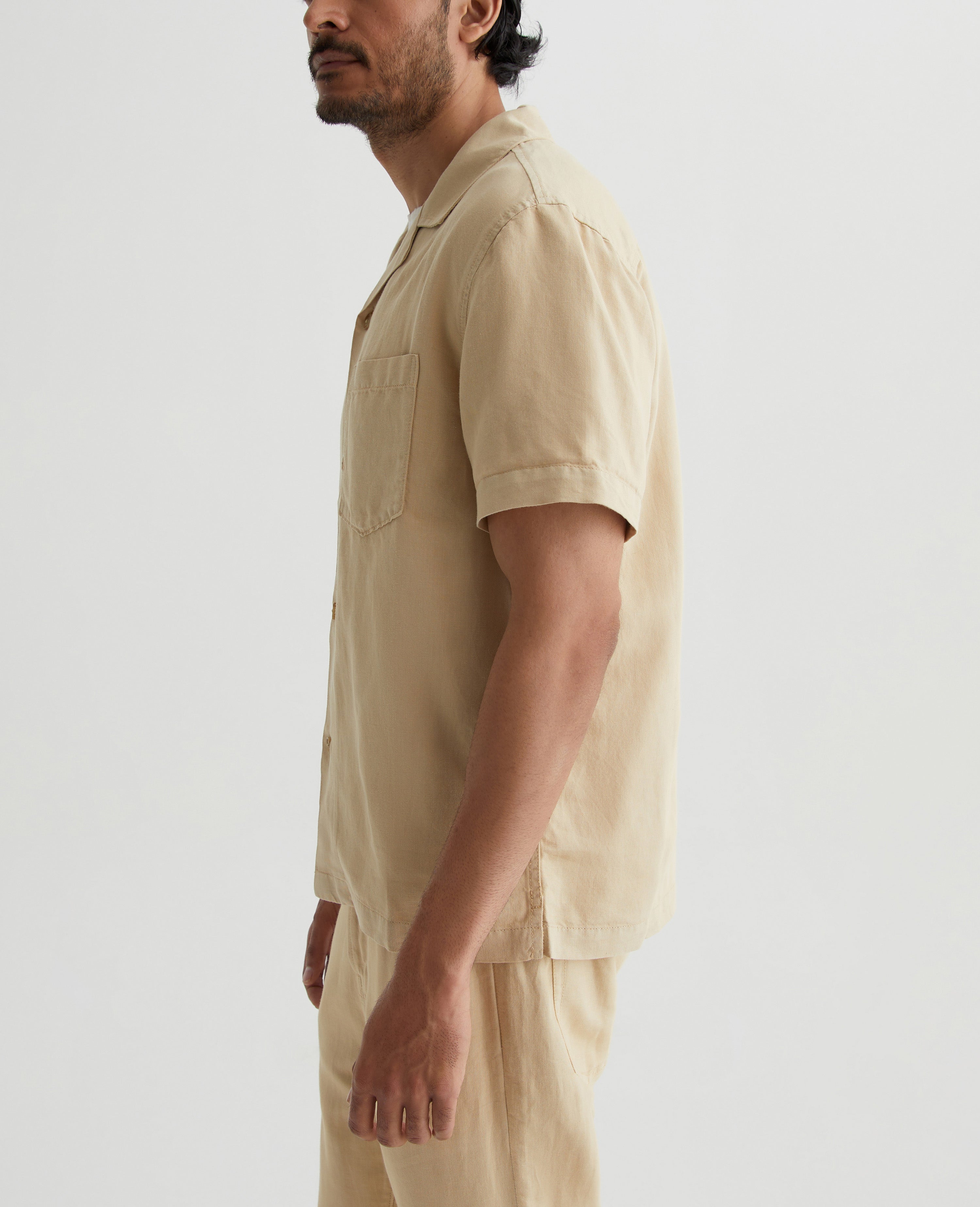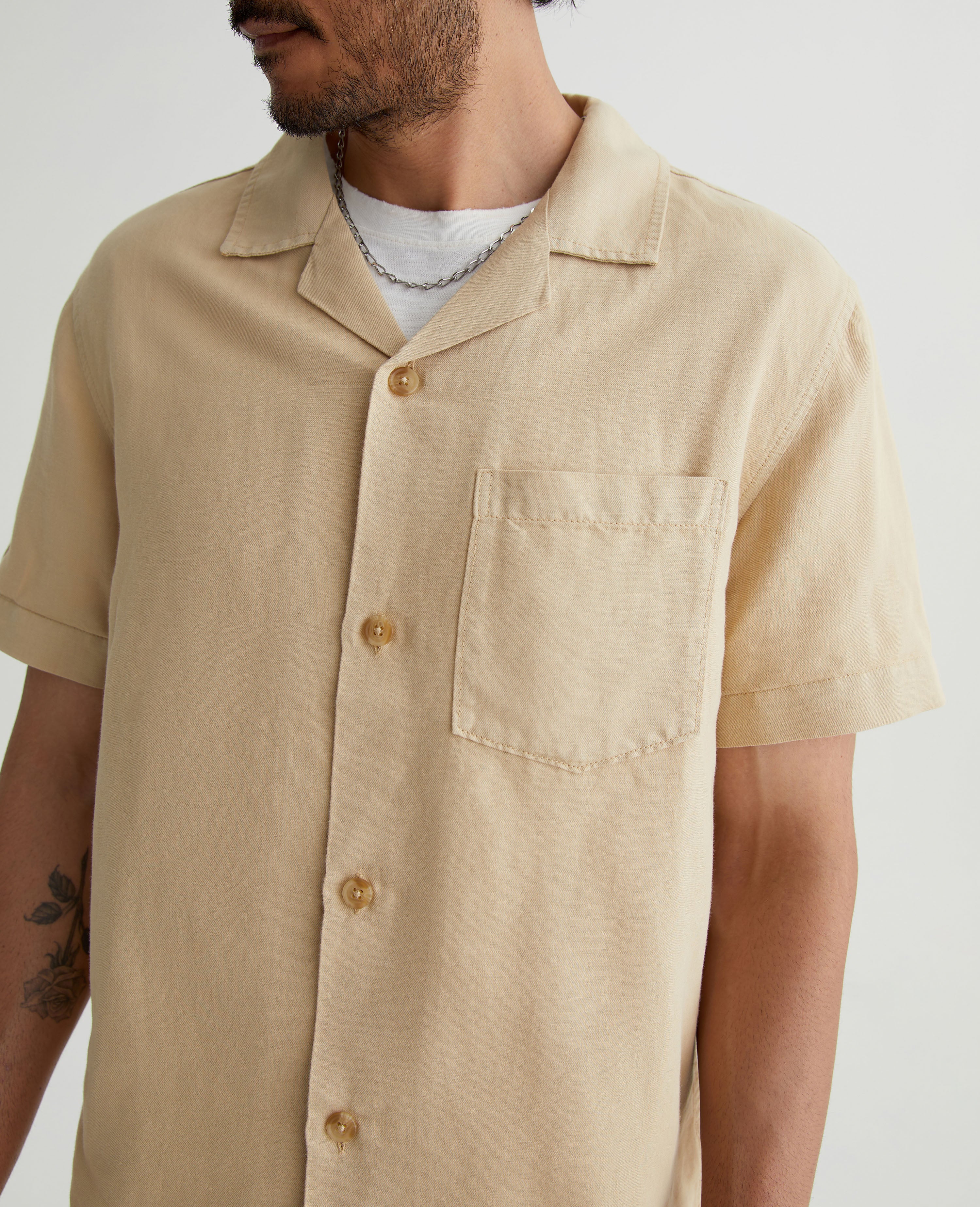 The Foster Shirt is a summer-ready camp collar style with short sleeves, buttons up the front, and a single chest pocket. Made from a lightweight blend of cotton and linen in a warm khaki shade, it’s cool and casual yet easy to dress up.