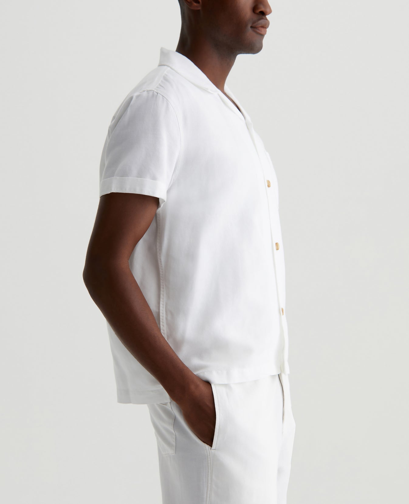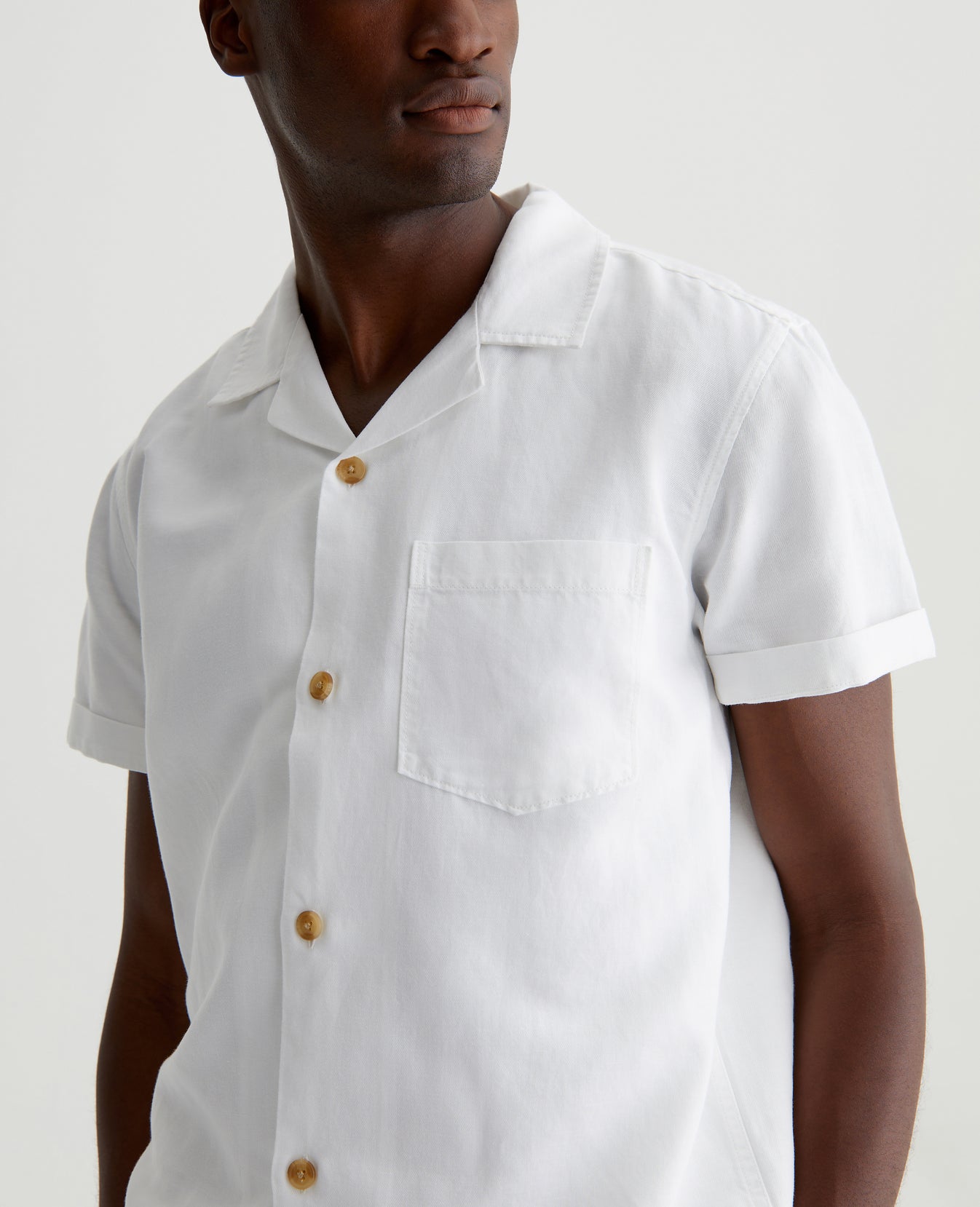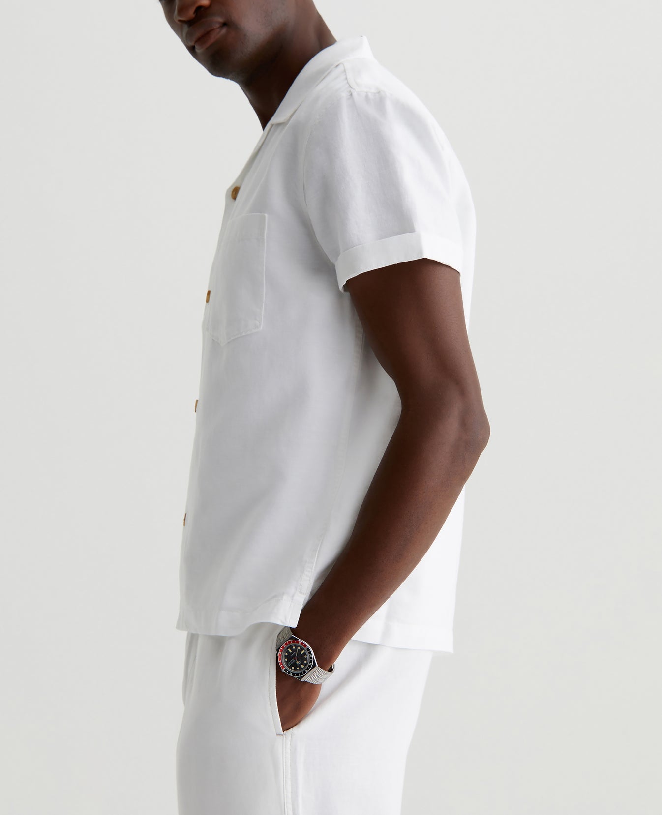 The Foster Shirt is a summer-ready camp collar style with short sleeves, buttons up the front, and a single chest pocket. Made from a lightweight blend of cotton and linen in white, it’s cool and casual yet easy to dress up.