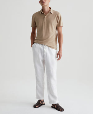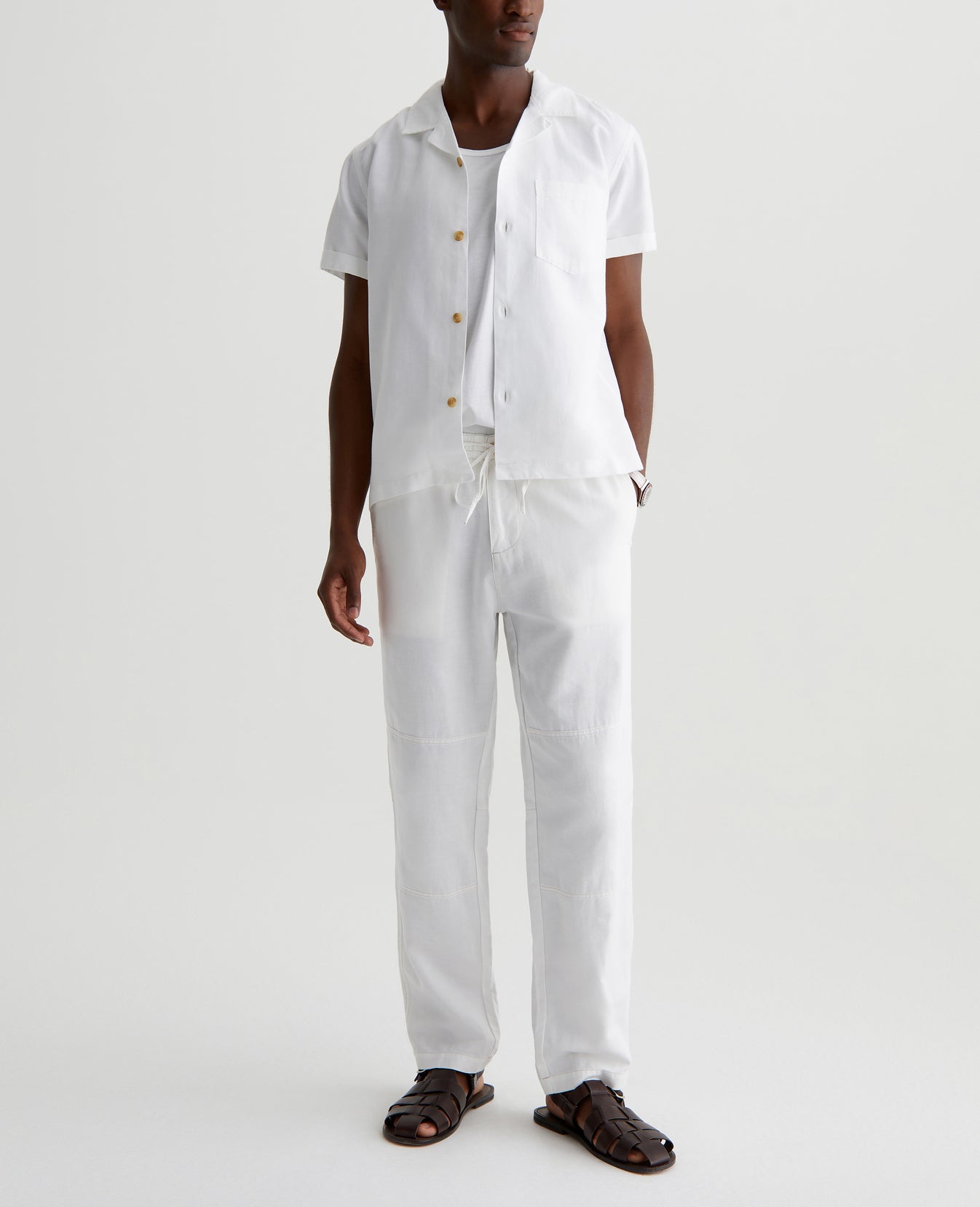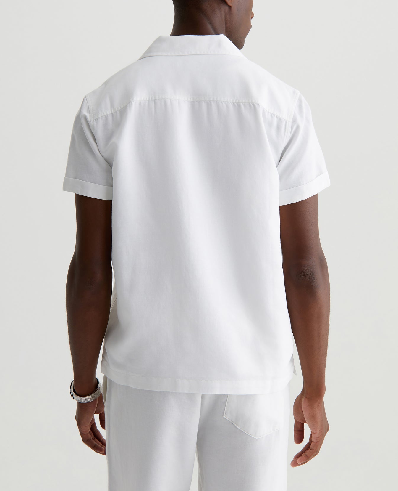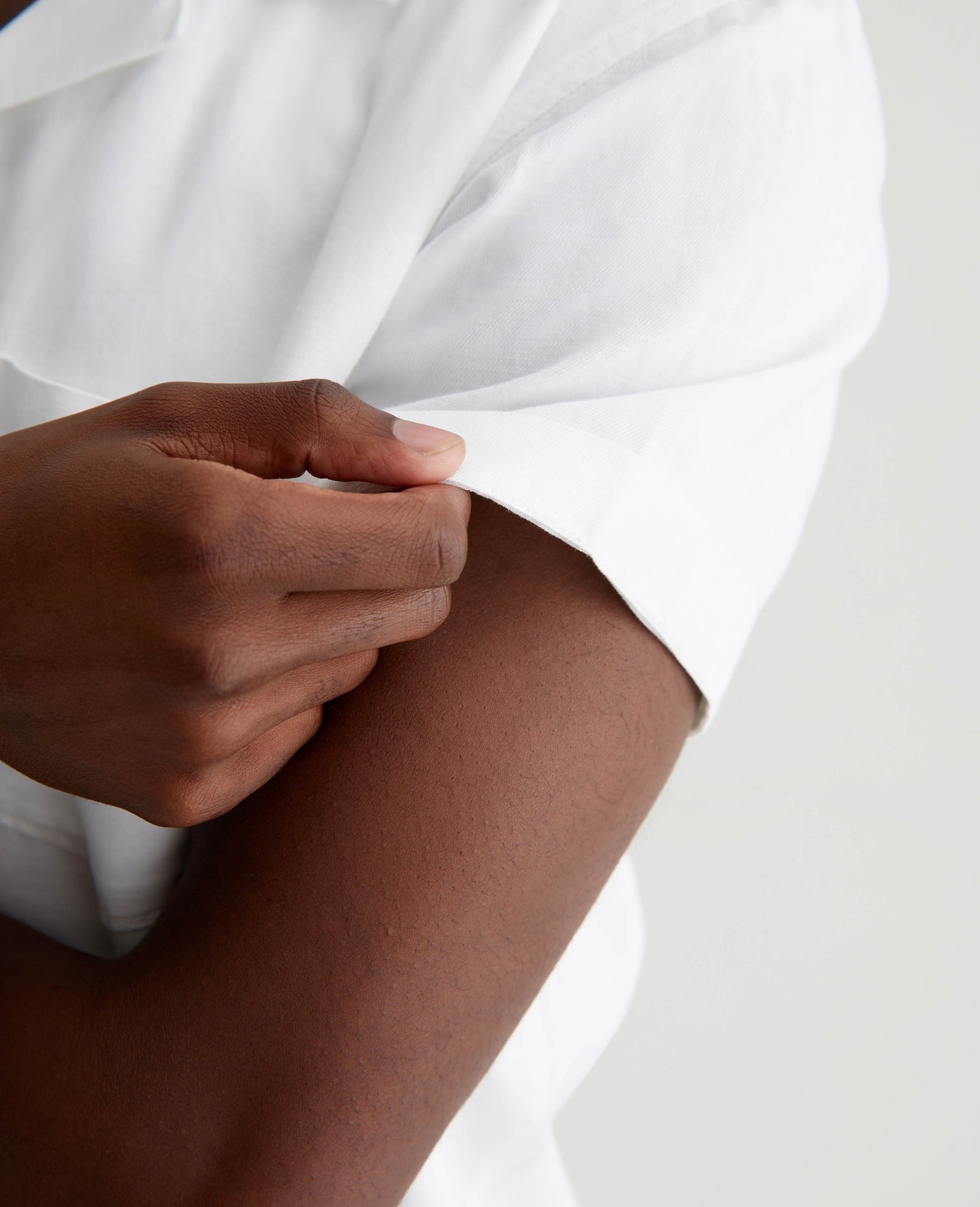 The Foster Shirt is a summer-ready camp collar style with short sleeves, buttons up the front, and a single chest pocket. Made from a lightweight blend of cotton and linen in white, it’s cool and casual yet easy to dress up.