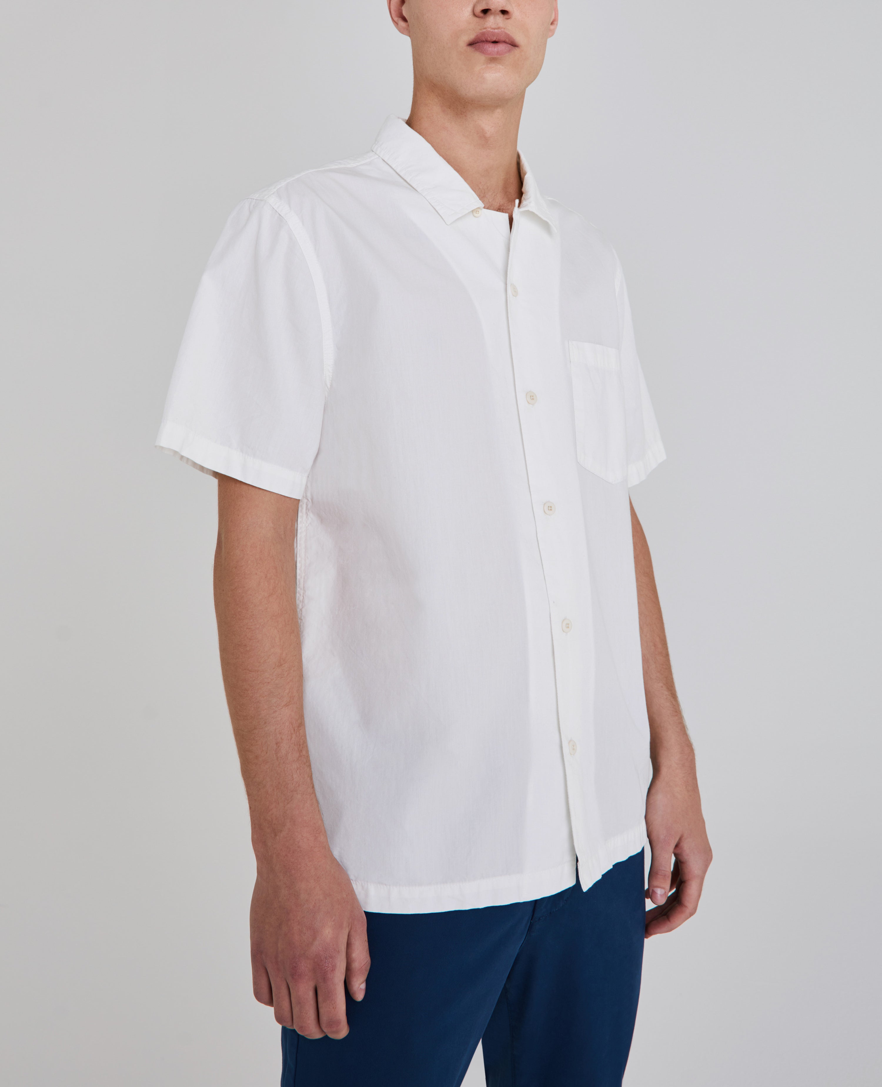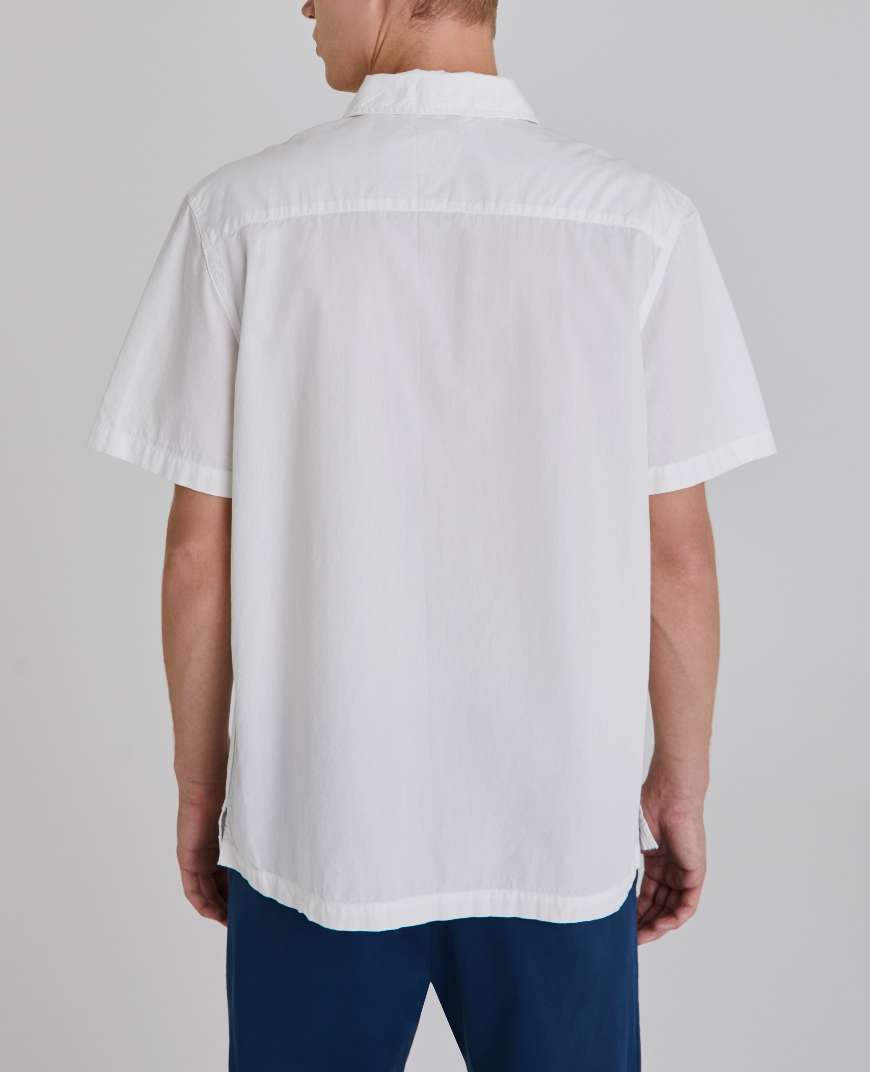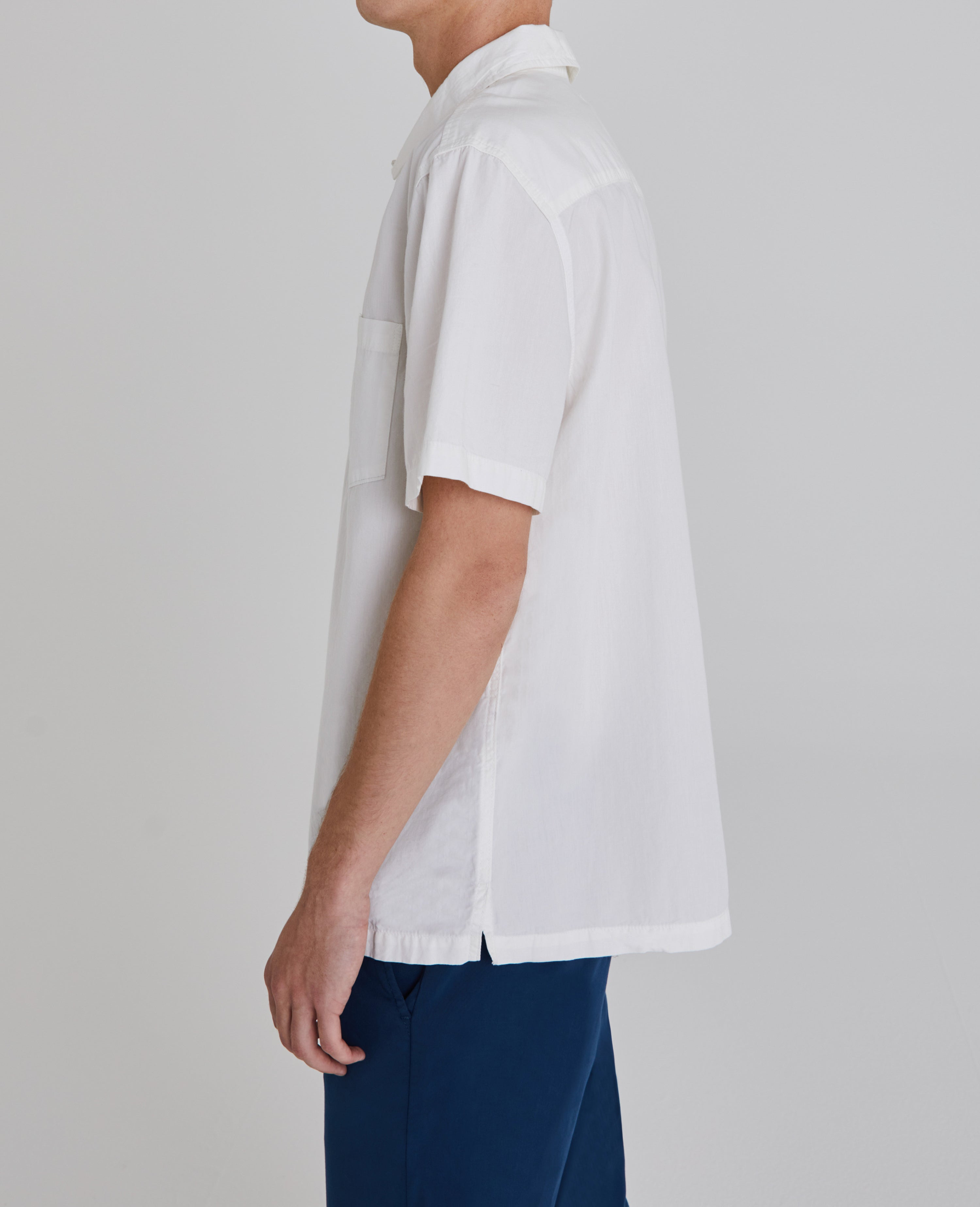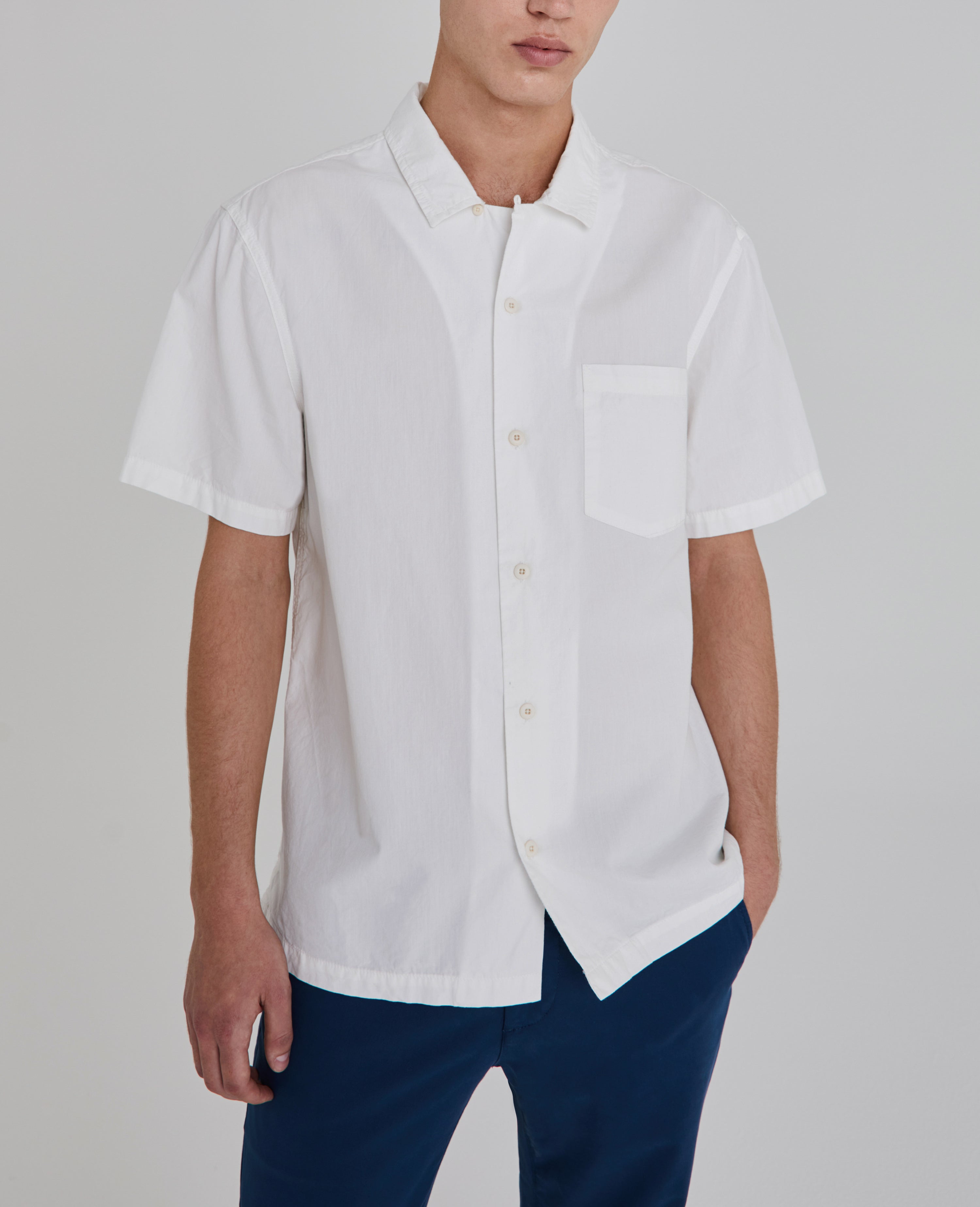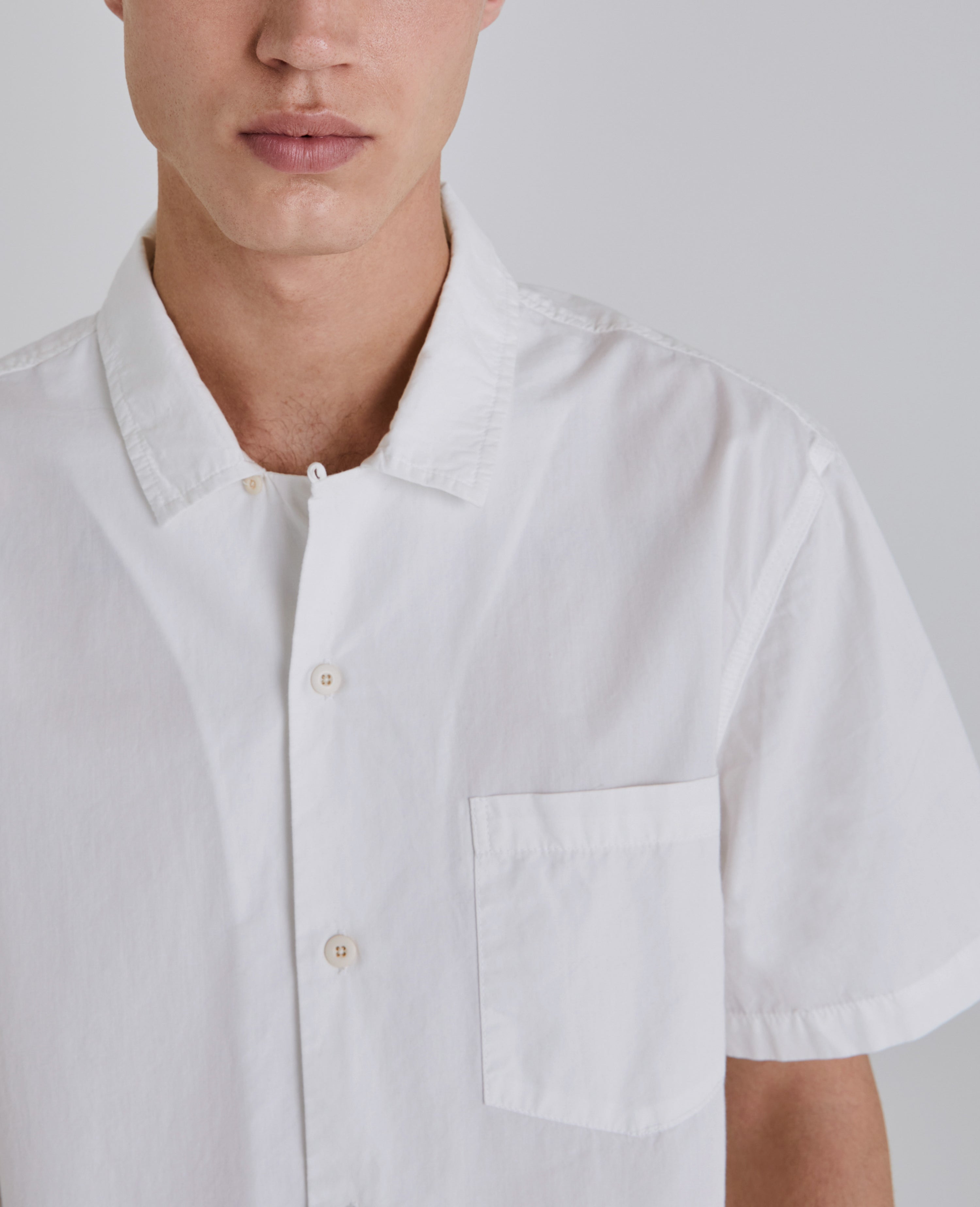 The Foster Shirt features a muted off-white hue, retro-inspired camp collar shirt silhouette, button up closure, and short sleeves. The Foster has been updated with a boxier fit and wider sleeves for a comfortable modern-vintage feel. This men's button up short sleeve is designed in a lightweight 100% cotton fabric made from organic fibers that are uniquely knitted for premium dye and print applications.