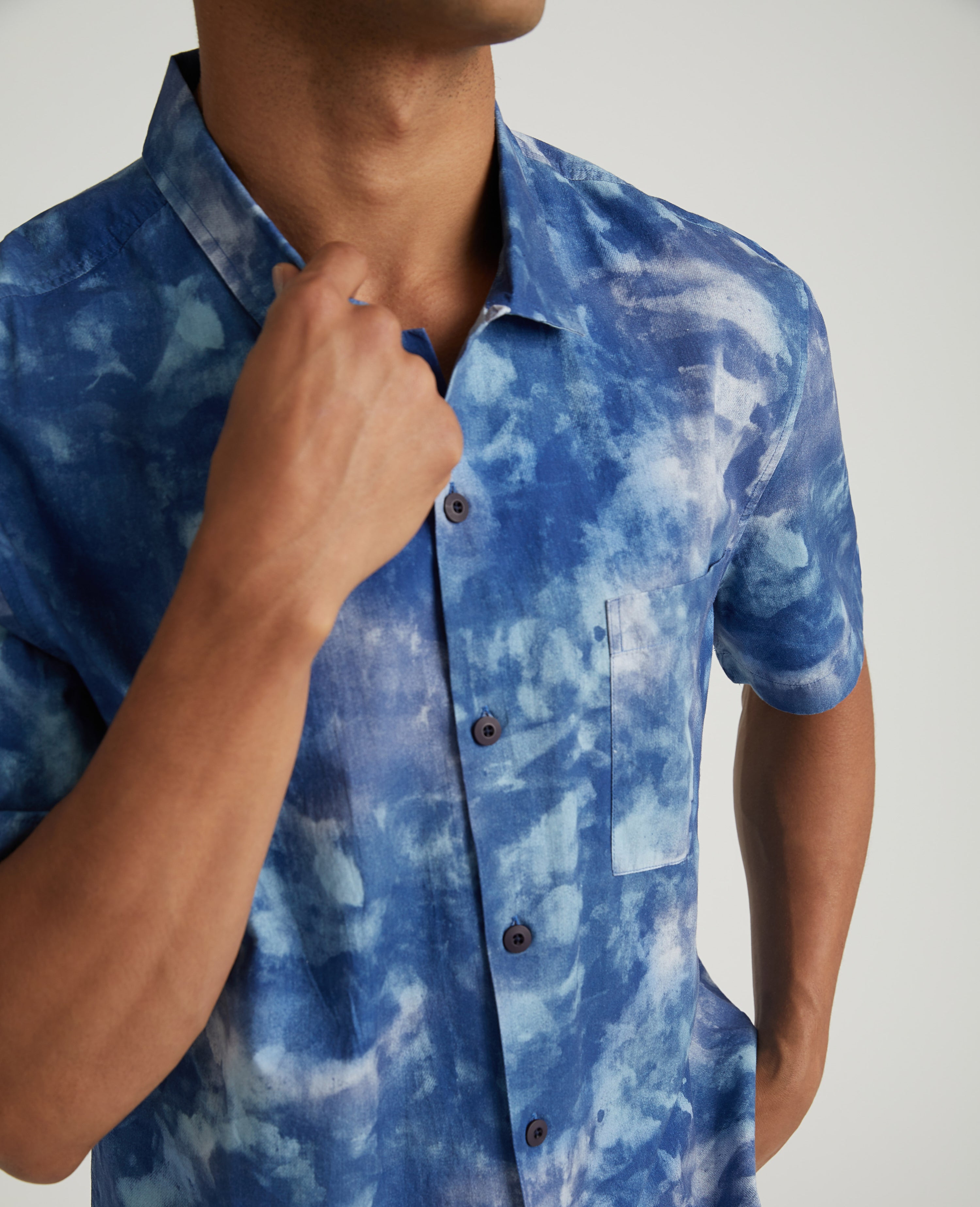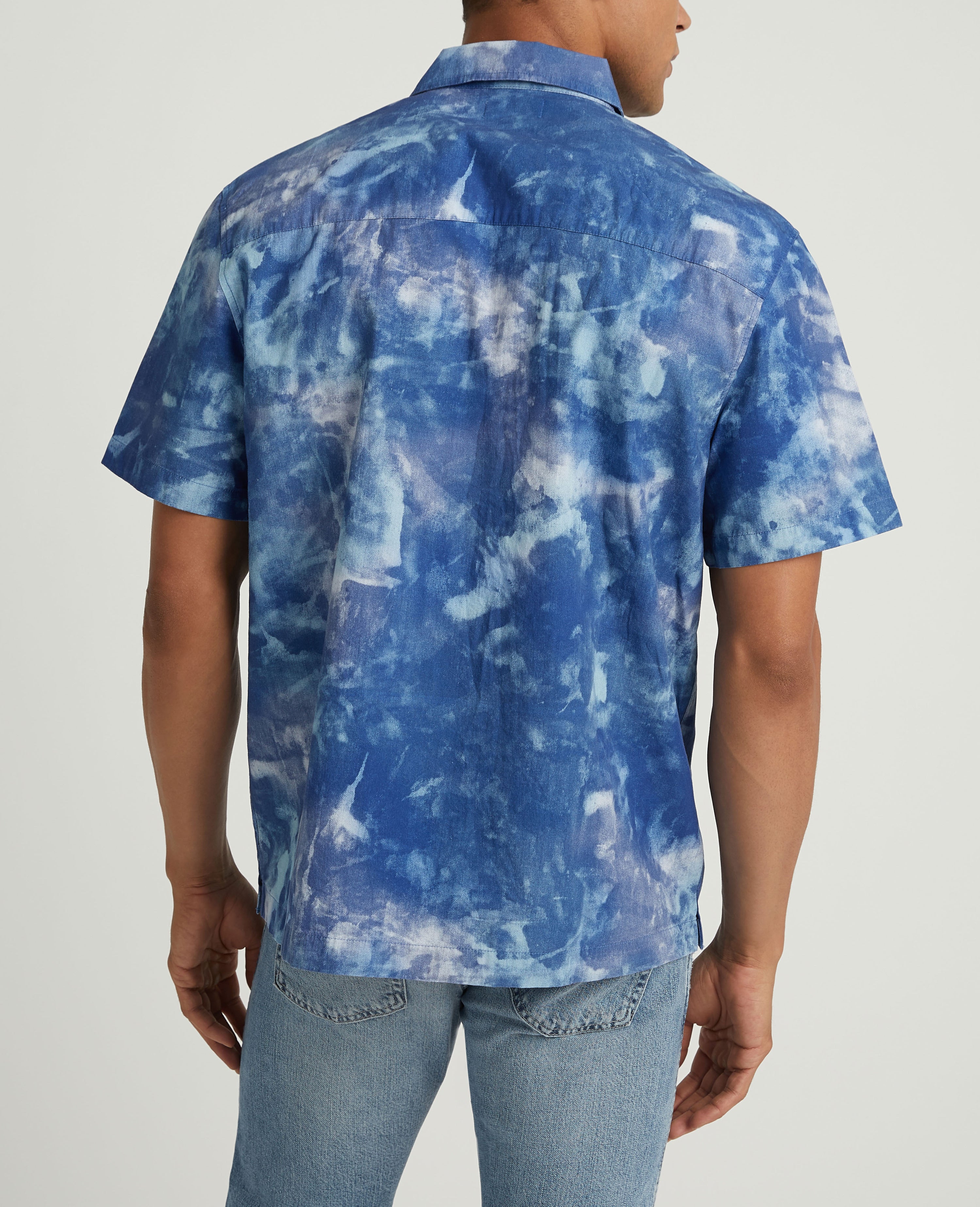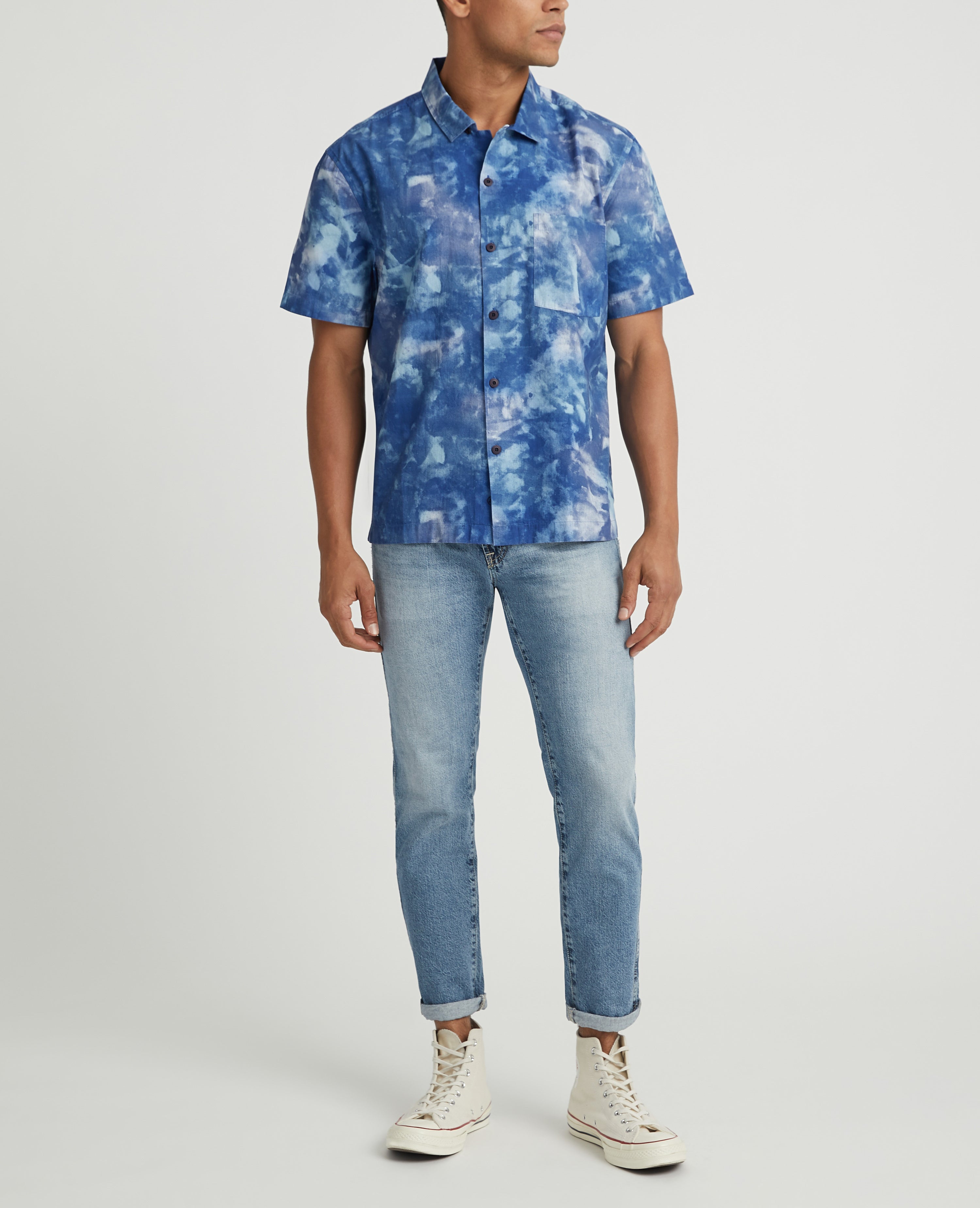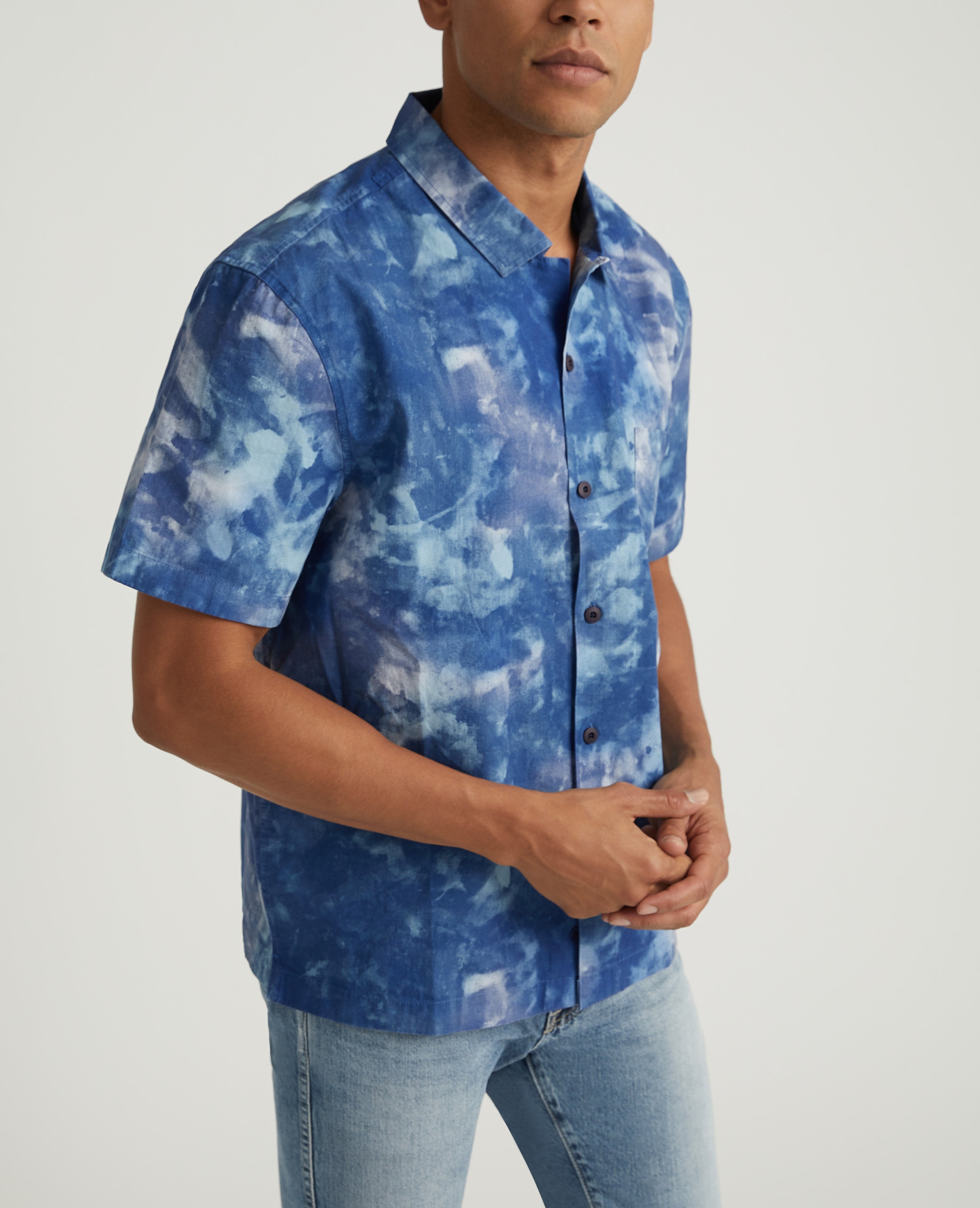 The Foster Shirt features a vibrant ocean blue tie-dye treatment that revisits the eclectic 80s, retro-inspired camp collar shirt silhouette, button up closure, and short sleeves. The Foster has been updated with a boxier fit and wider sleeves for a comfortable modern-vintage feel. This men's button up short sleeve is designed in a lightweight 100% cotton fabric made from organic fibers that are uniquely knitted for premium dye and print applications.