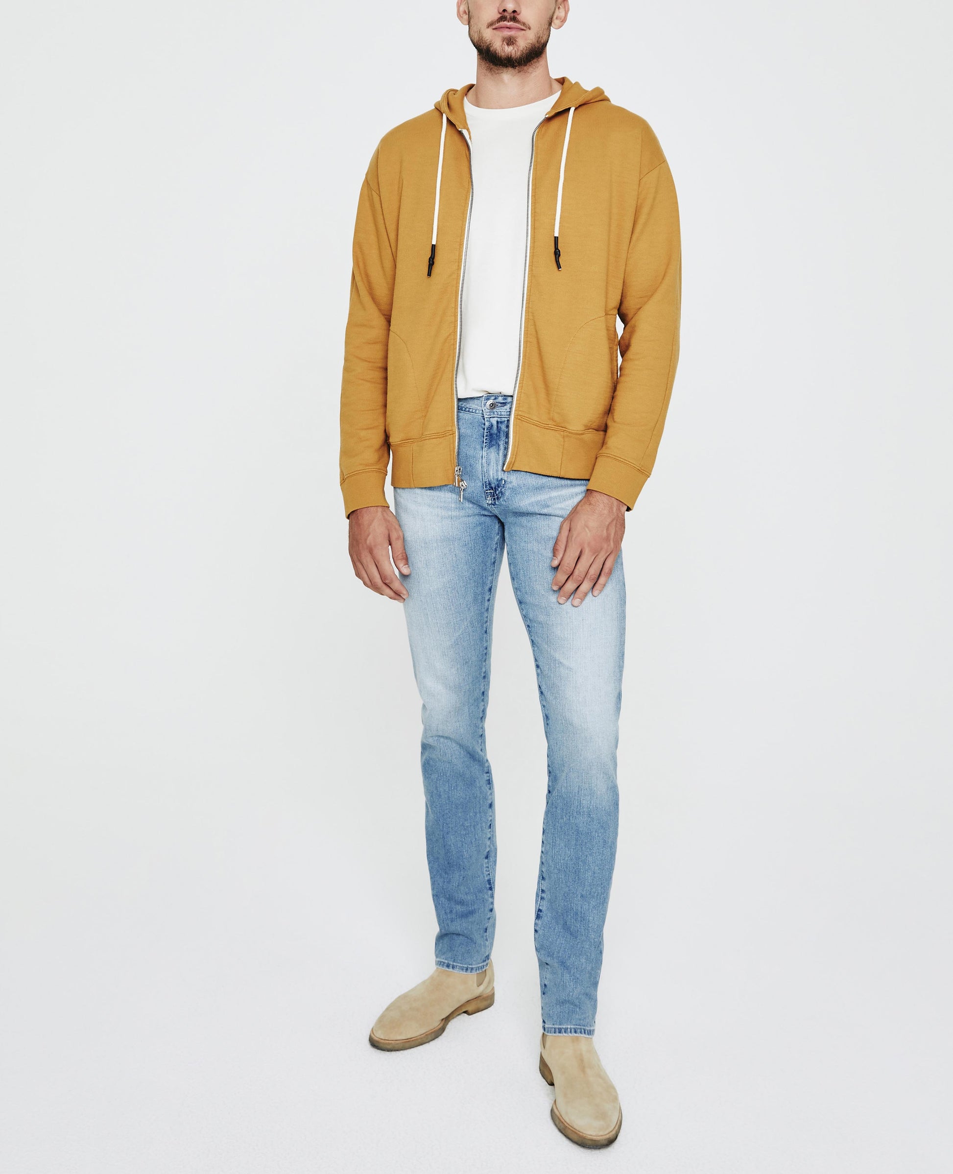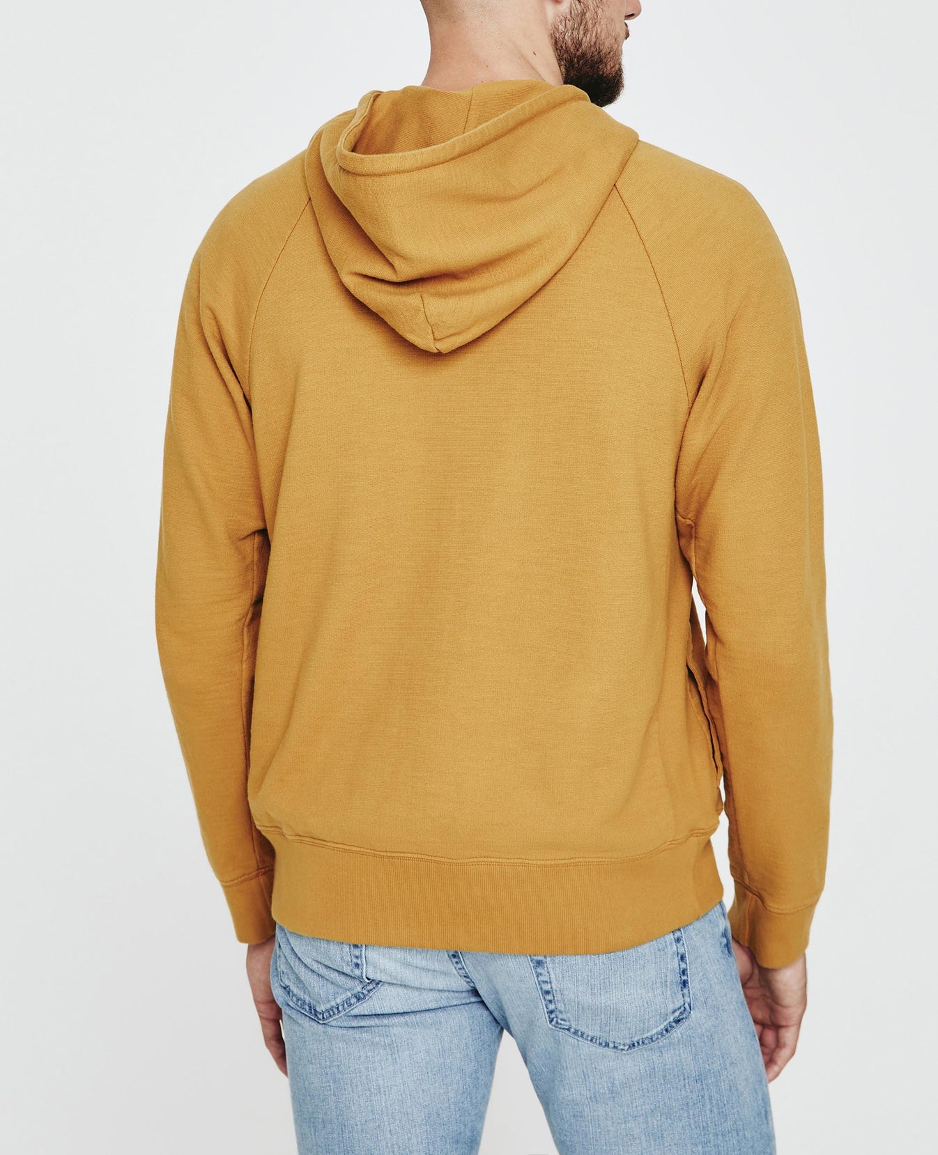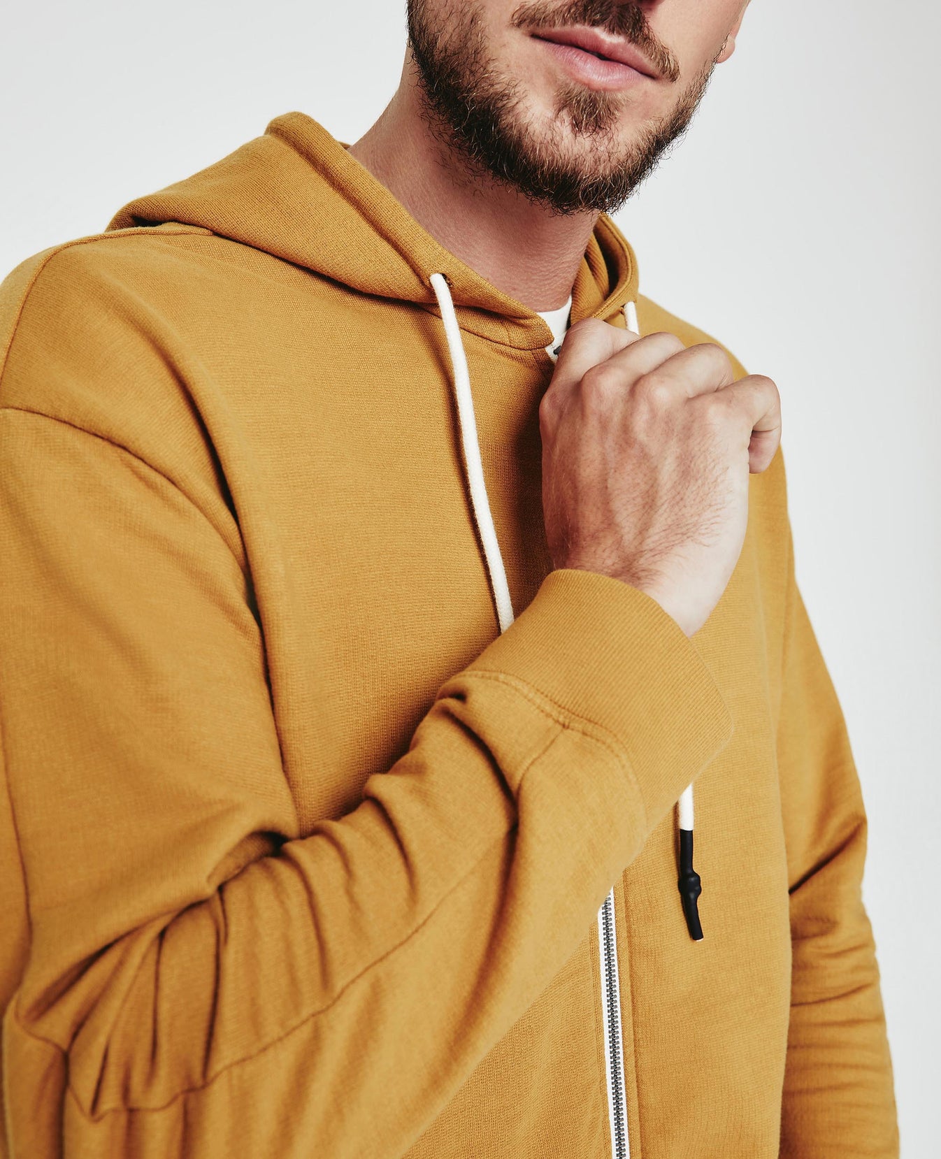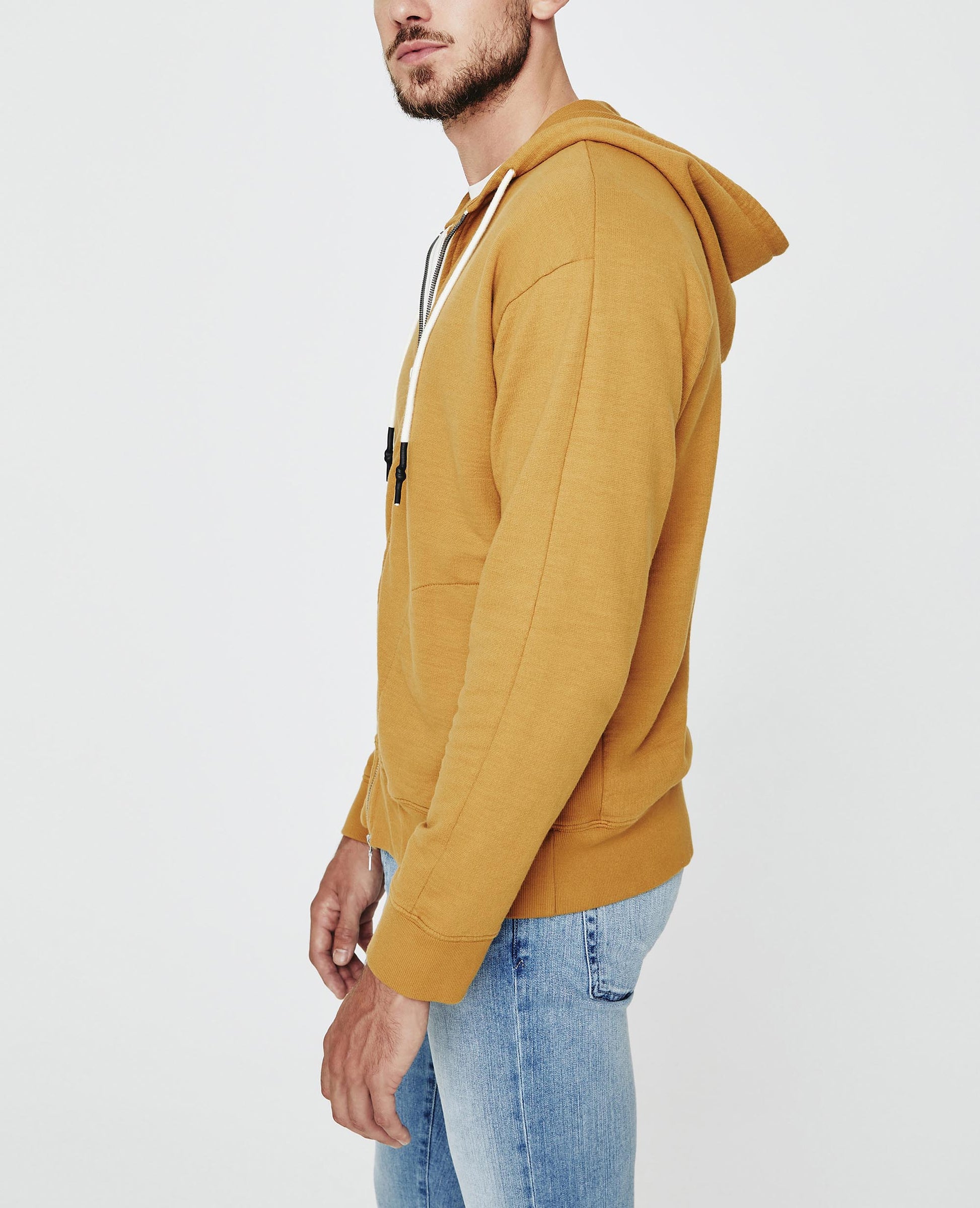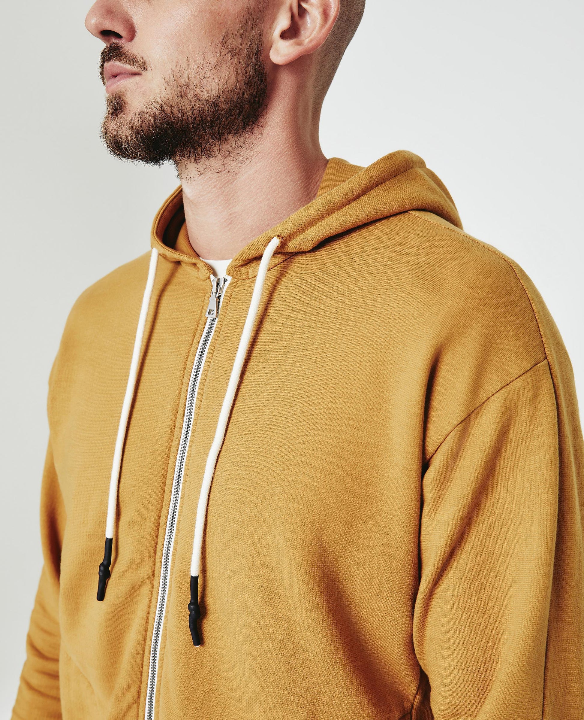 The Garo Zip Hoodie for men features an army surplus hue with a vintage appeal, cut in a slubby relaxed silhouette with drop shoulders, natural drawstring with dipped ends, patch pockets, retro ribbed waist, and cuffed sleeves. This men's zip up is designed in an exclusive AG-made terry featuring a lightweight feel, ultra-soft touch, and a color-rich finish.