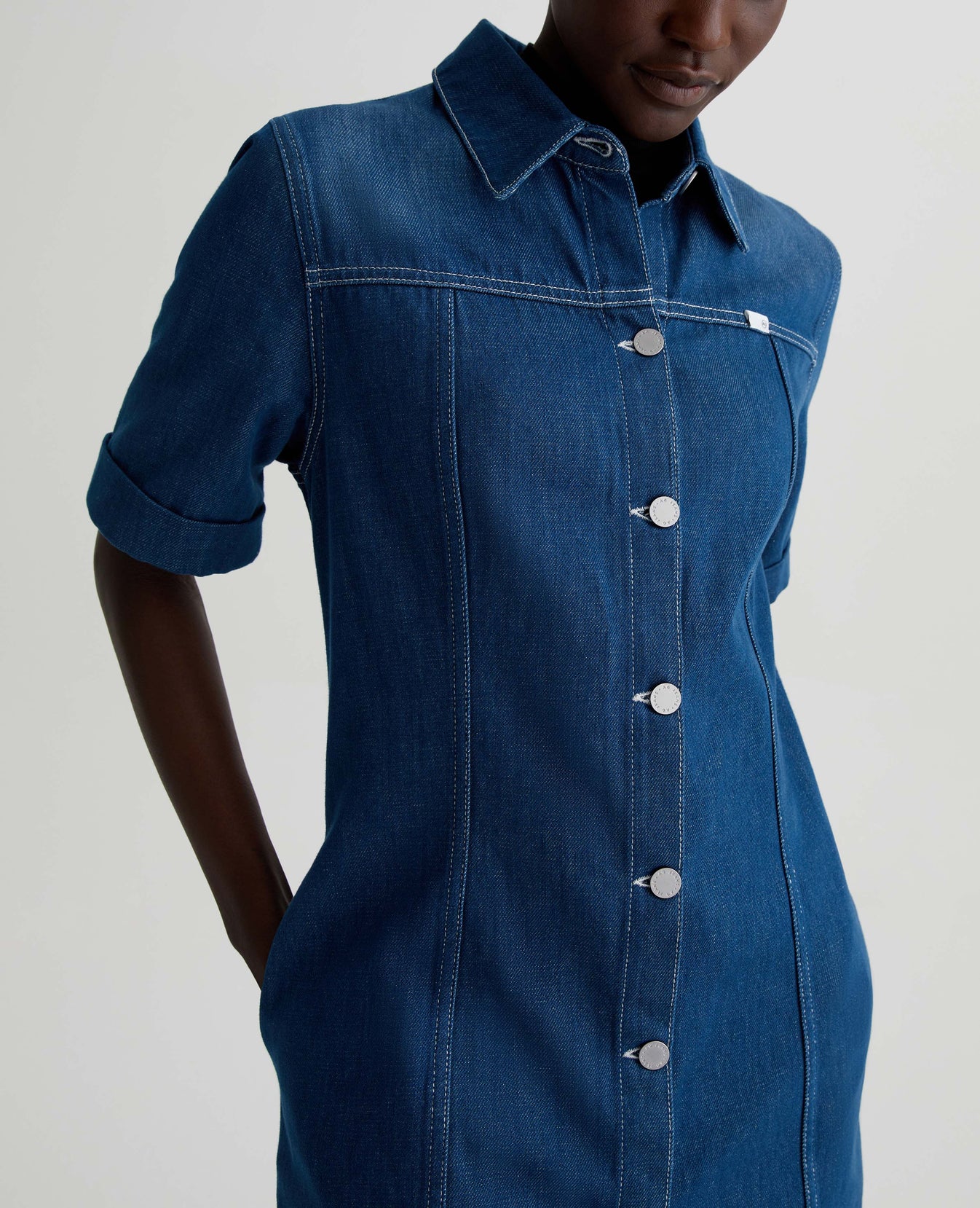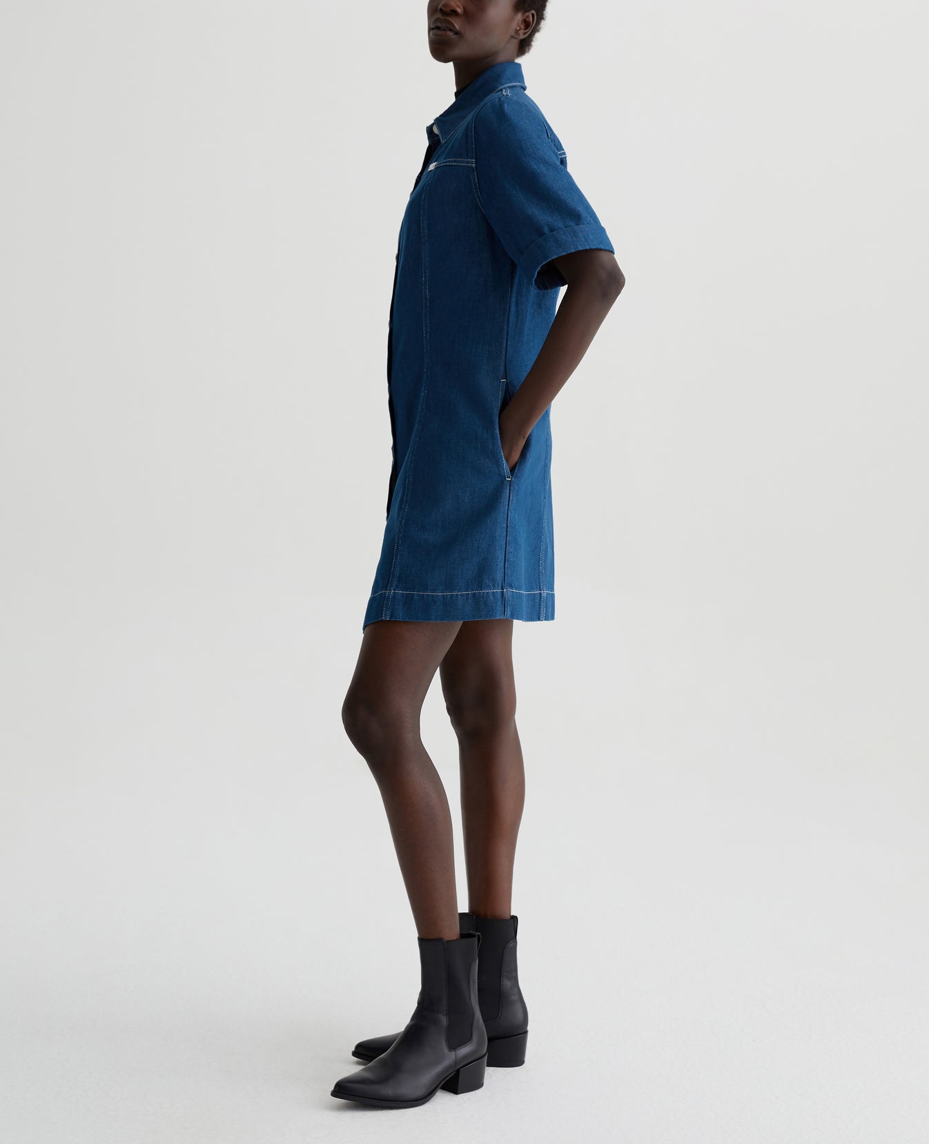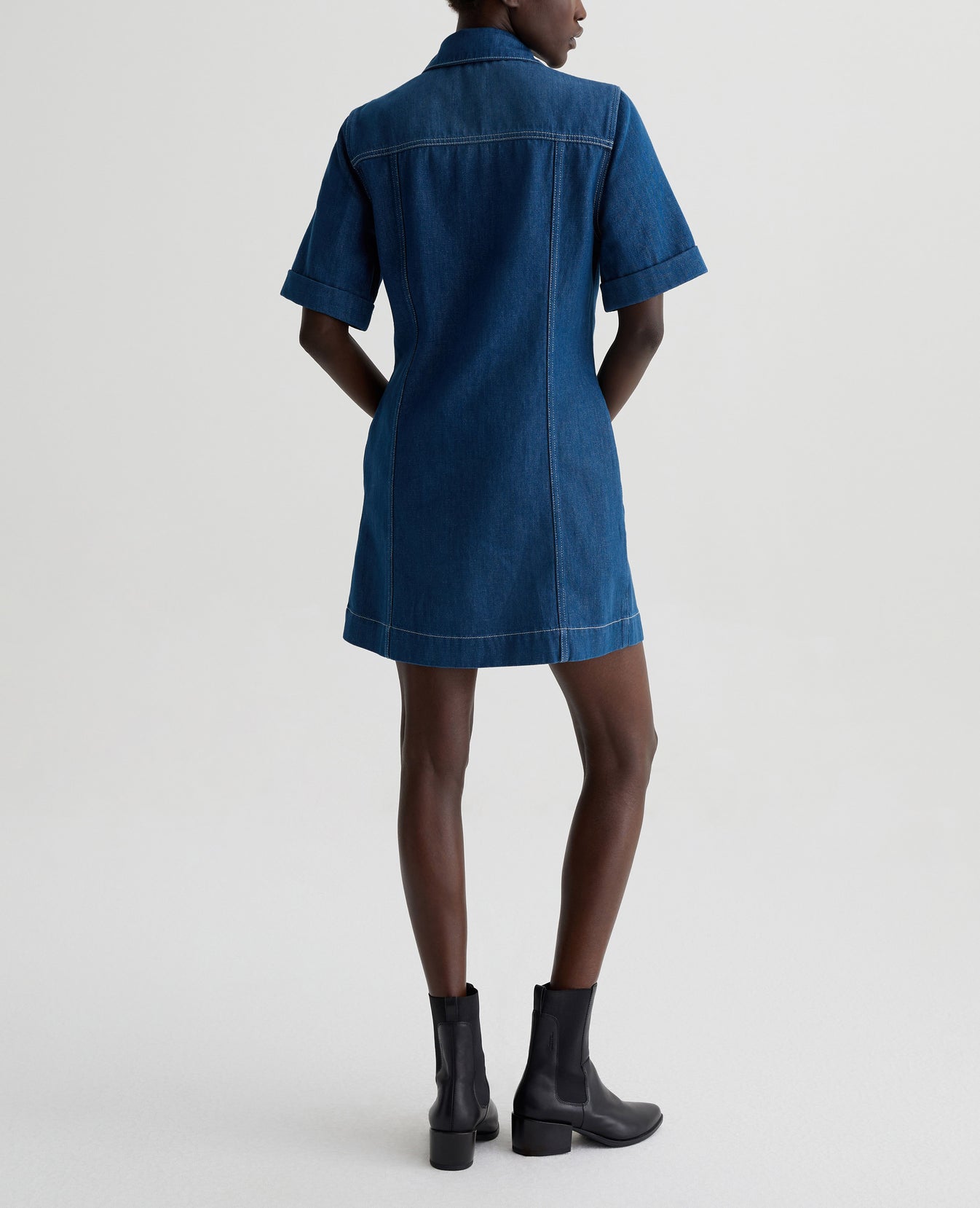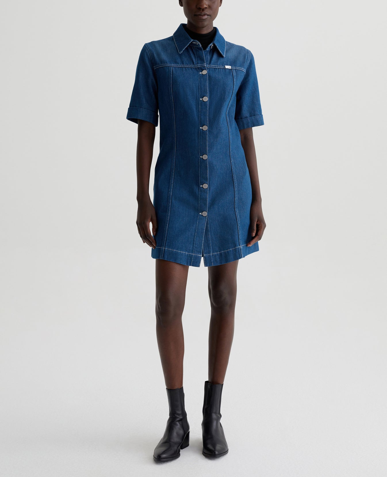 The Glenn Dress is a retro-inspired A-line silhouette that buttons at the front, so you can wear it solo or layered year-round. The short-sleeve style comes in 11.75 oz. Vintage Crosshatch Denim with rigid non-stretch construction and a bright blue wash. Contrast stitching and subtle fading at the shoulders complete the look.