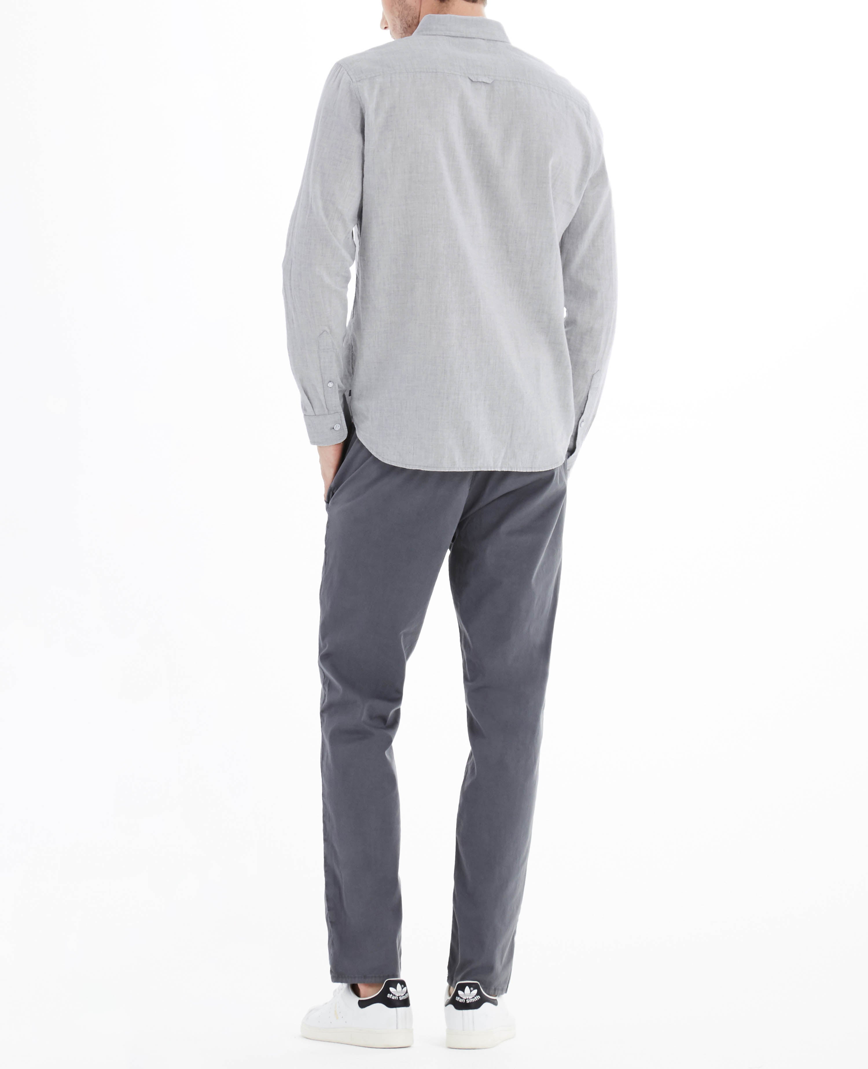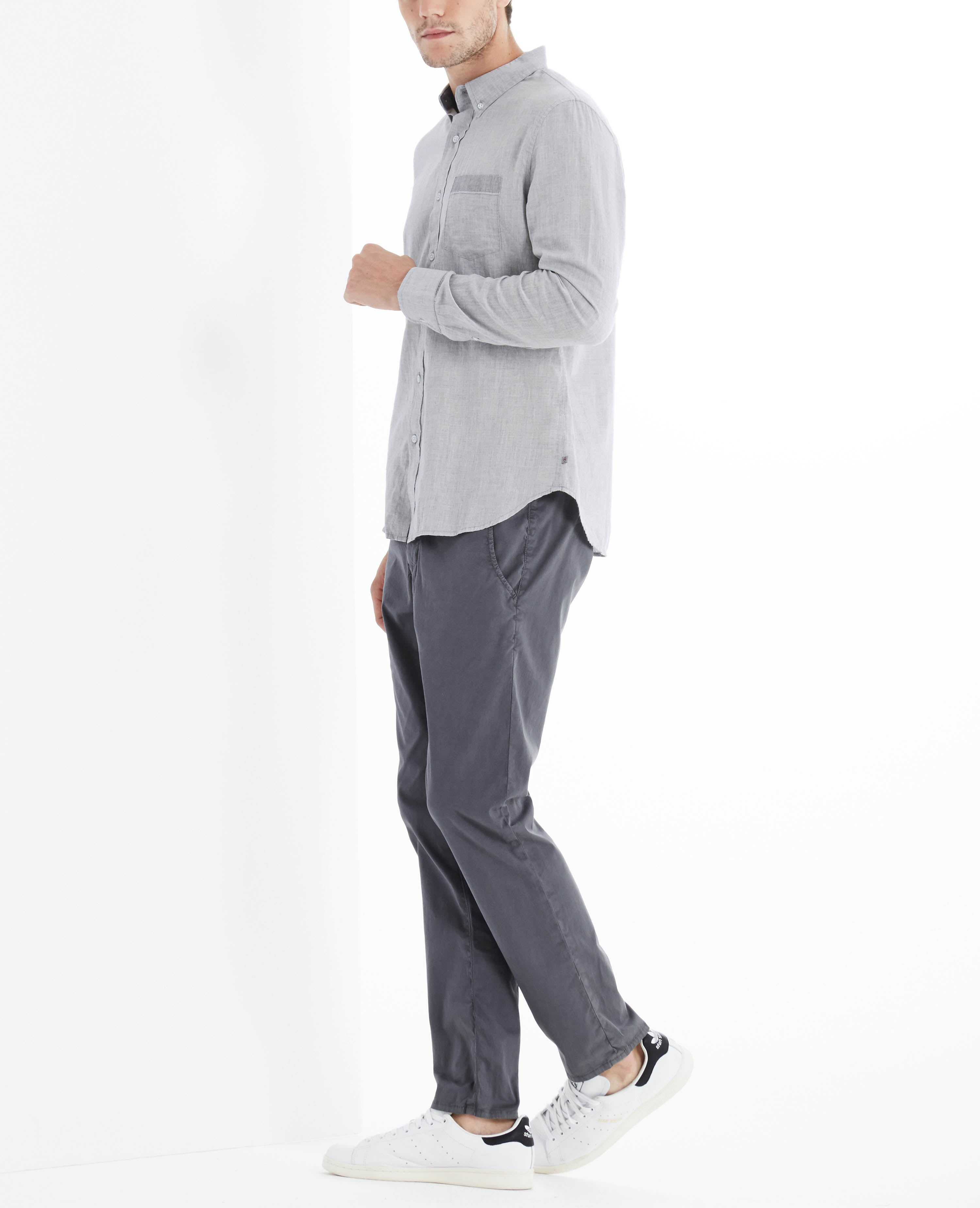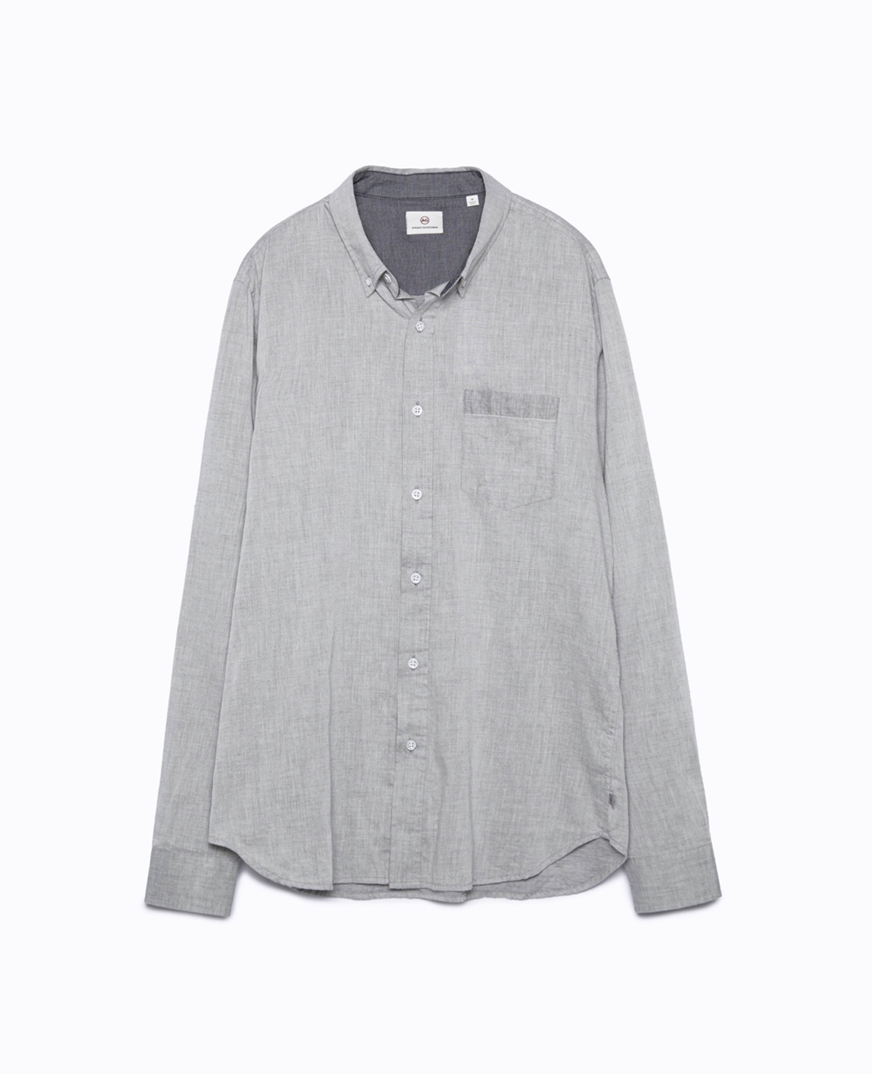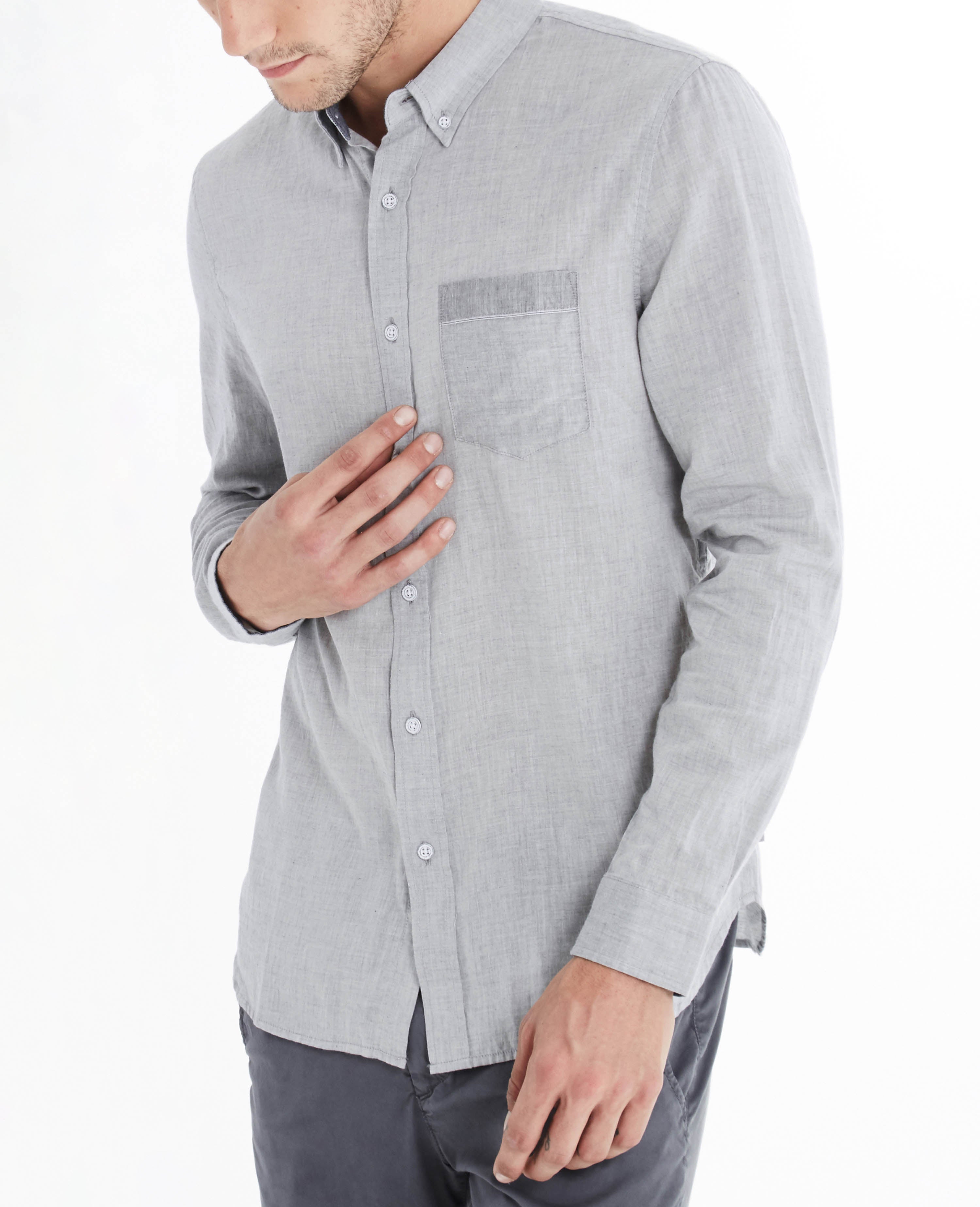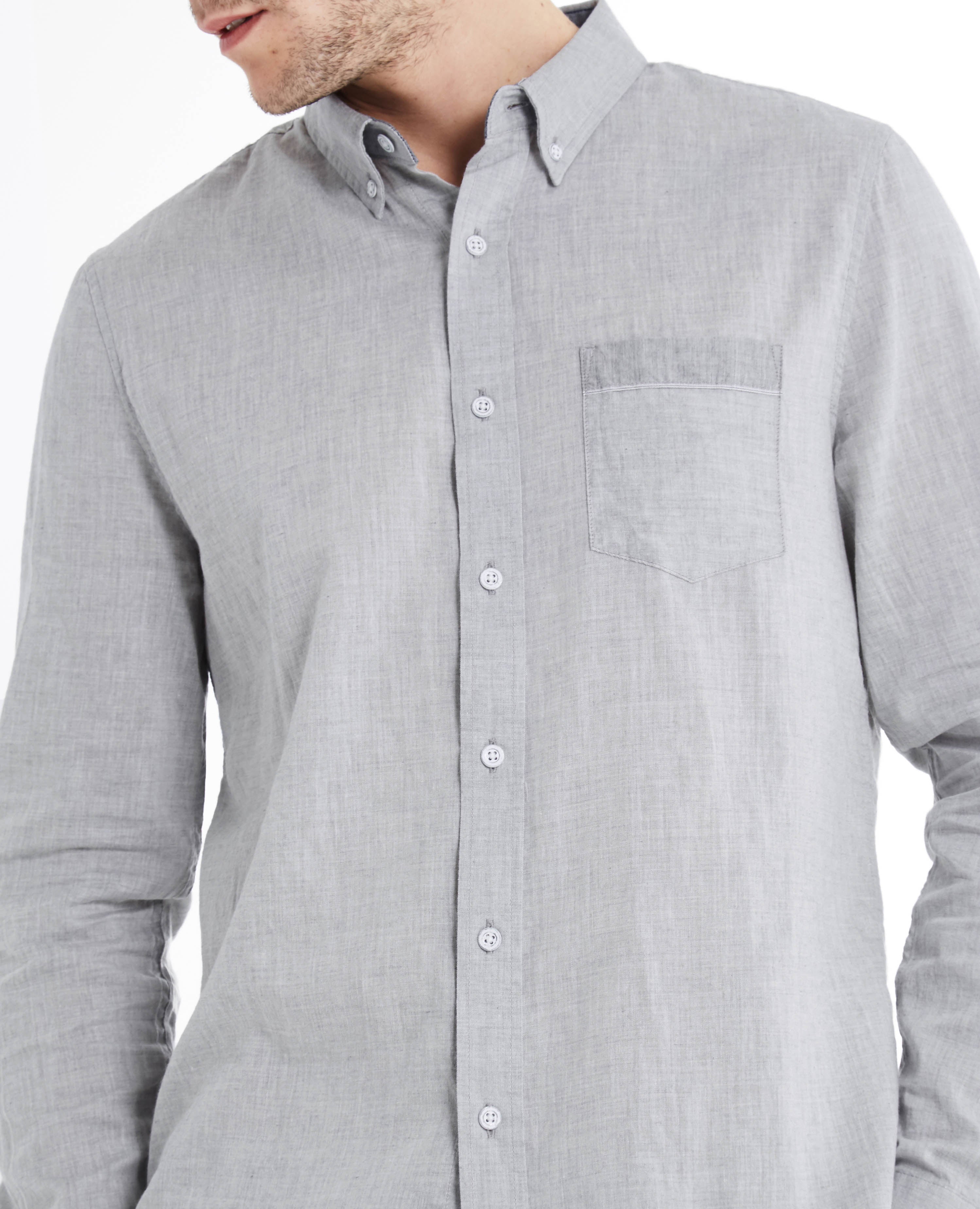 A heather-grey cotton weave with selvedge ticking brings a soft touch to a long-sleeve button-down shirt. Cut for a standard fit and detailed with a patch pocket at the chest. Contrast button closures. Barrel cuffs.