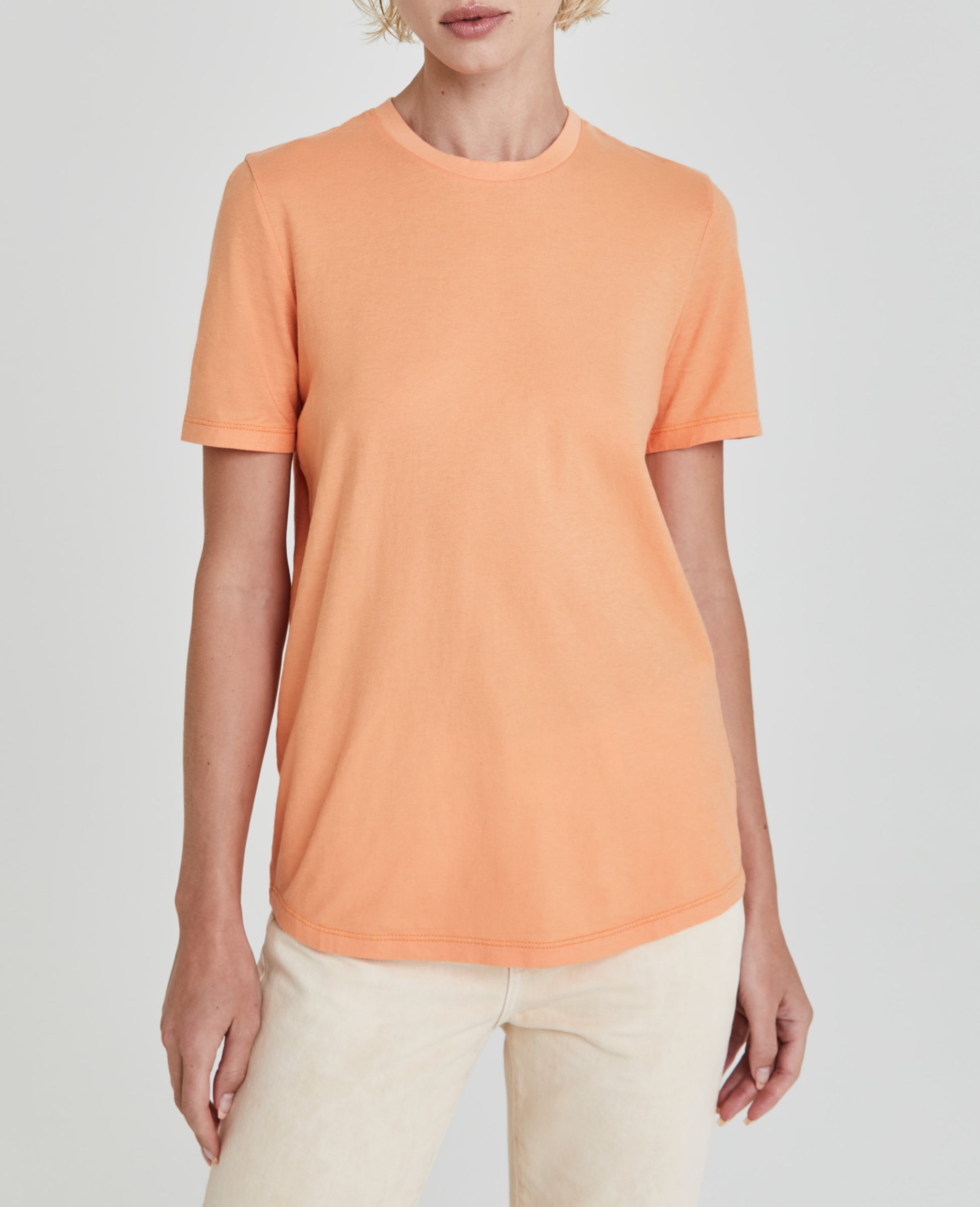 The Gray Boy Tee for women features a citrus hue and a classic crew neckline. This women's t-shirt is designed in a lightweight fabric made from 100% cotton fibers that are thoughtfully knitted to prevent torquing. This AG exclusive fabric offers a durable yet incredibly soft 40/1 knit that withstands everyday wear through the seasons.