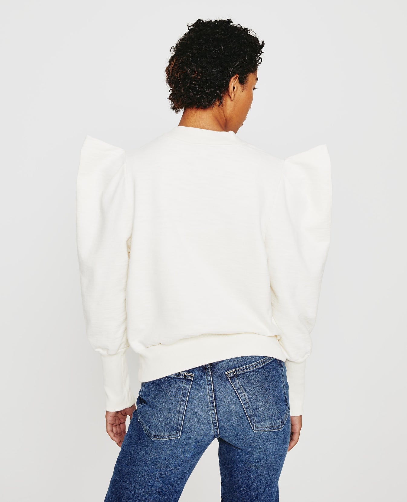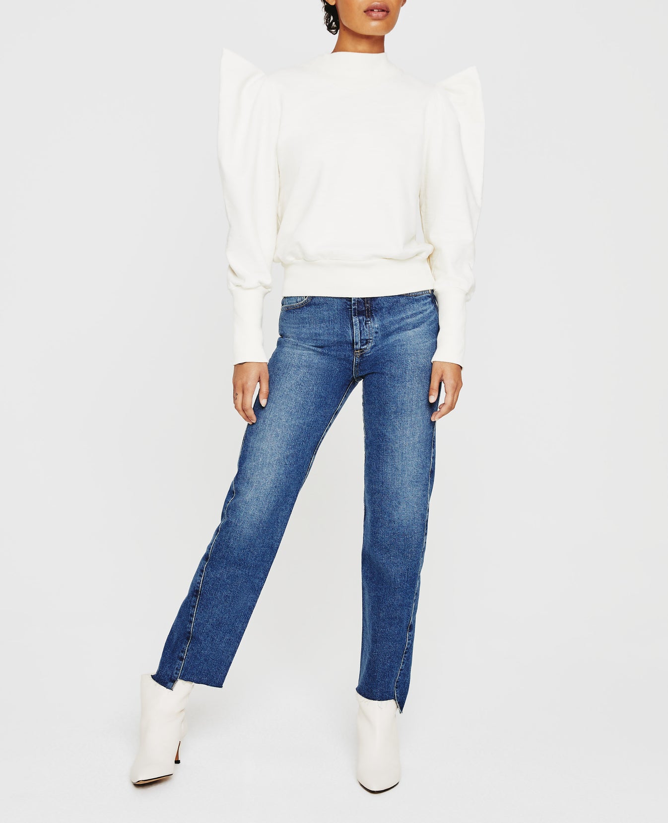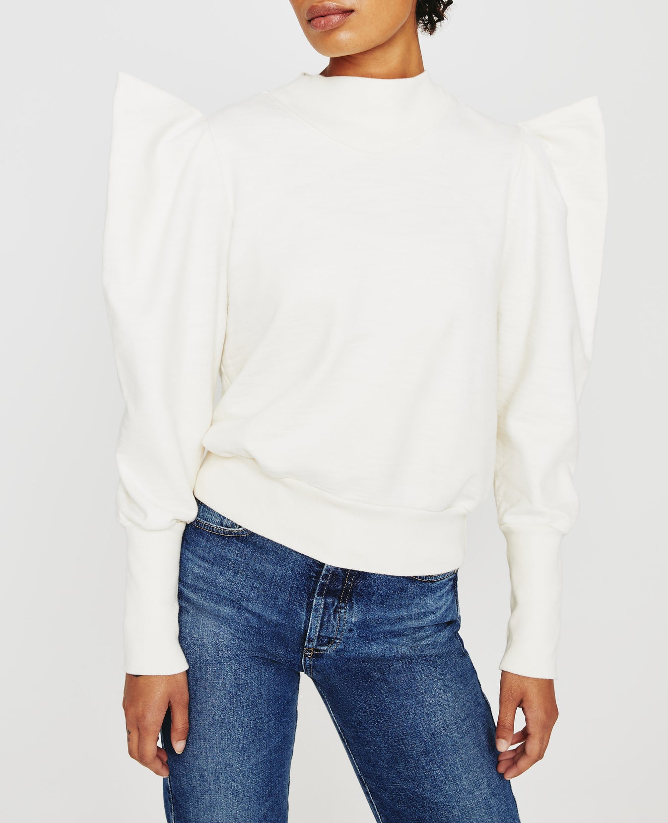The Grayson Sweatshirt is a dressed up version of the everyday essential. Made from incredibly soft Cotton Slub Loopback Terry in white, this style features a mock neck with angled V ribbing and puffed long sleeves with extended rib cuffs.