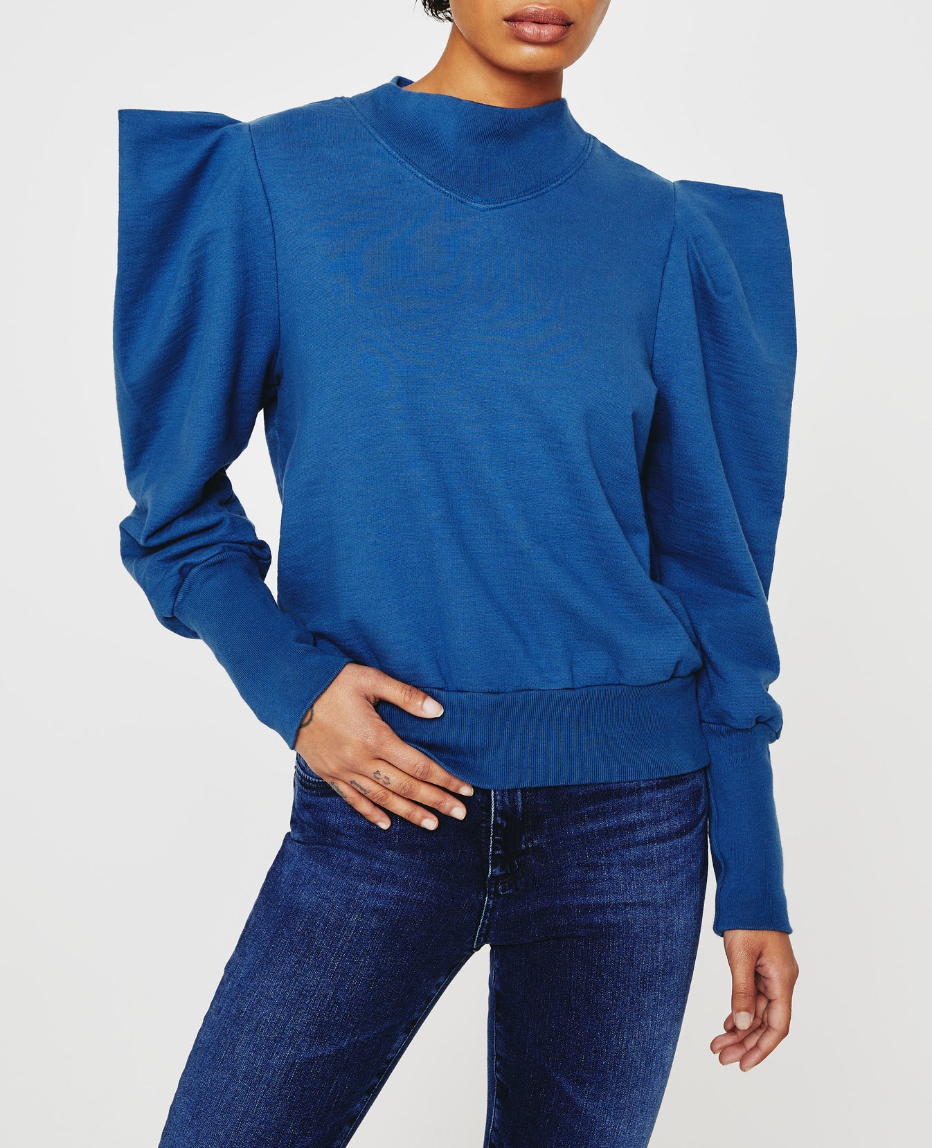 The Grayson Sweatshirt is a dressed up version of the everyday essential. Made from incredibly soft Cotton Slub Loopback Terry in a bold blue shade, this style features a mock neck with angled V ribbing and puffed long sleeves with extended rib cuffs.