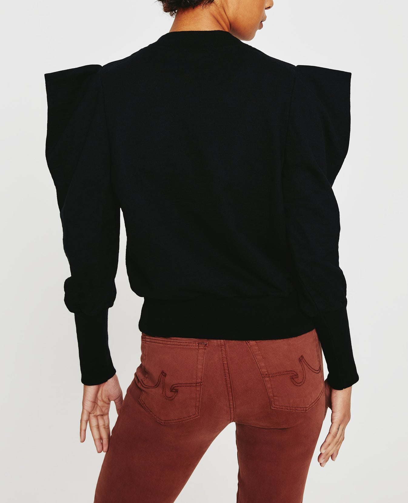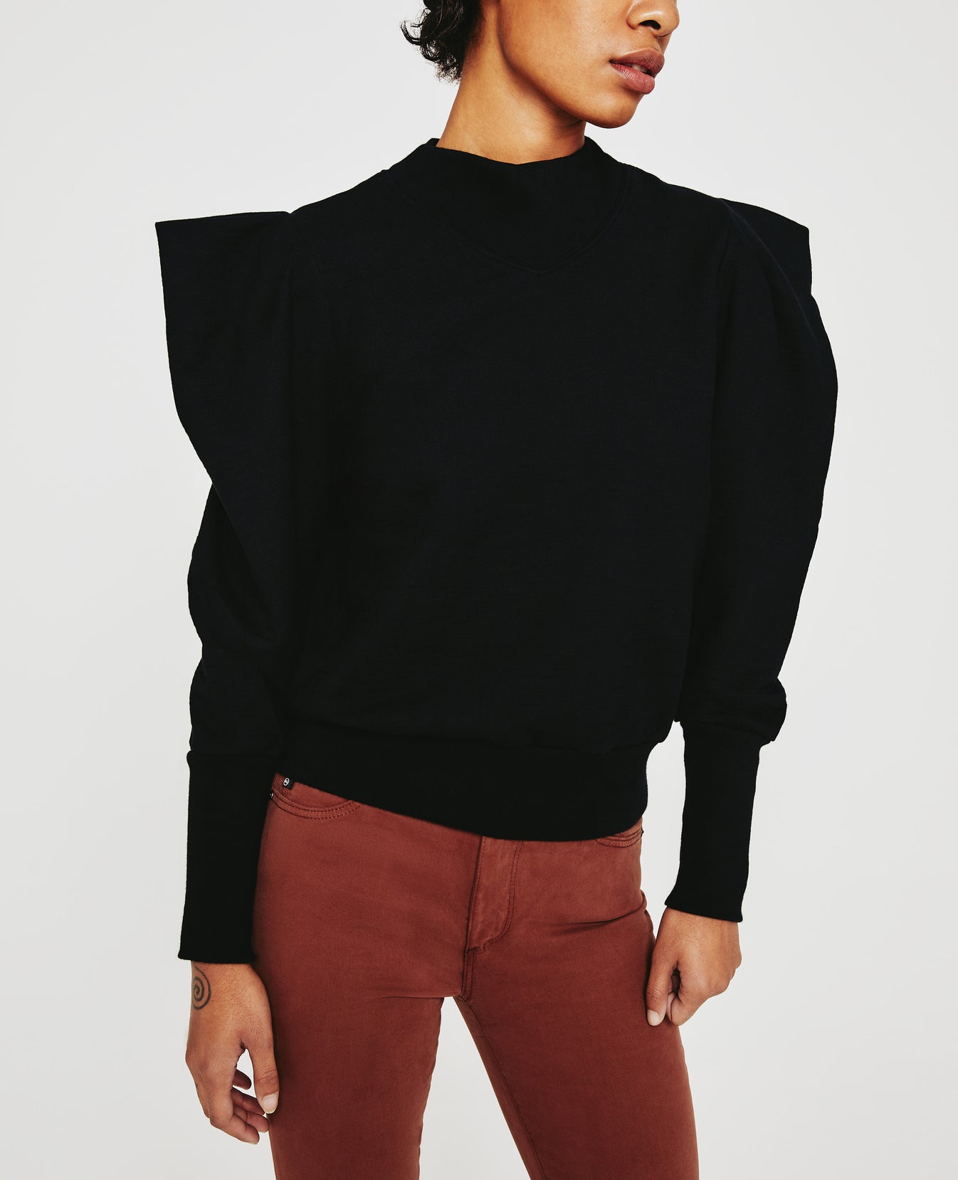The Grayson Sweatshirt is a dressed up version of the everyday essential. Made from incredibly soft Cotton Slub Loopback Terry in a classic black shade, this style features a mock neck with angled V ribbing and puffed long sleeves with extended rib cuffs.