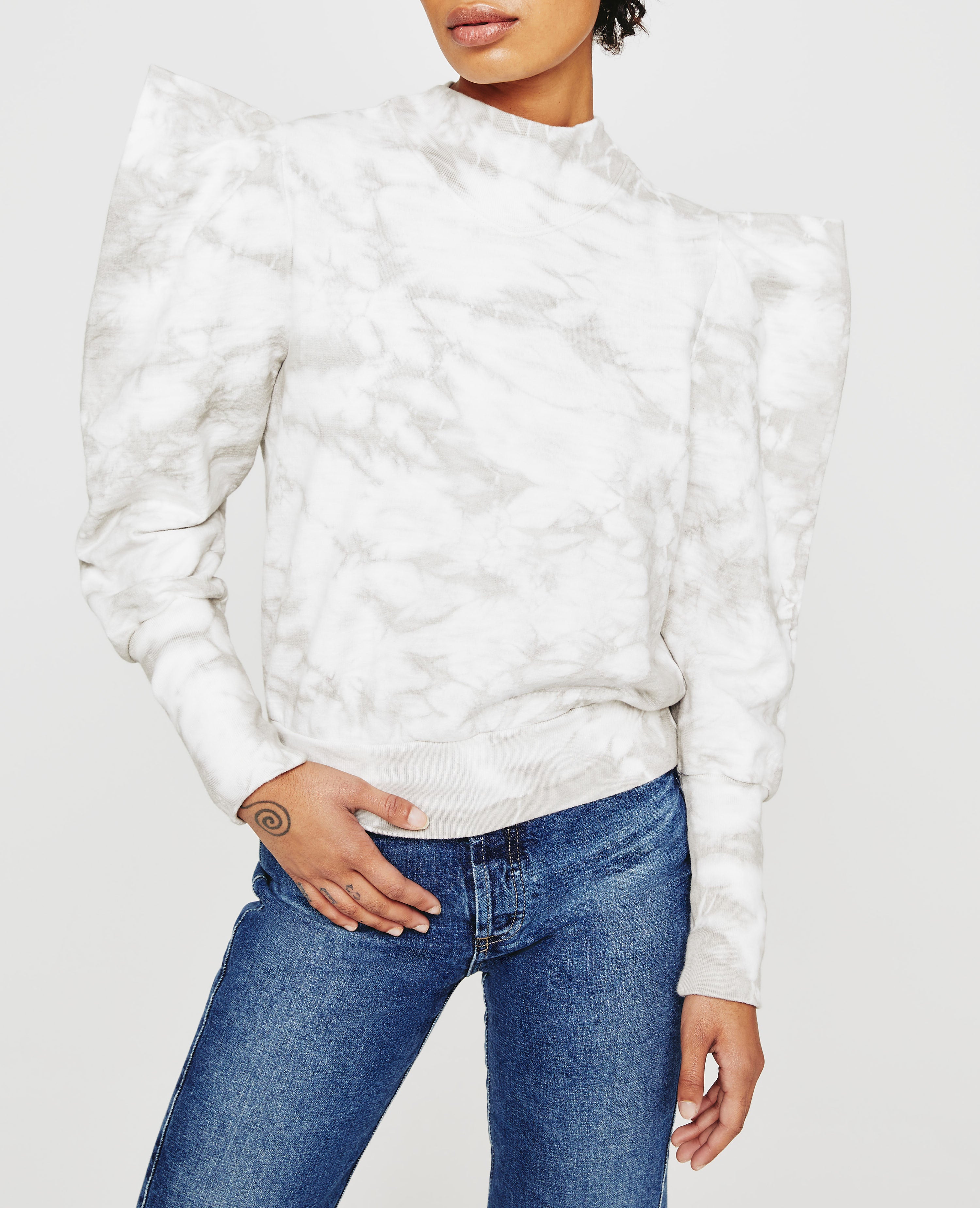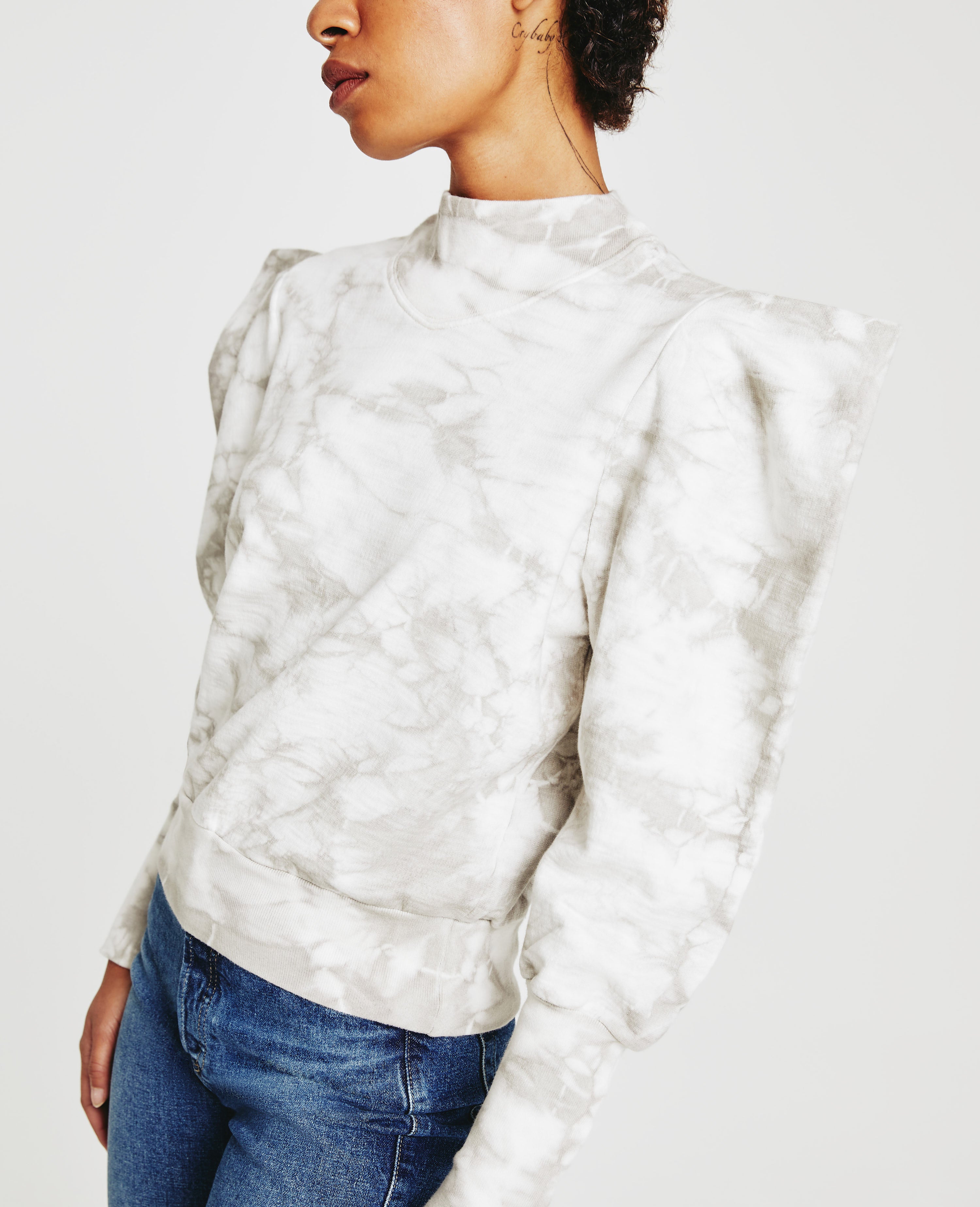 The Grayson Sweatshirt is a dressed up version of the everyday essential. Made from incredibly soft Cotton Slub Loopback Terry in gray and white tie-dye, this style features a mock neck with angled V ribbing and puffed long sleeves with extended rib cuffs.