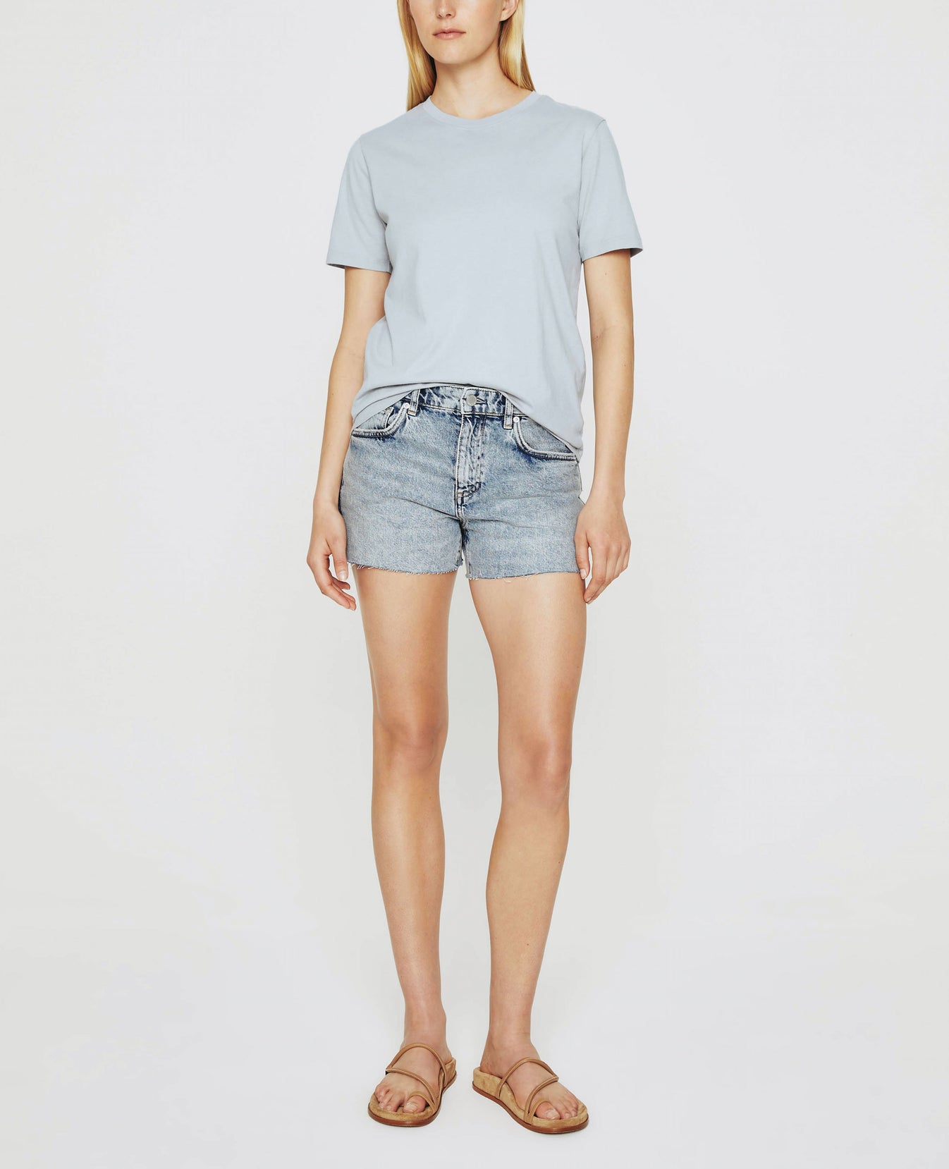 The Hailey Cut-Off Short is a five-pocket relaxed short in a light wash with worn edges and darker indigo left over at the seams. Hailey offers a flattering high-rise waist and relaxed silhouette. This women’s jean short is designed in 12 oz. 3/1 Recycled Denim, a 3x1 right-hand twill. It's made from 100% cotton and has 60% recycled cotton fibers woven in, reducing landfill waste.