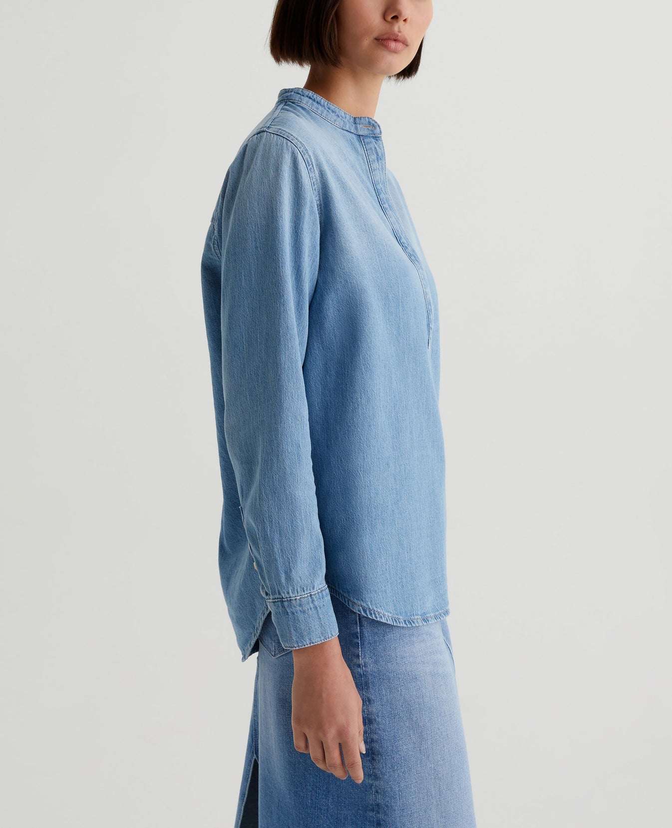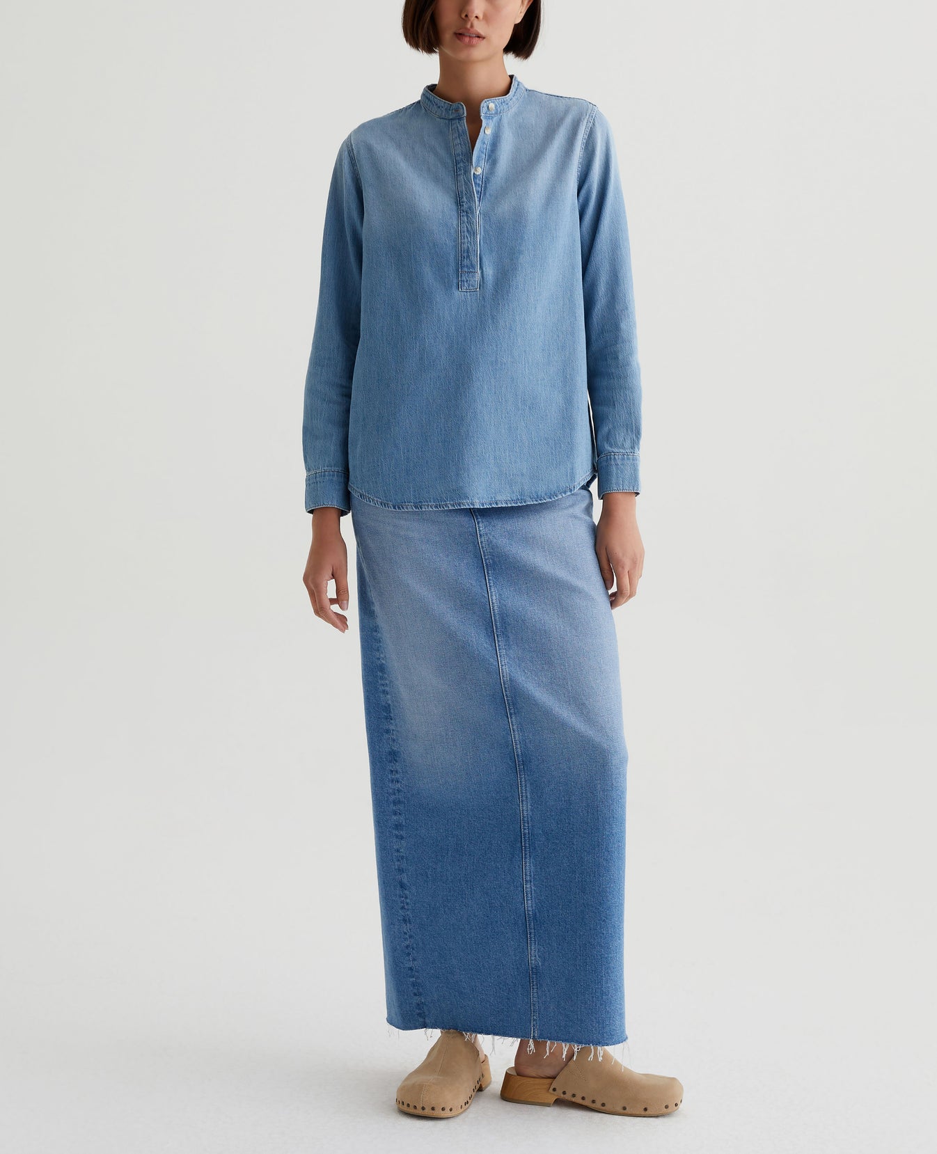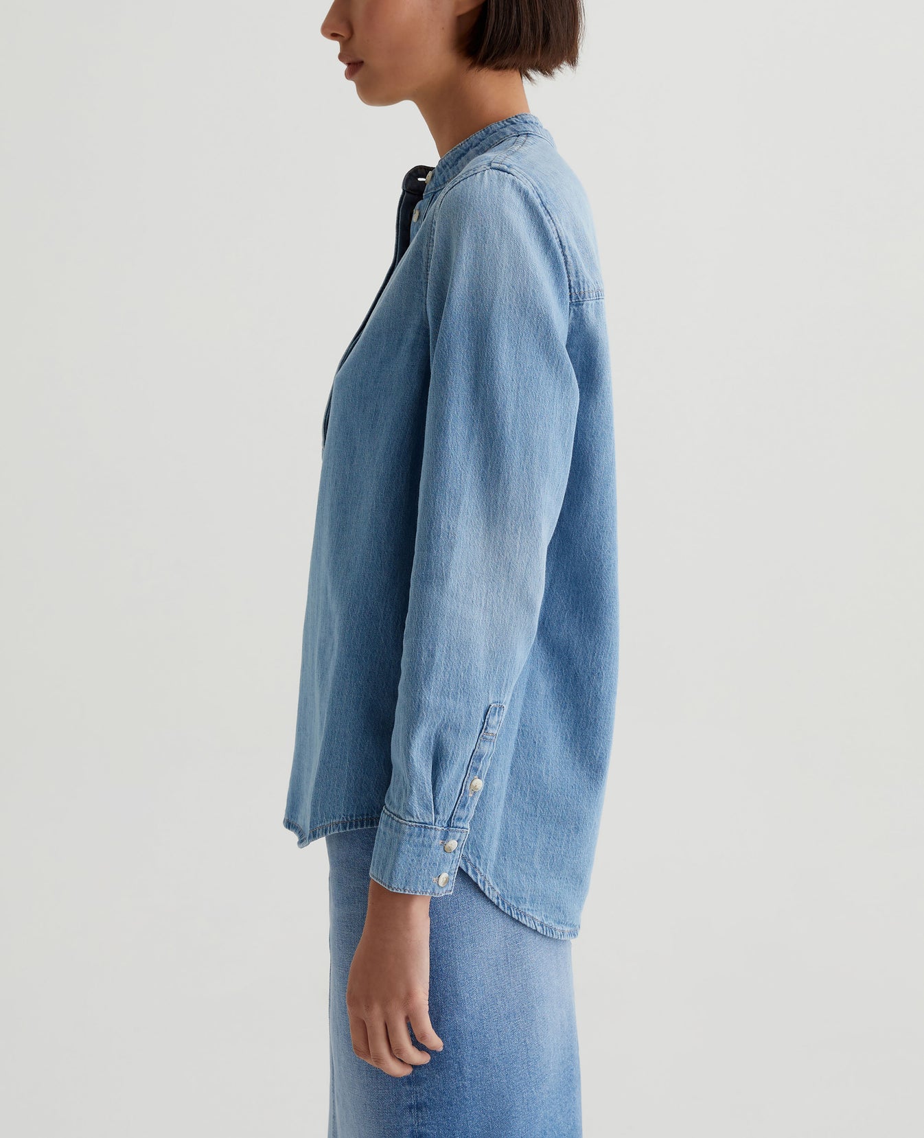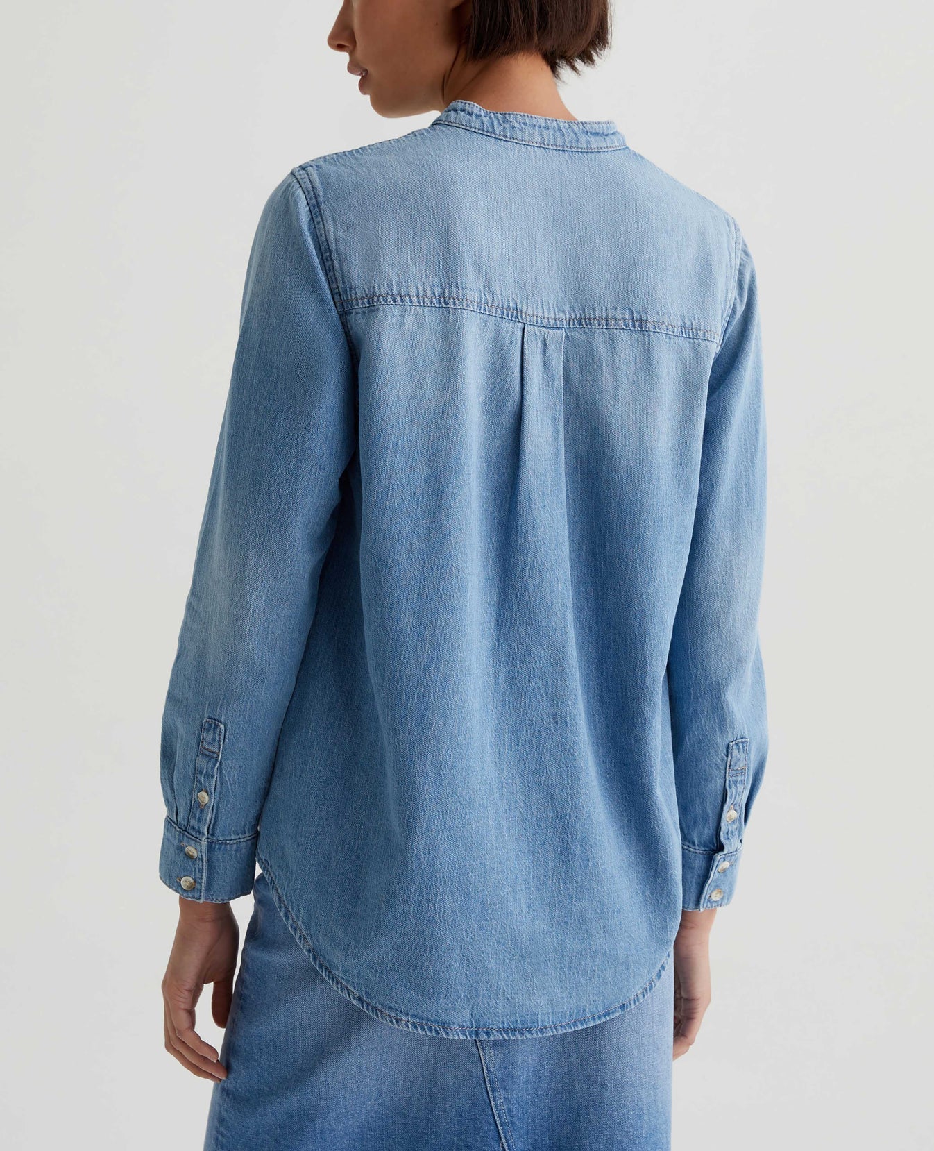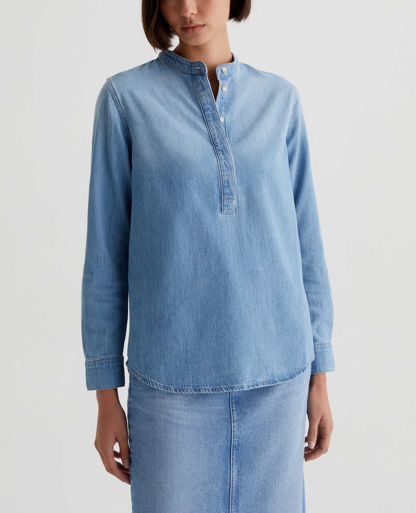 The Helen chambray shirt is crafted from 100% cotton in a light blue wash with faded details. It's cut for a relaxed fit with long sleeves and a half placket.