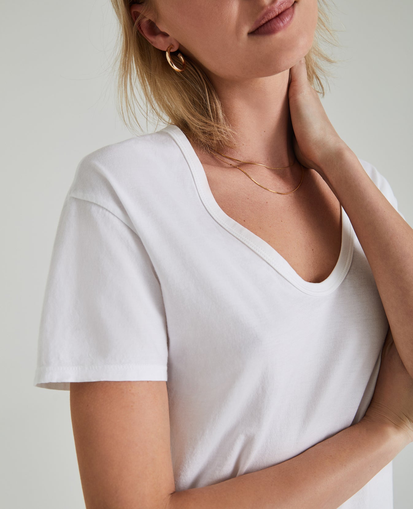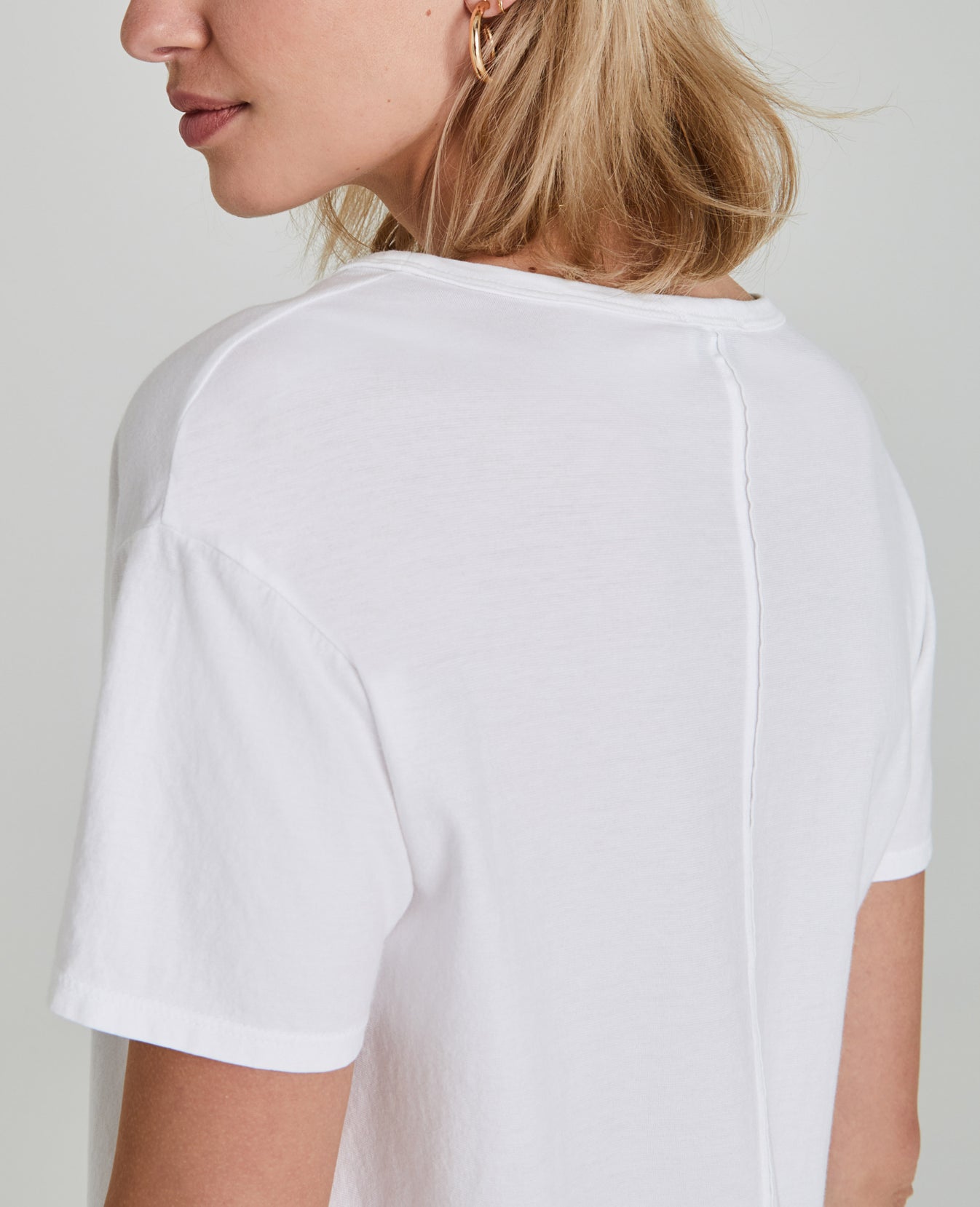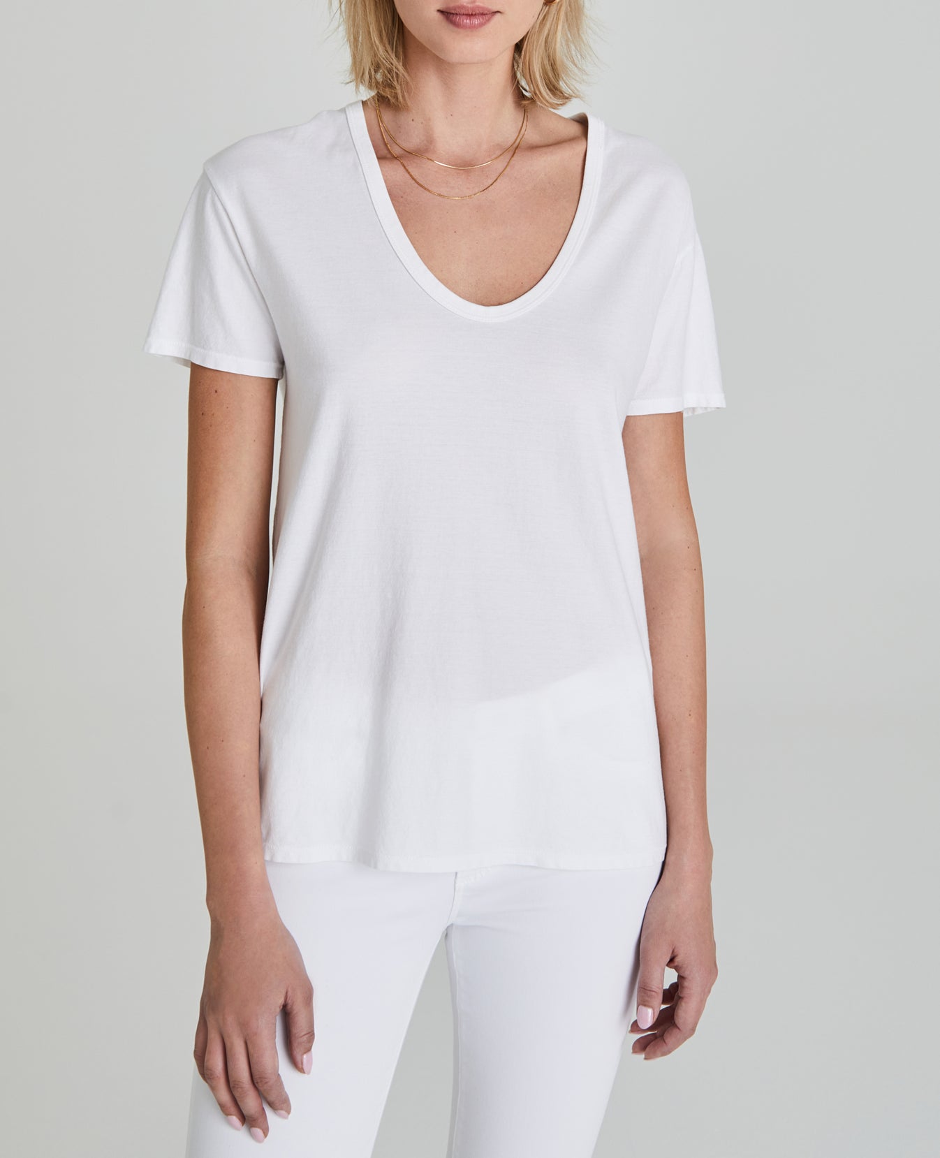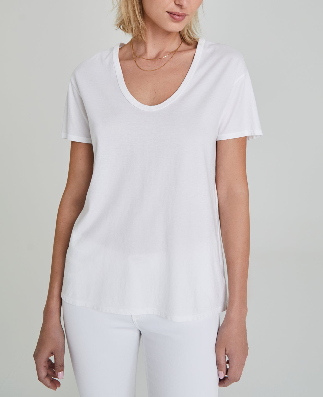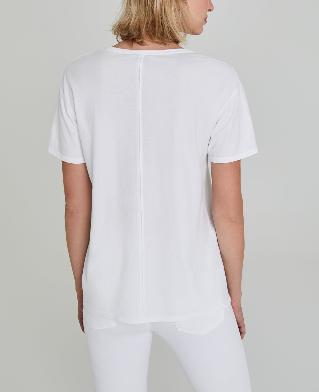 The Henson Tee for women features a crisp white hue, double-tuck seam detailing at the back, and a beautifully draped V neckline. This women’s t-shirt is designed in a lightweight fabric made from 100% cotton fibers that are thoughtfully knitted to prevent torqueing. This AG exclusive fabric offers a durable yet incredibly soft 40/1 knit that withstands everyday wear through the seasons.