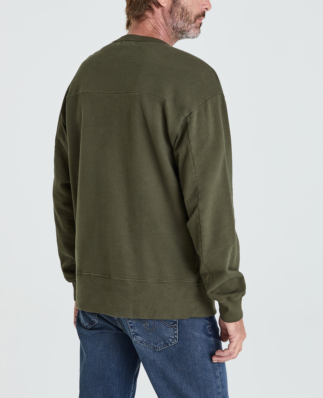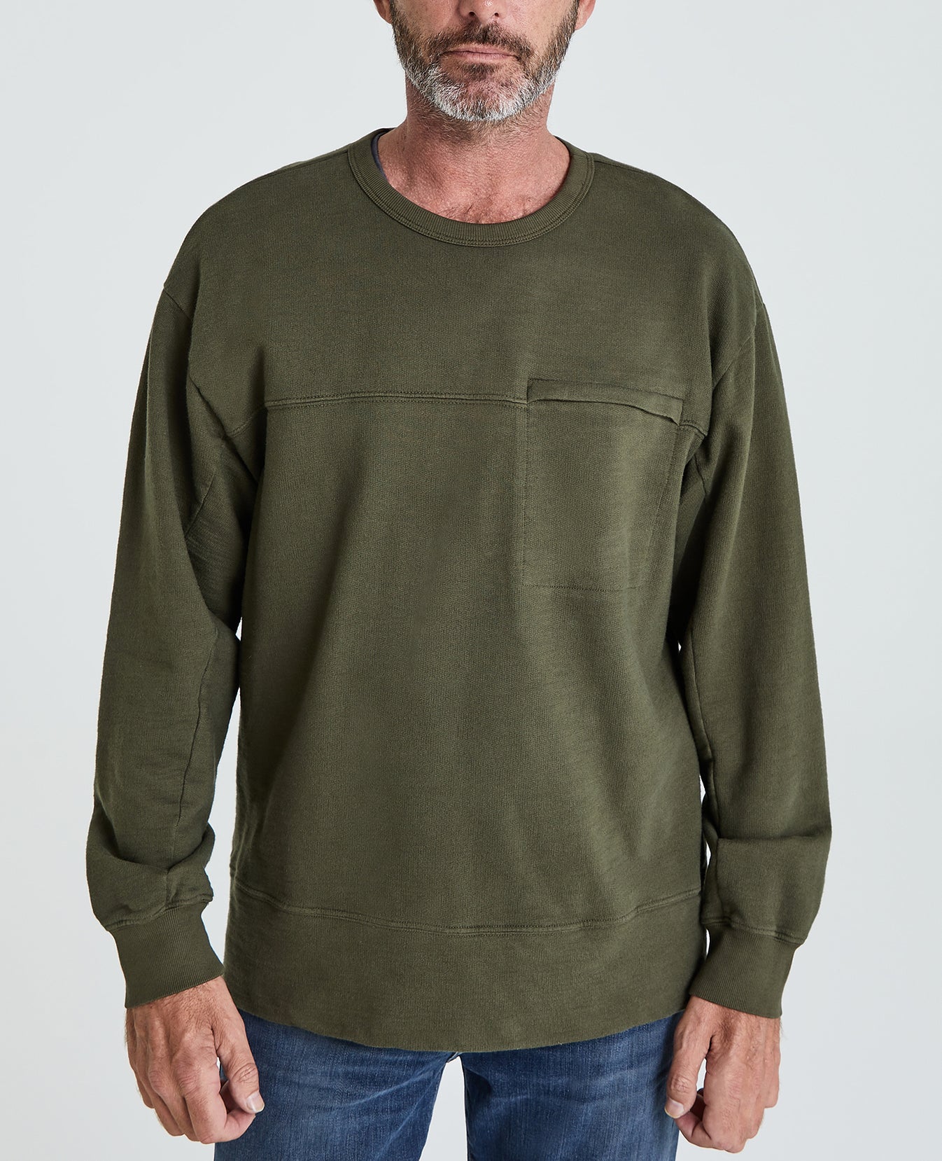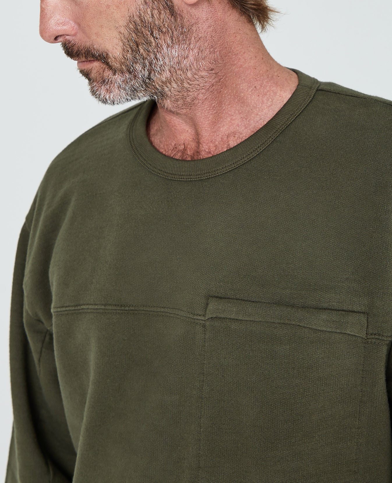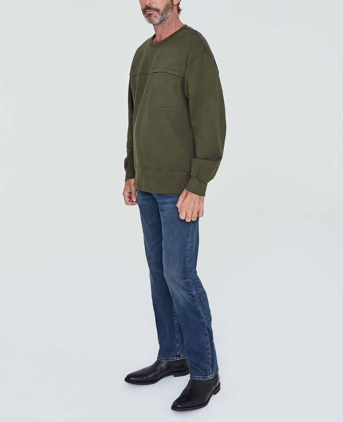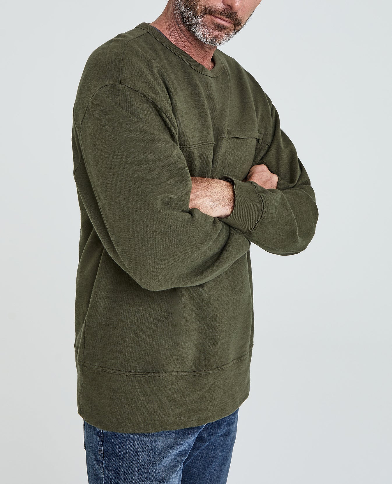 Jace Pocket Crew for men features a lake moss green dye and is cut in a modern silhouette with contemporary crew neckline, drop shoulders, relaxed fit, chest seam, and single pocket at wearer's left. This men's pullover is designed in an exclusive AG-made terry featuring a lightweight feel, ultra soft touch, and a color-rich finish.