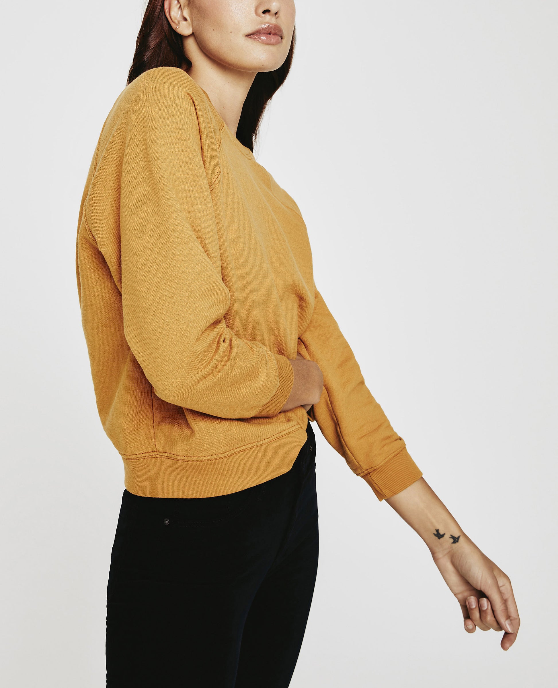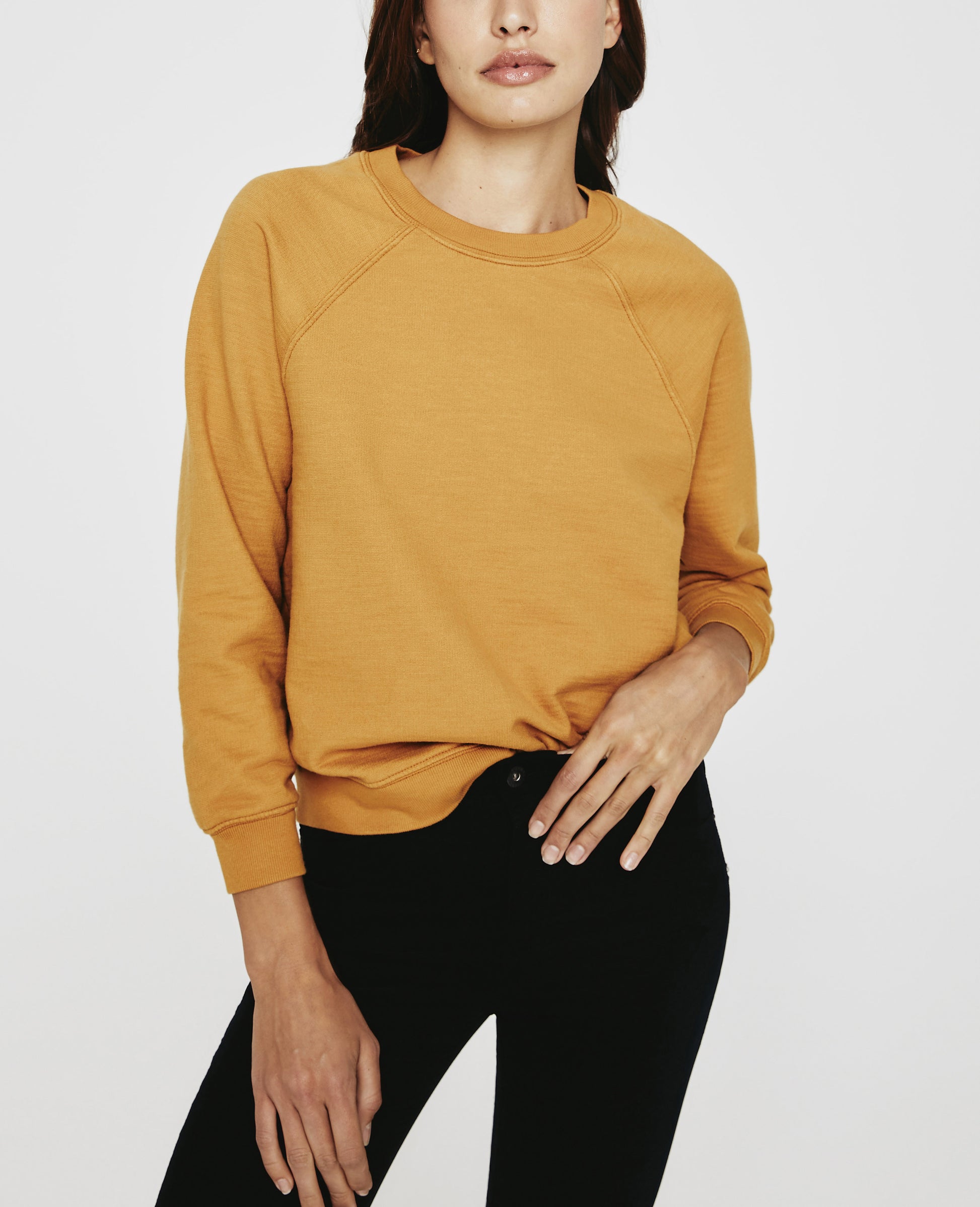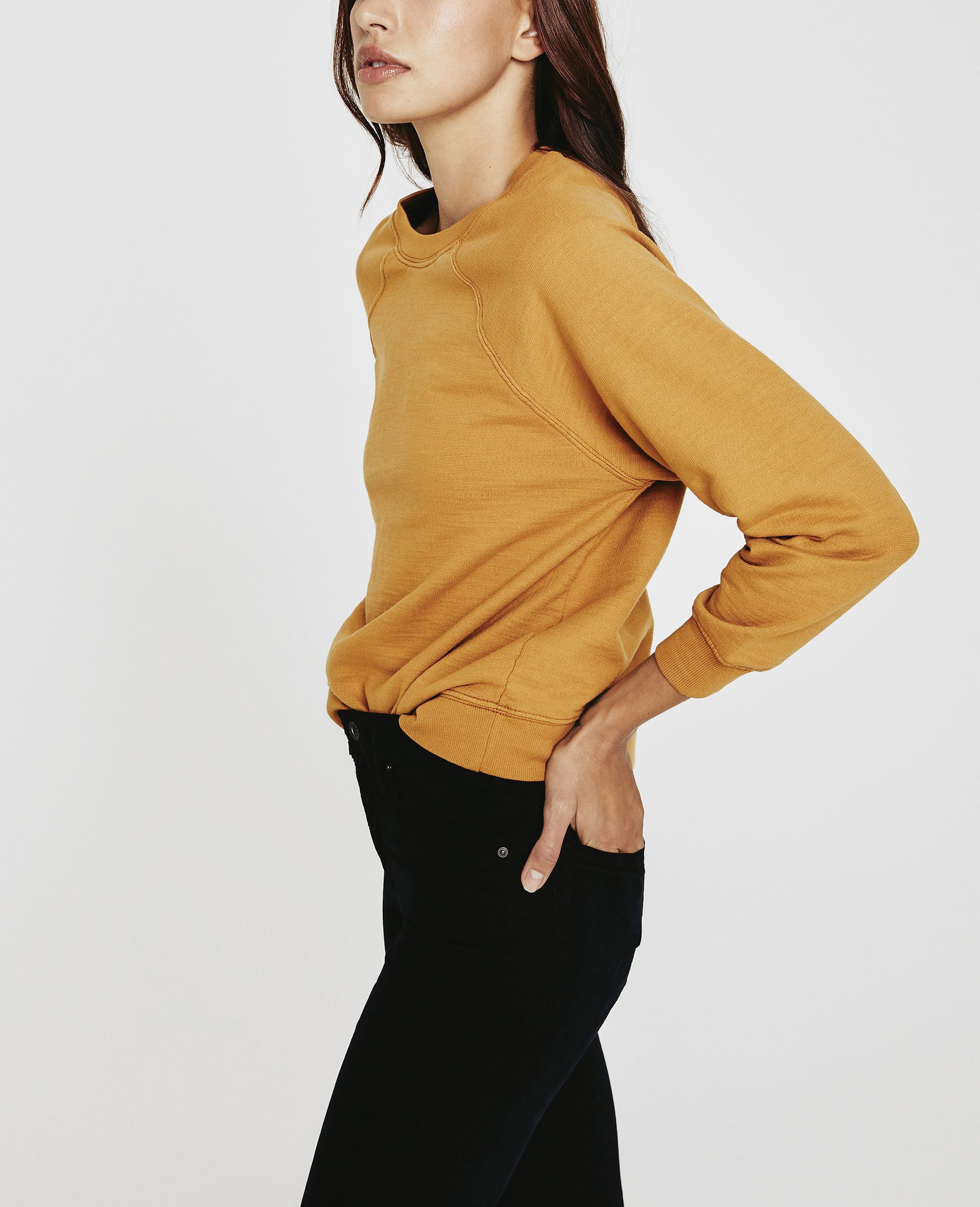 The Jadyn Sweatshirt for women features a saturated yellow hue, classic crew neckline, and relaxed silhouette. Retro-finished with raglan sleeves, ribbed waist, and shrunken sleeves finished with elastic rib cuffs. This women’s pullover is designed in an exclusive AG-made terry featuring a lightweight feel, ultra-soft touch, and a color-rich finish.