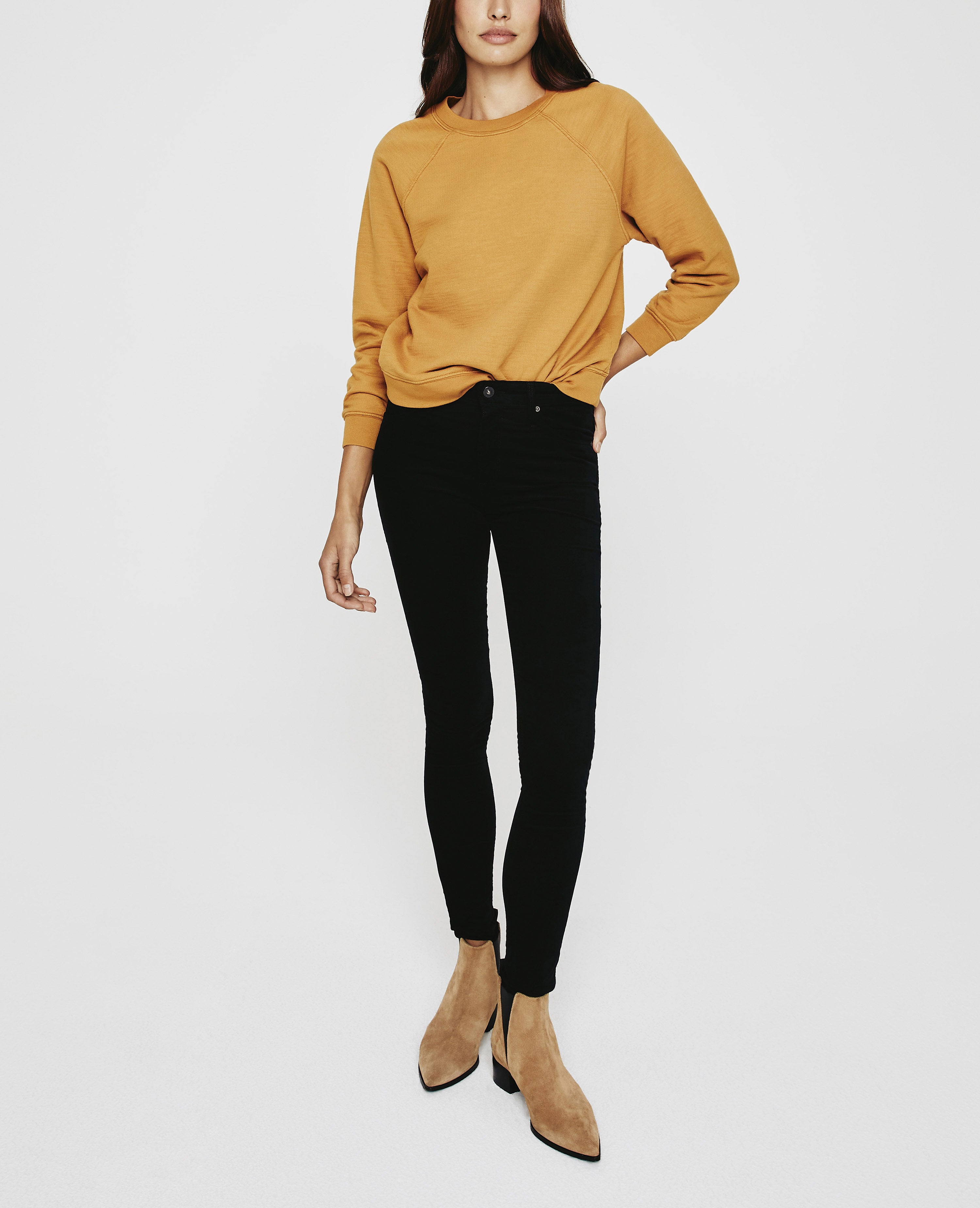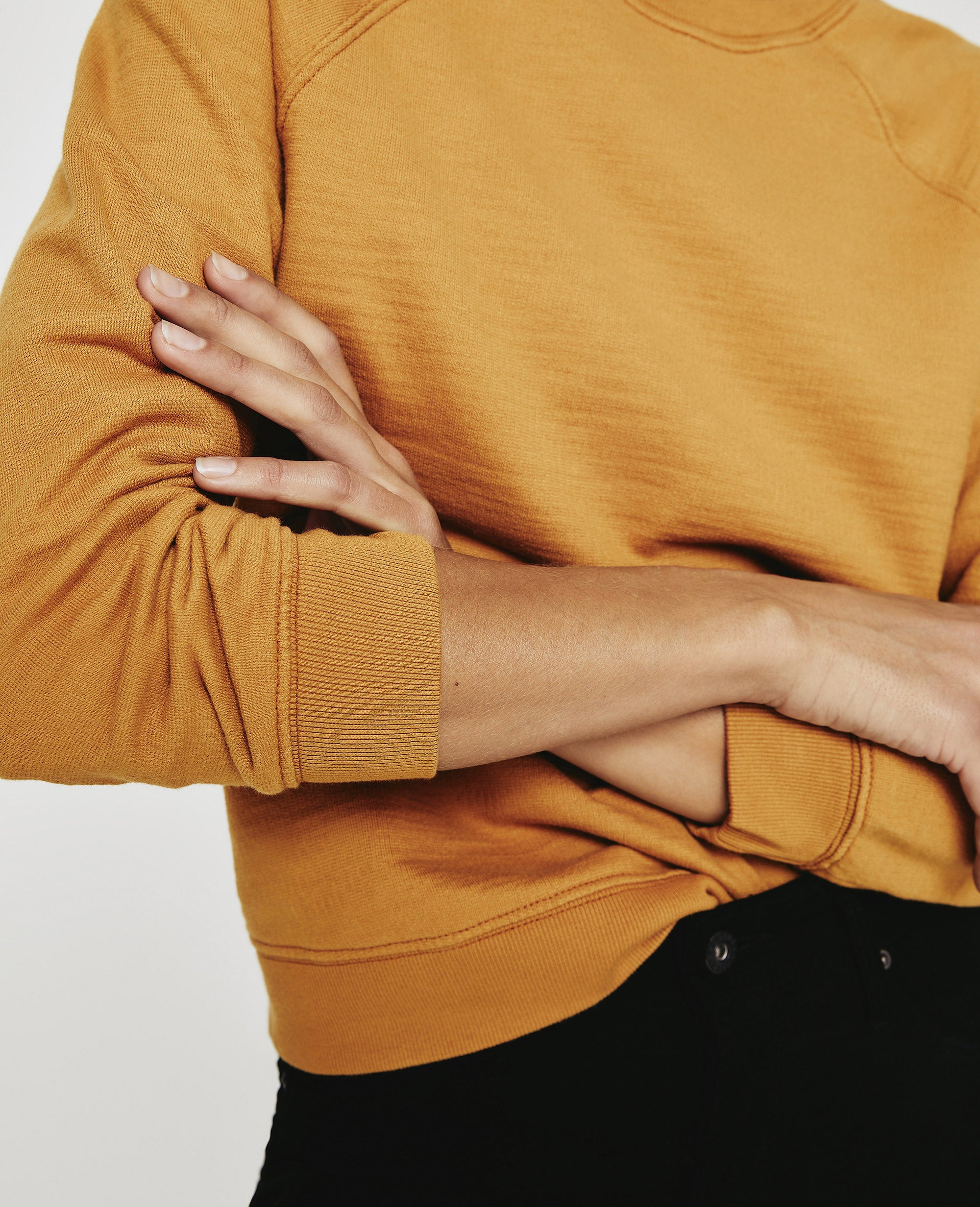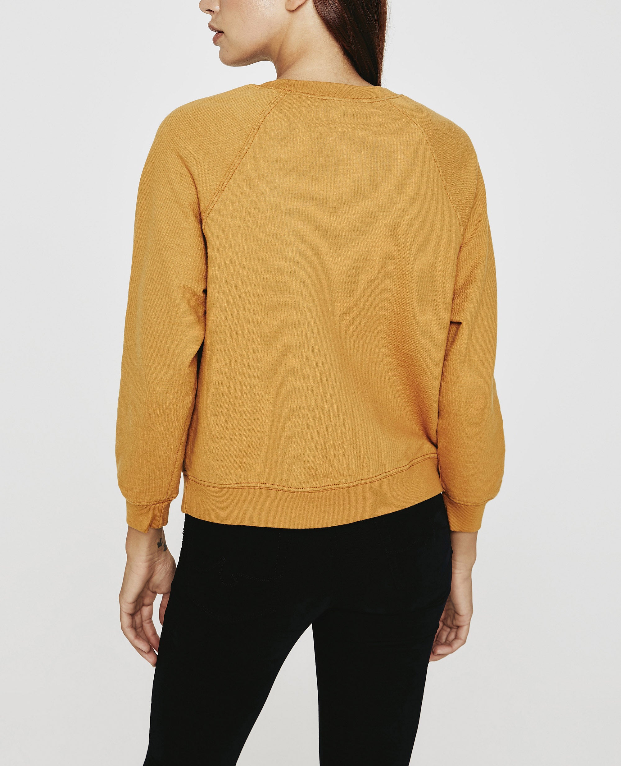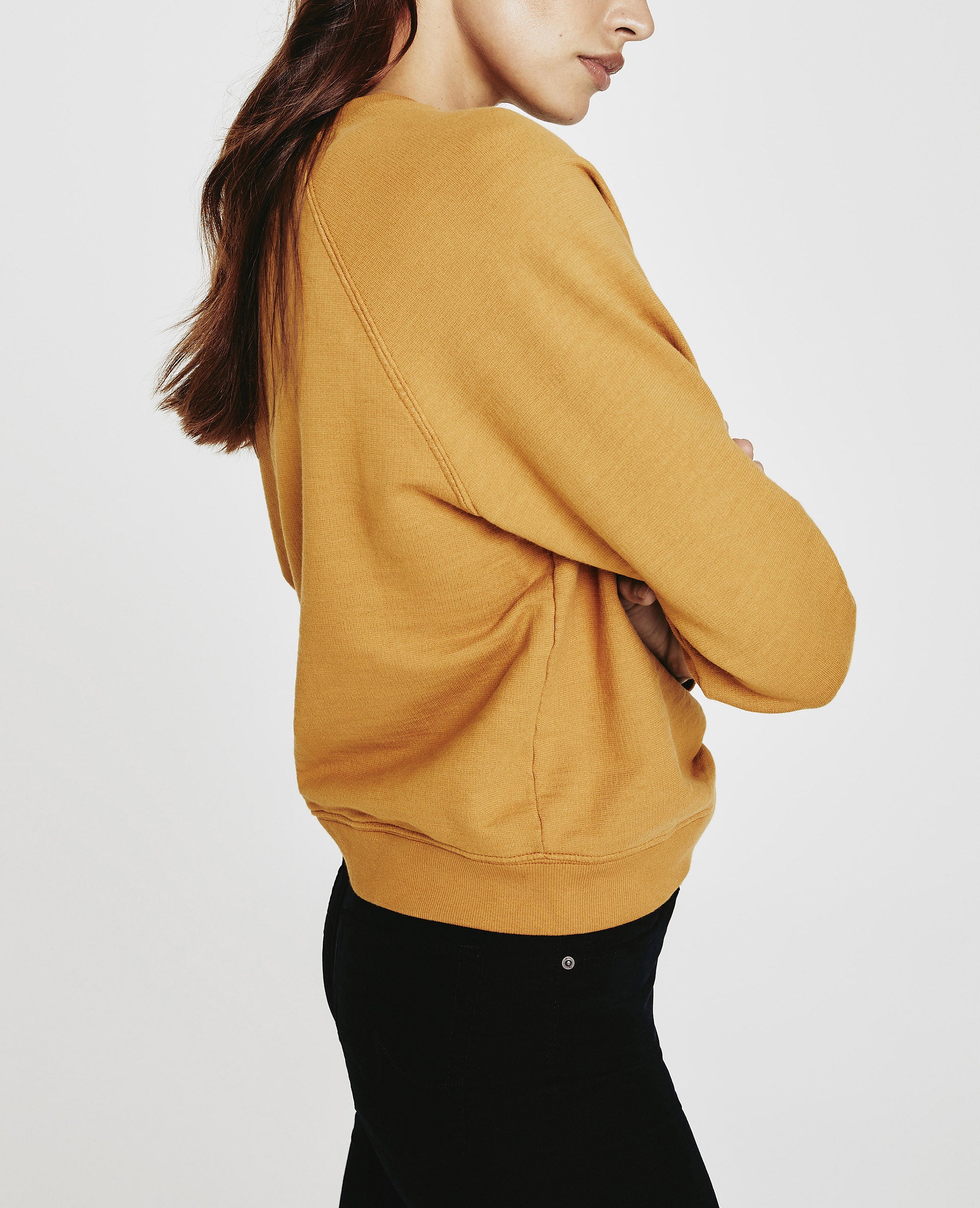 The Jadyn Sweatshirt for women features a saturated yellow hue, classic crew neckline, and relaxed silhouette. Retro-finished with raglan sleeves, ribbed waist, and shrunken sleeves finished with elastic rib cuffs. This women’s pullover is designed in an exclusive AG-made terry featuring a lightweight feel, ultra-soft touch, and a color-rich finish.